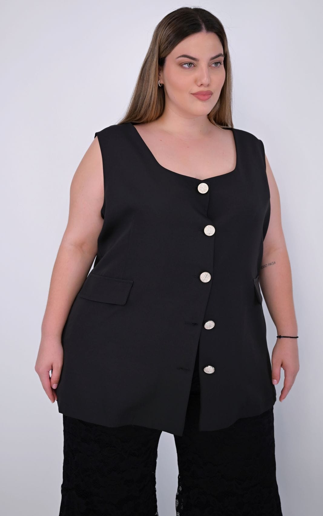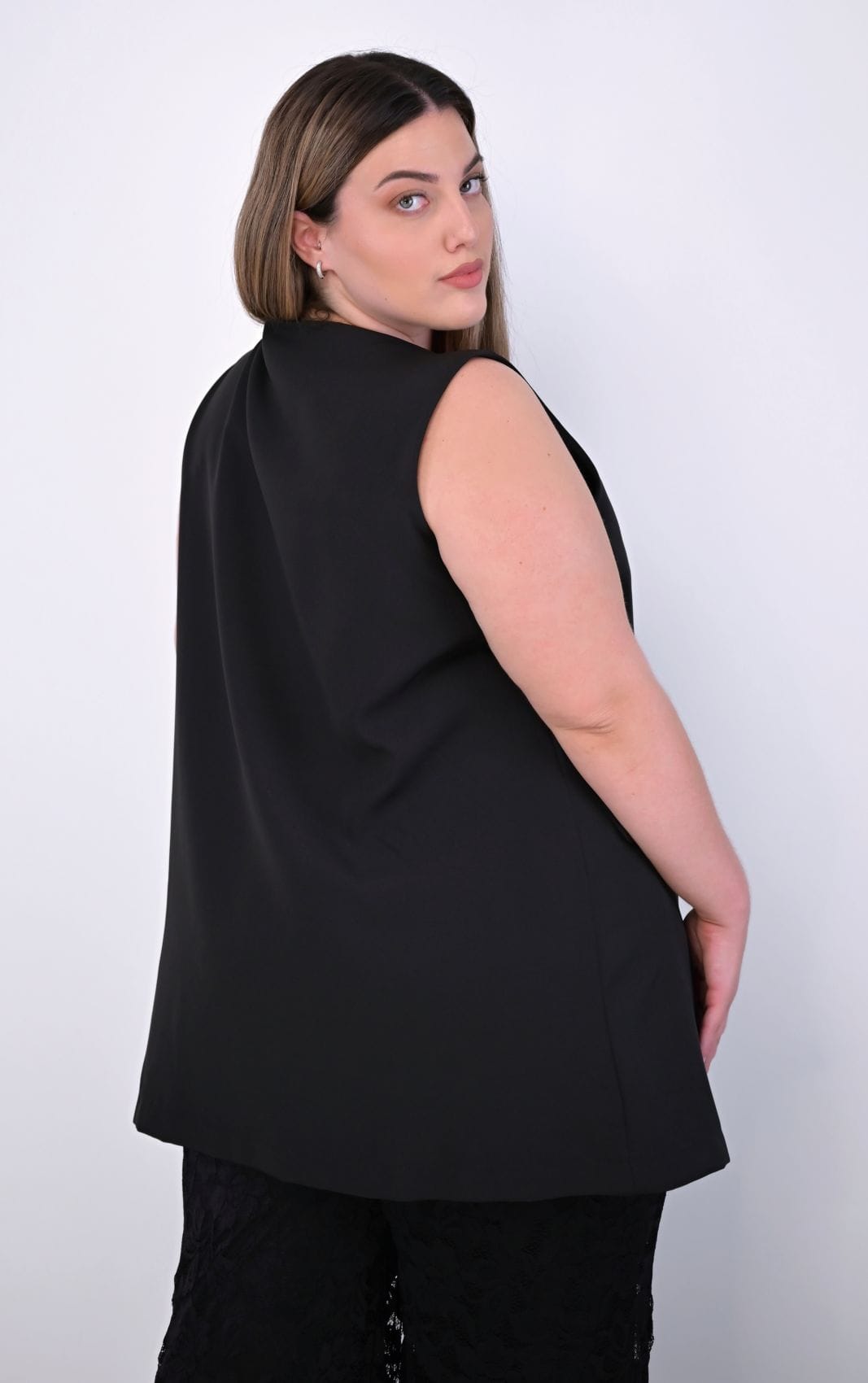 Αυτό το plus size μαύρο αμάνικο σακάκι είναι το απόλυτο διαχρονικό κομμάτι που θα αναβαθμίσει αμέσως κάθε σας σύνολο. Είναι η τέλεια λύση για να προσθέσετε μια δόση μοντέρνου, προσεγμένου στυλ, διατηρώντας ταυτόχρονα μια αίσθηση άνεσης και ελευθερίας.