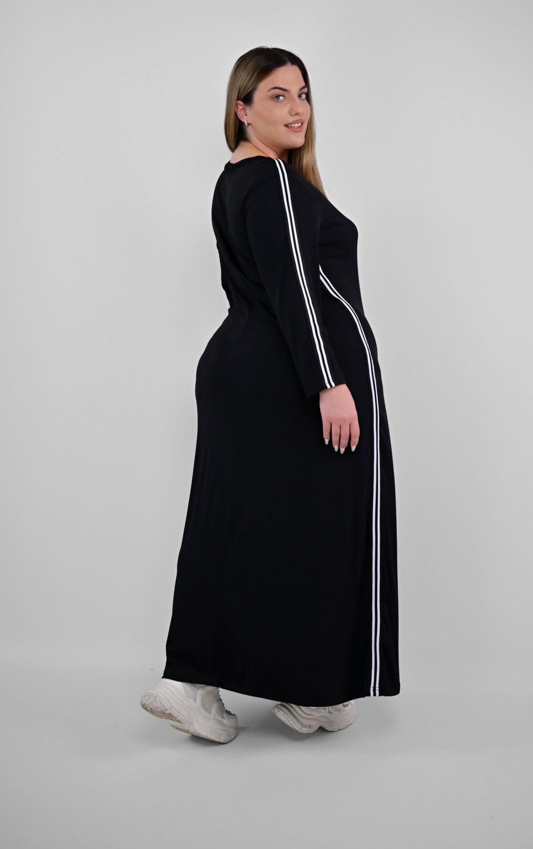 Το μαύρο χρώμα του φορέματος συνδυάζεται με διπλή λευκή ρίγα που ξεκινά από τον ώμο και κατεβαίνει κατά μήκος του μανικιού και των πλαϊνών, δημιουργώντας μια δυναμική αθλητική γραμμή που αναδεικνύει το σχέδιο.