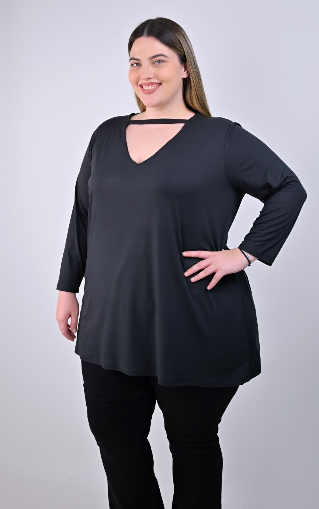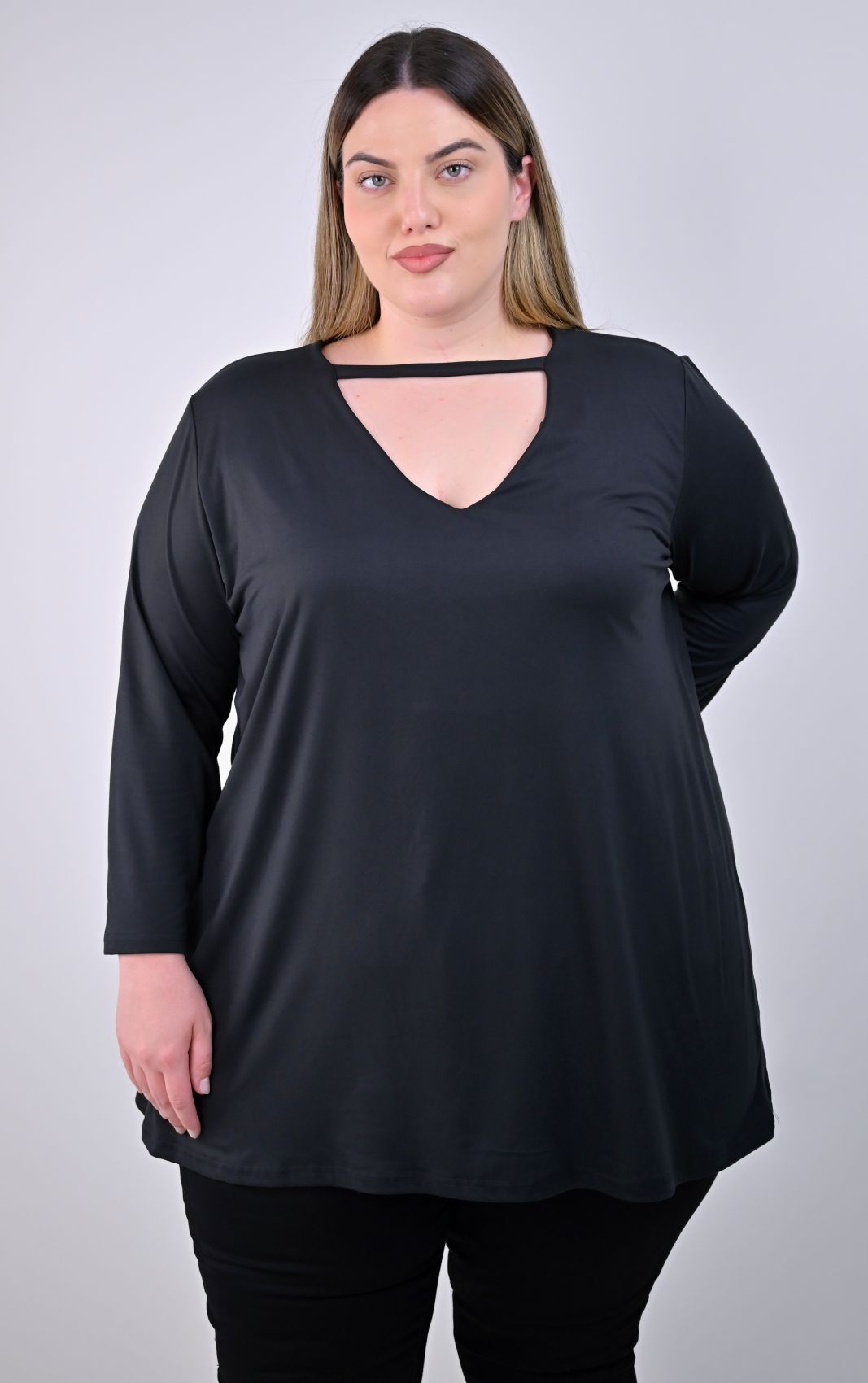 Απογειώστε το στυλ σας με μια μοντέρνα πινελιά. Αυτό το plus size μαύρο μπλουζοφόρεμα είναι το κομμάτι που συνδυάζει την άνεση μιας μπλούζας με το στυλ ενός φορέματος. Το ιδιαίτερο άνοιγμα (cutout) στο ντεκολτέ δημιουργεί ένα δυναμικό και σύγχρονο look, ιδανικό για εμφανίσεις που ξεχωρίζουν από το πρωί ως το βράδυ.