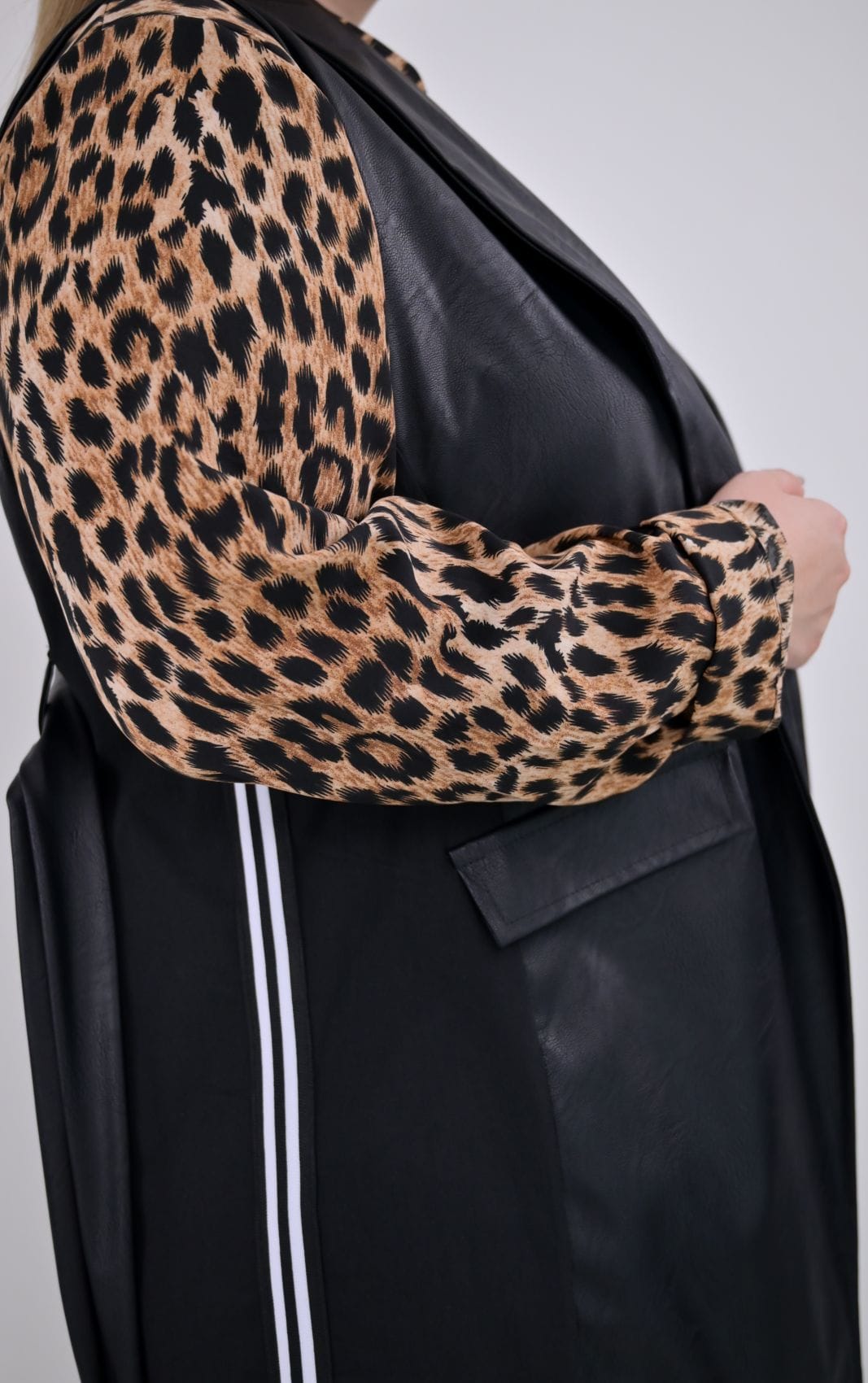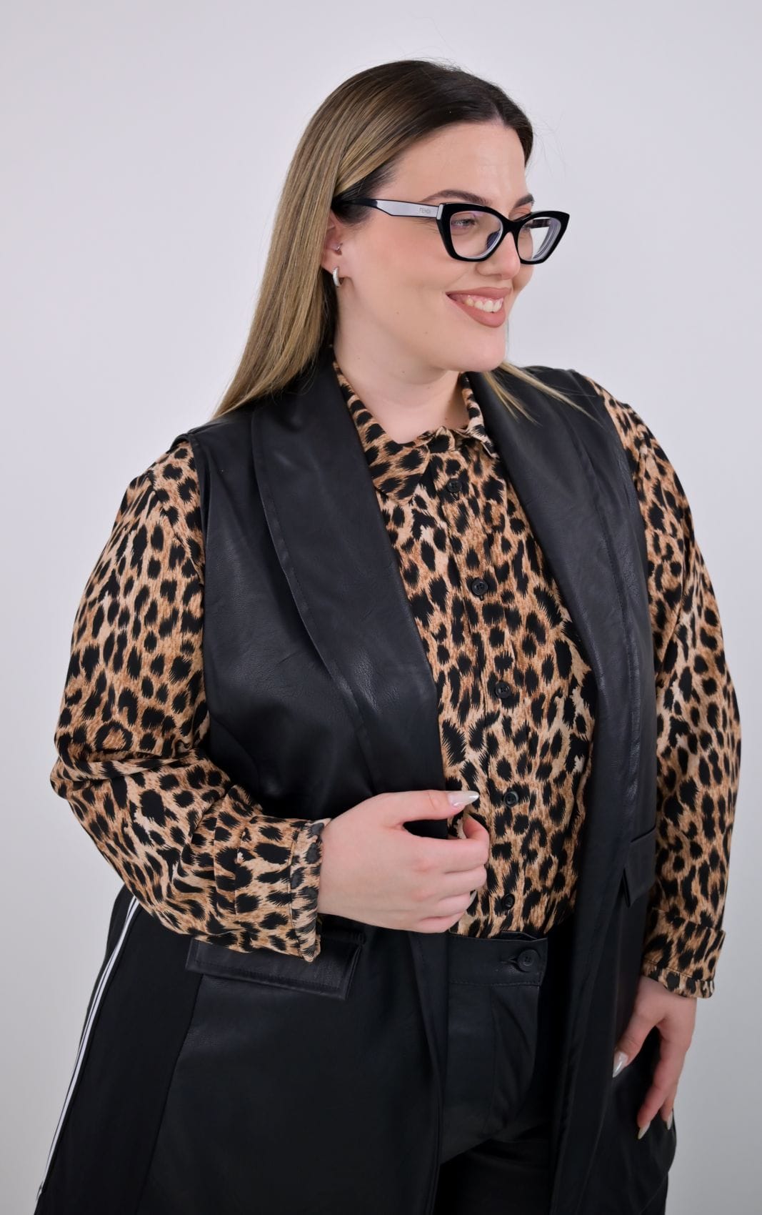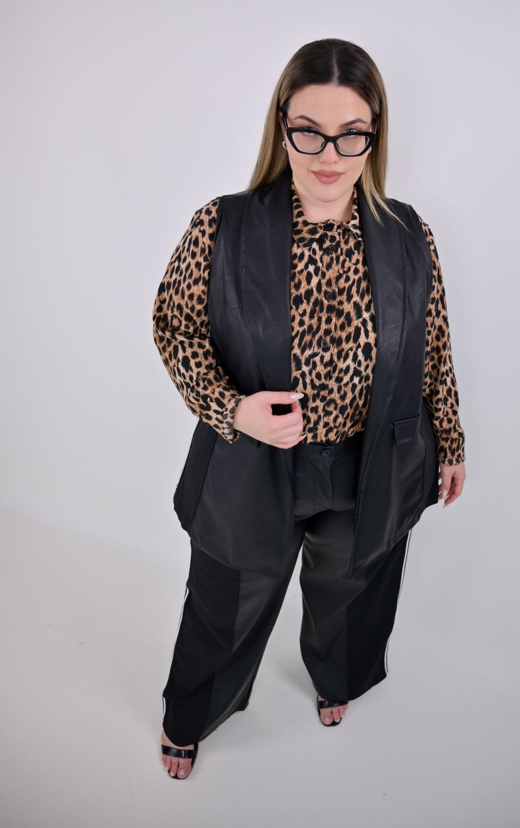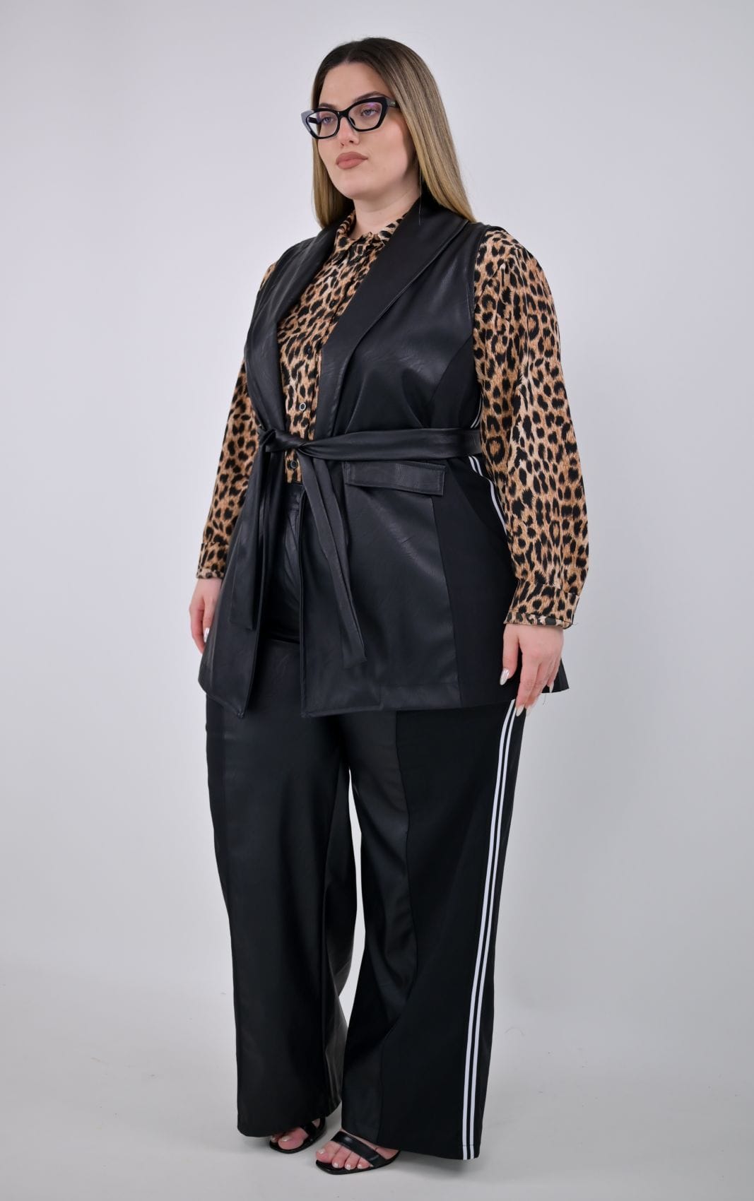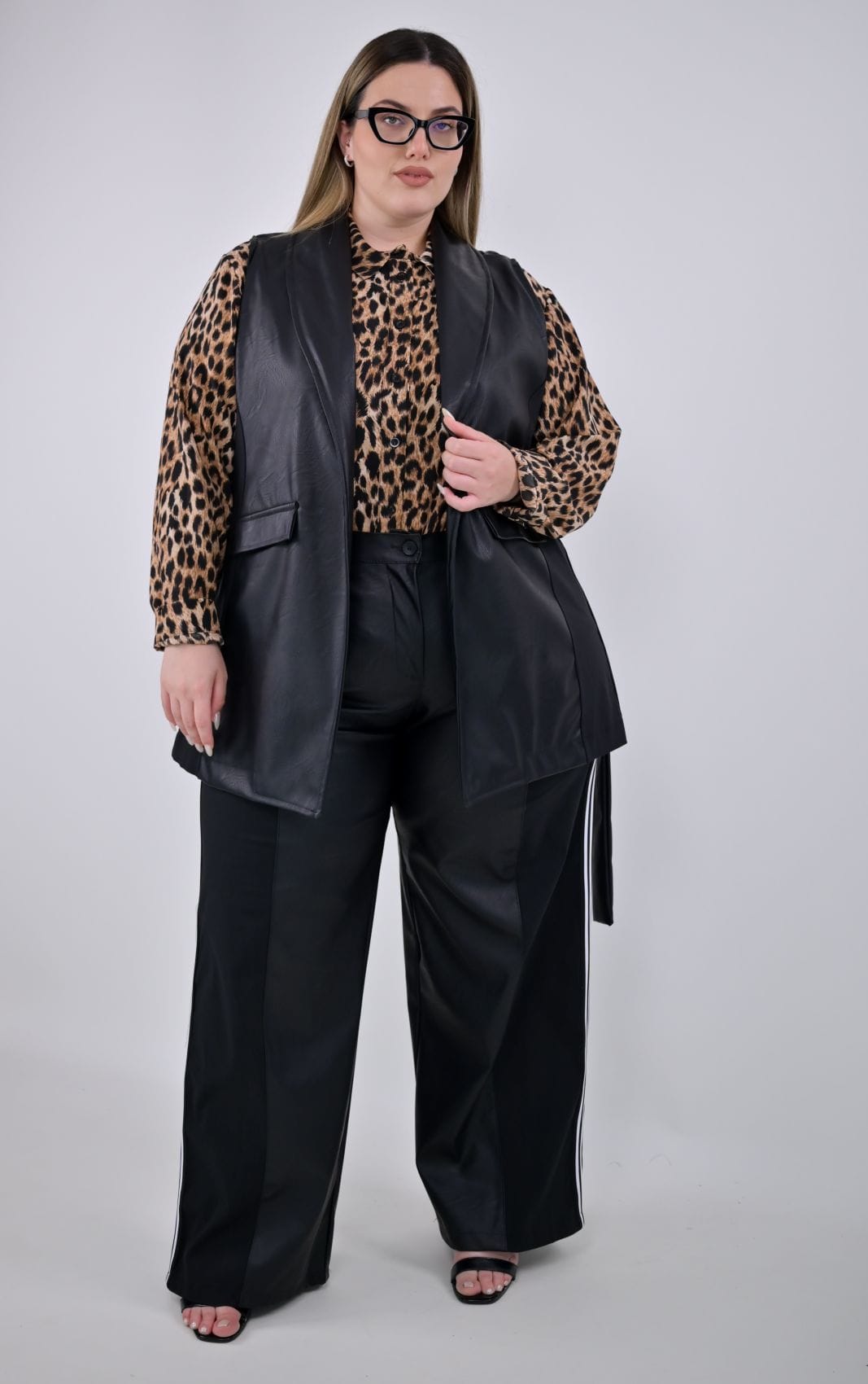 Το plus size μαύρο γιλέκο δερματίνης με πλαϊνές ρίγες φοριέται άνετα πάνω από μπλούζες με print ή μονόχρωμα tops και συνδυάζεται ιδανικά με παντελόνια σε casual ή πιο βραδινά σύνολα.