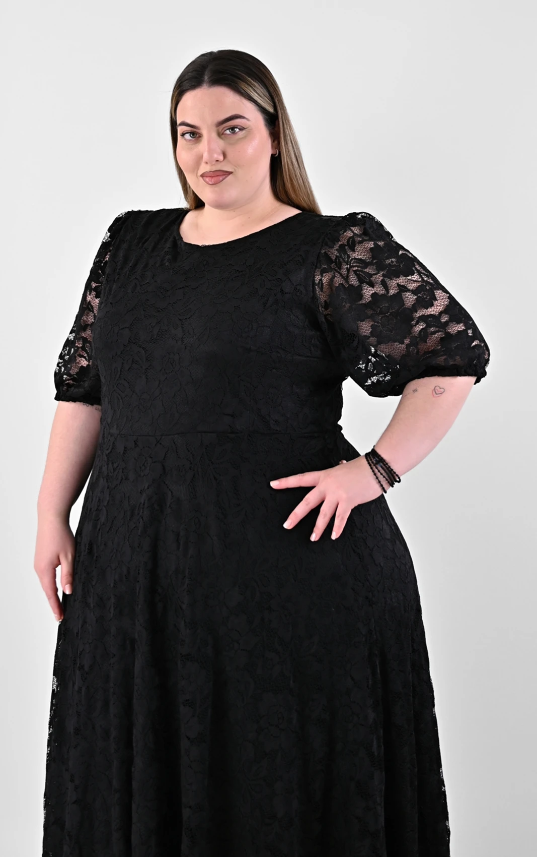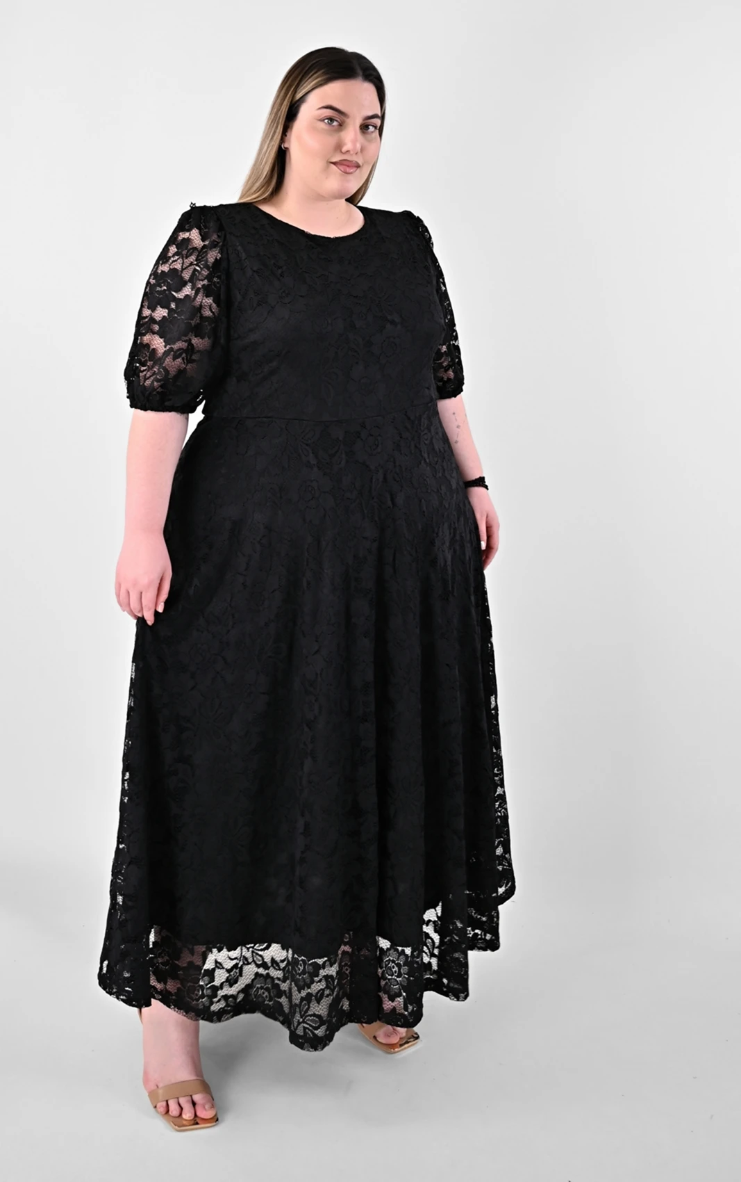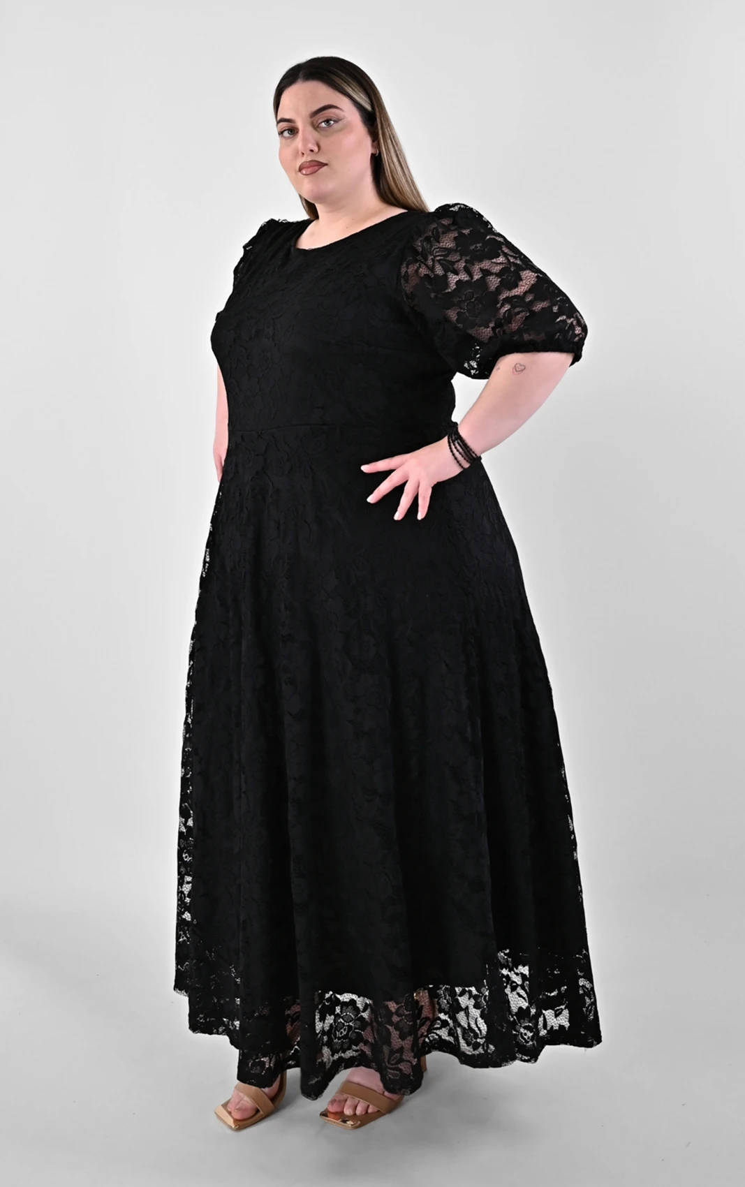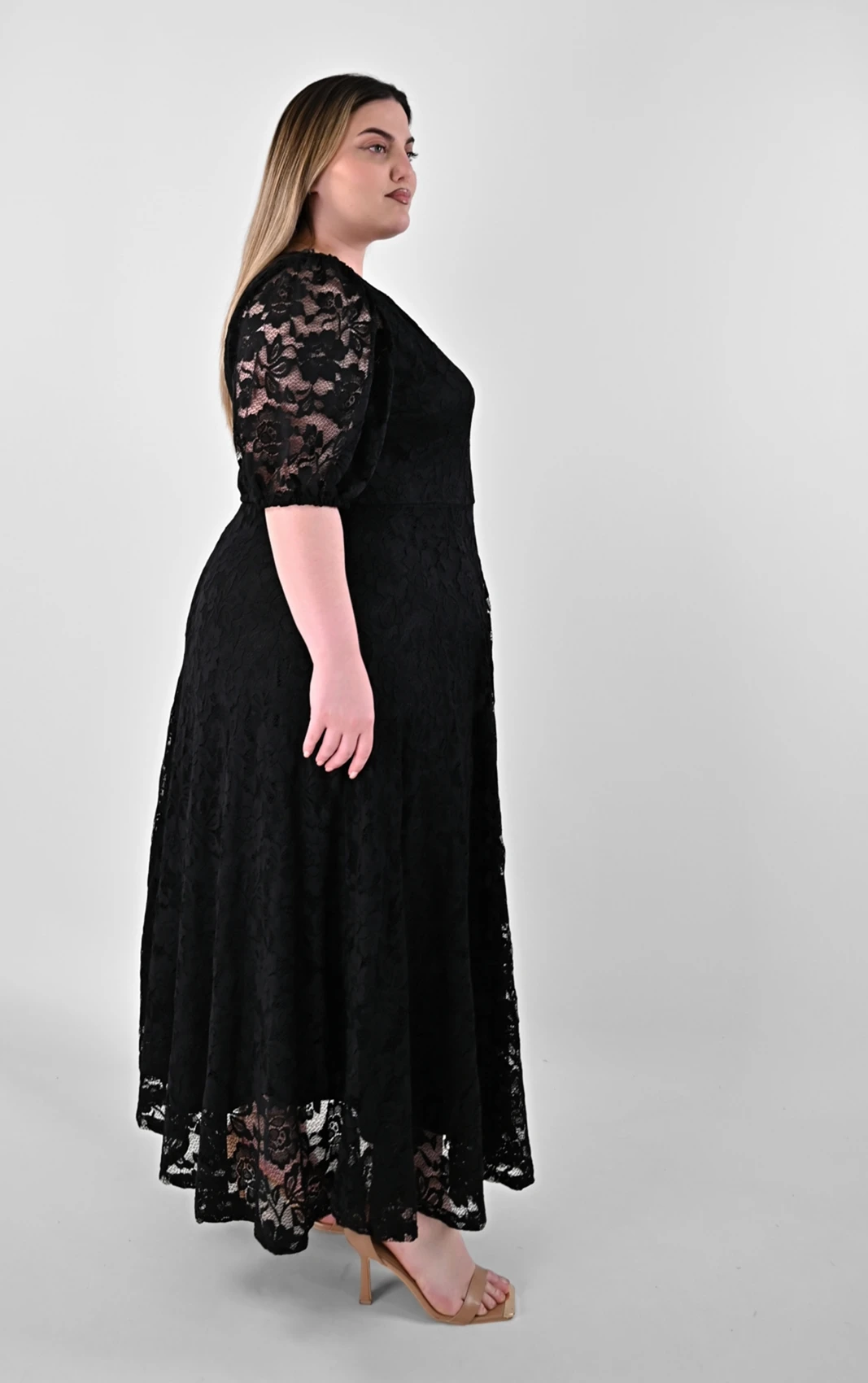 Ανακαλύψτε την απόλυτη εκδοχή της κομψότητας. Αυτό το Plus size μάξι φόρεμα σε κλασικό μαύρο χρώμα είναι φτιαγμένο από ποιοτική, ανάγλυφη δαντέλα, προσφέροντας ένα tasteful και εκλεπτυσμένο αποτέλεσμα.