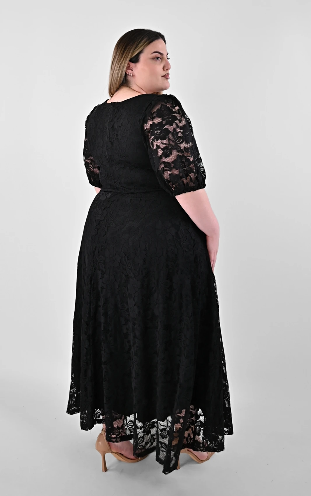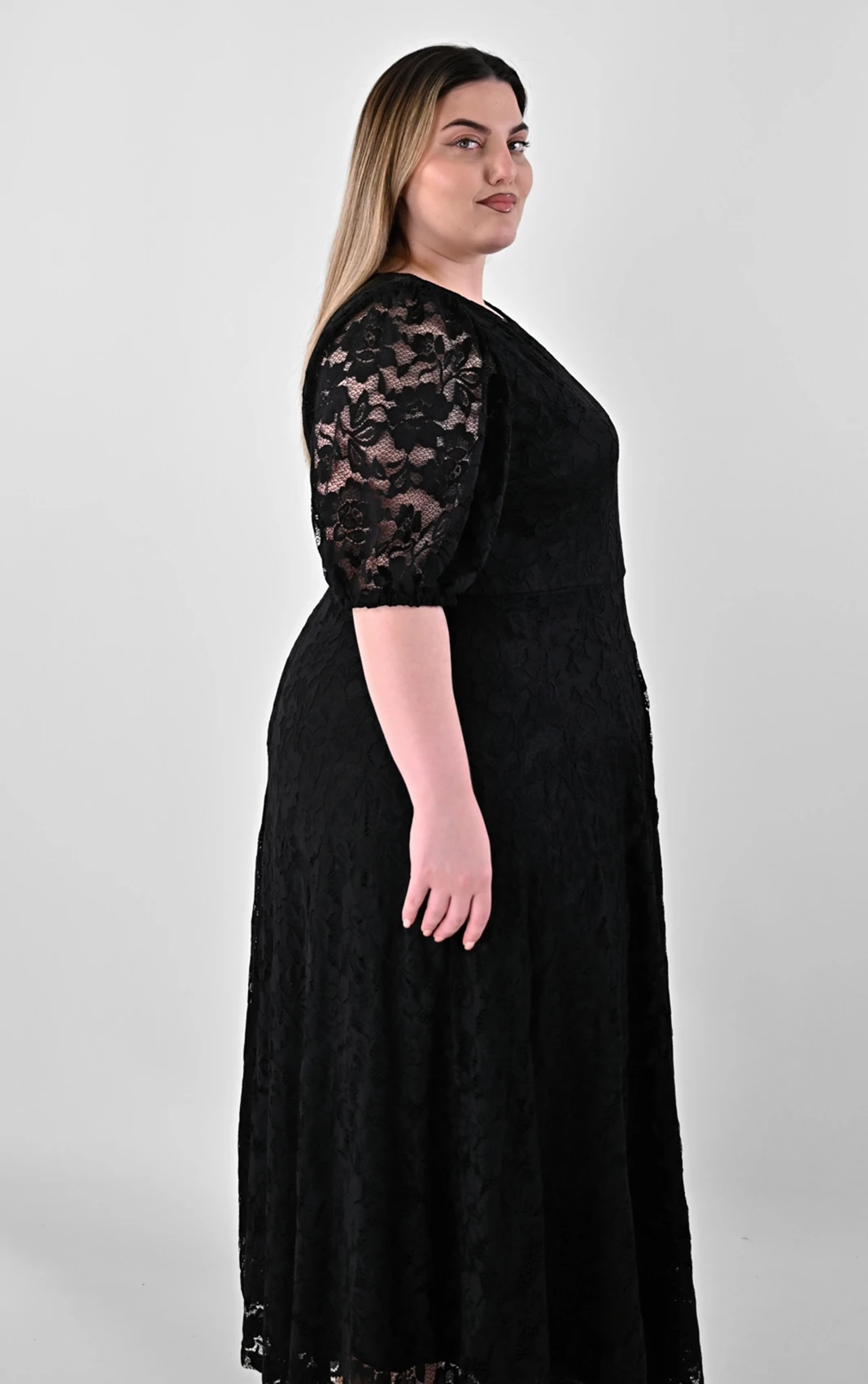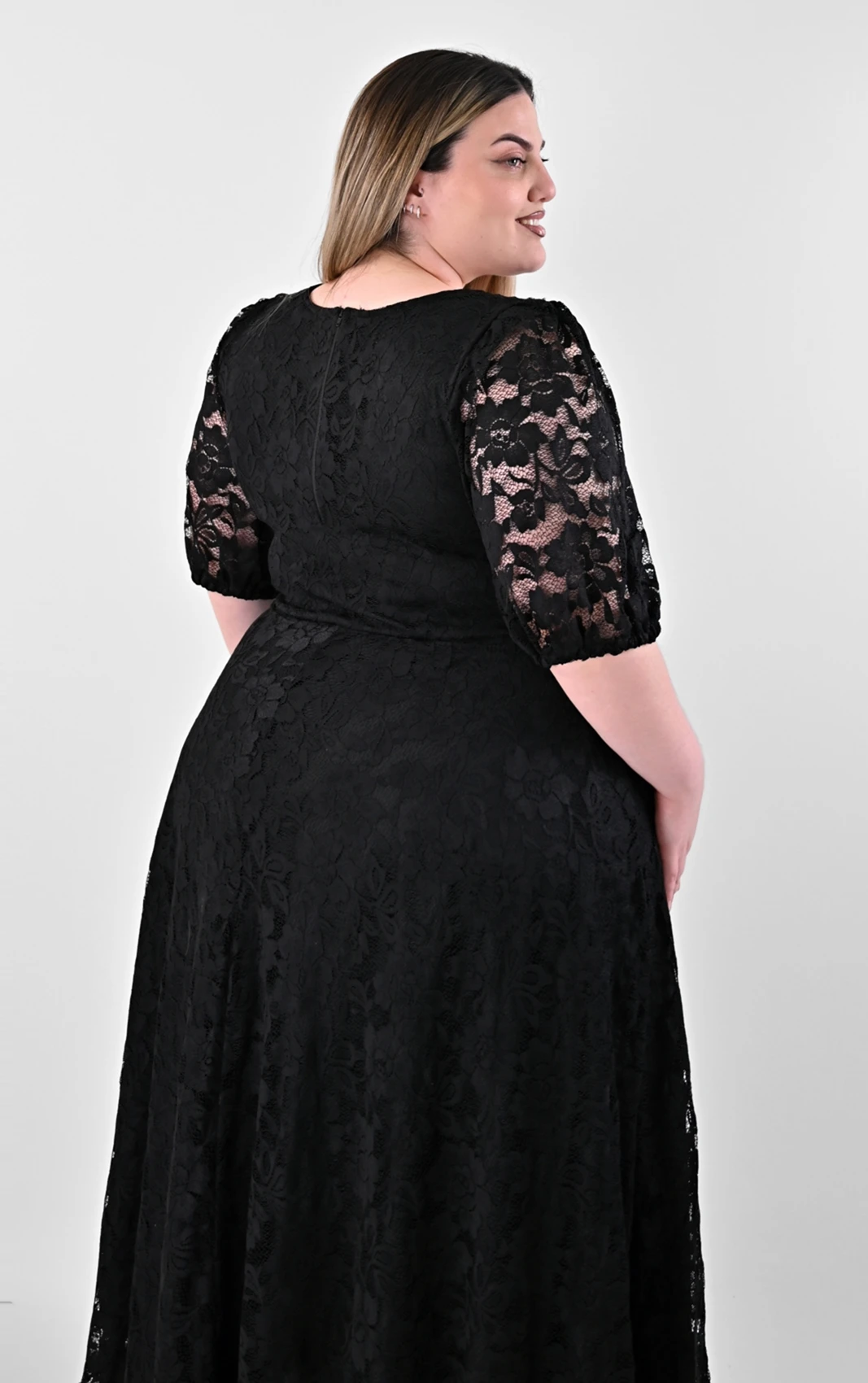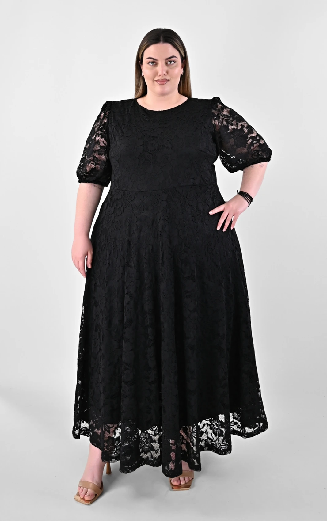 Ανακαλύψτε την απόλυτη εκδοχή της κομψότητας. Αυτό το Plus size μάξι φόρεμα σε κλασικό μαύρο χρώμα είναι φτιαγμένο από ποιοτική, ανάγλυφη δαντέλα, προσφέροντας ένα tasteful και εκλεπτυσμένο αποτέλεσμα.