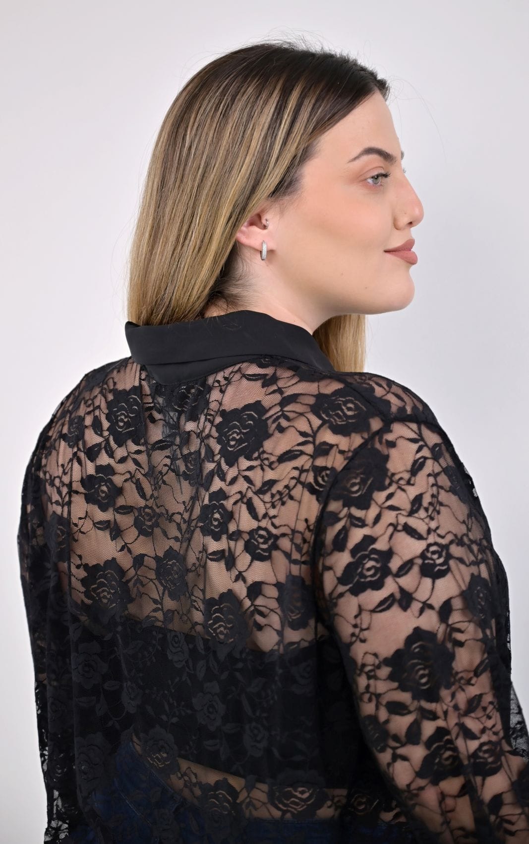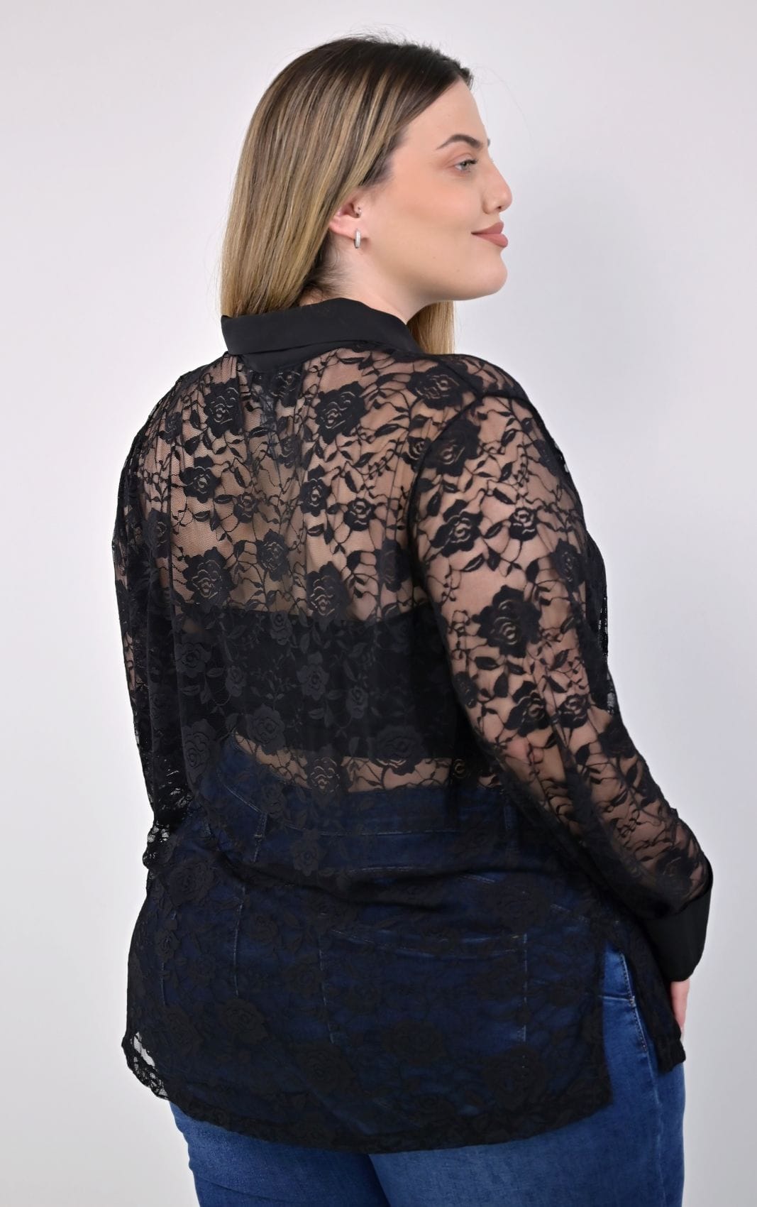 Αυτό το plus size μαύρο πουκάμισο είναι ένα διαχρονικό κομμάτι που απογειώνεται χάρη στις κομψές λεπτομέρειες από δαντέλα. Είναι η τέλεια επιλογή για τις στιγμές που θέλετε μια προσεγμένη και θηλυκή εμφάνιση, χωρίς να χάνετε την άνεσή σας.