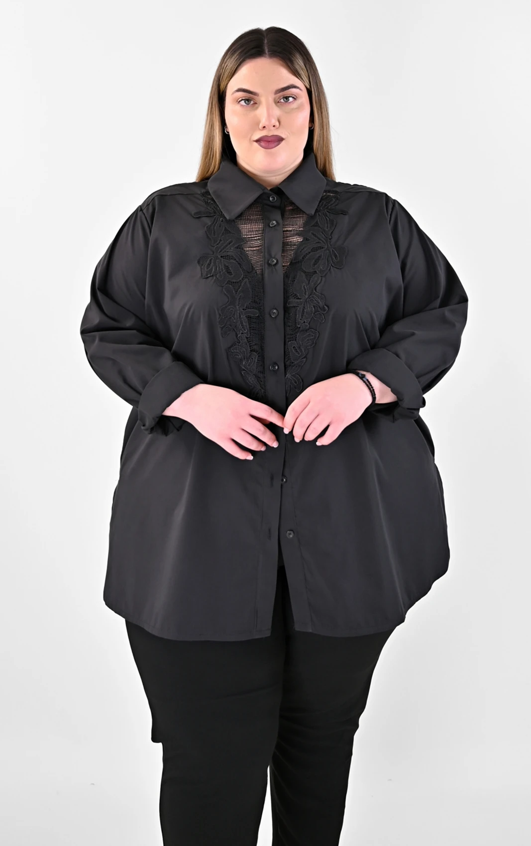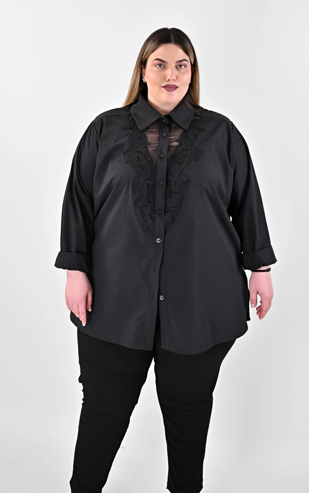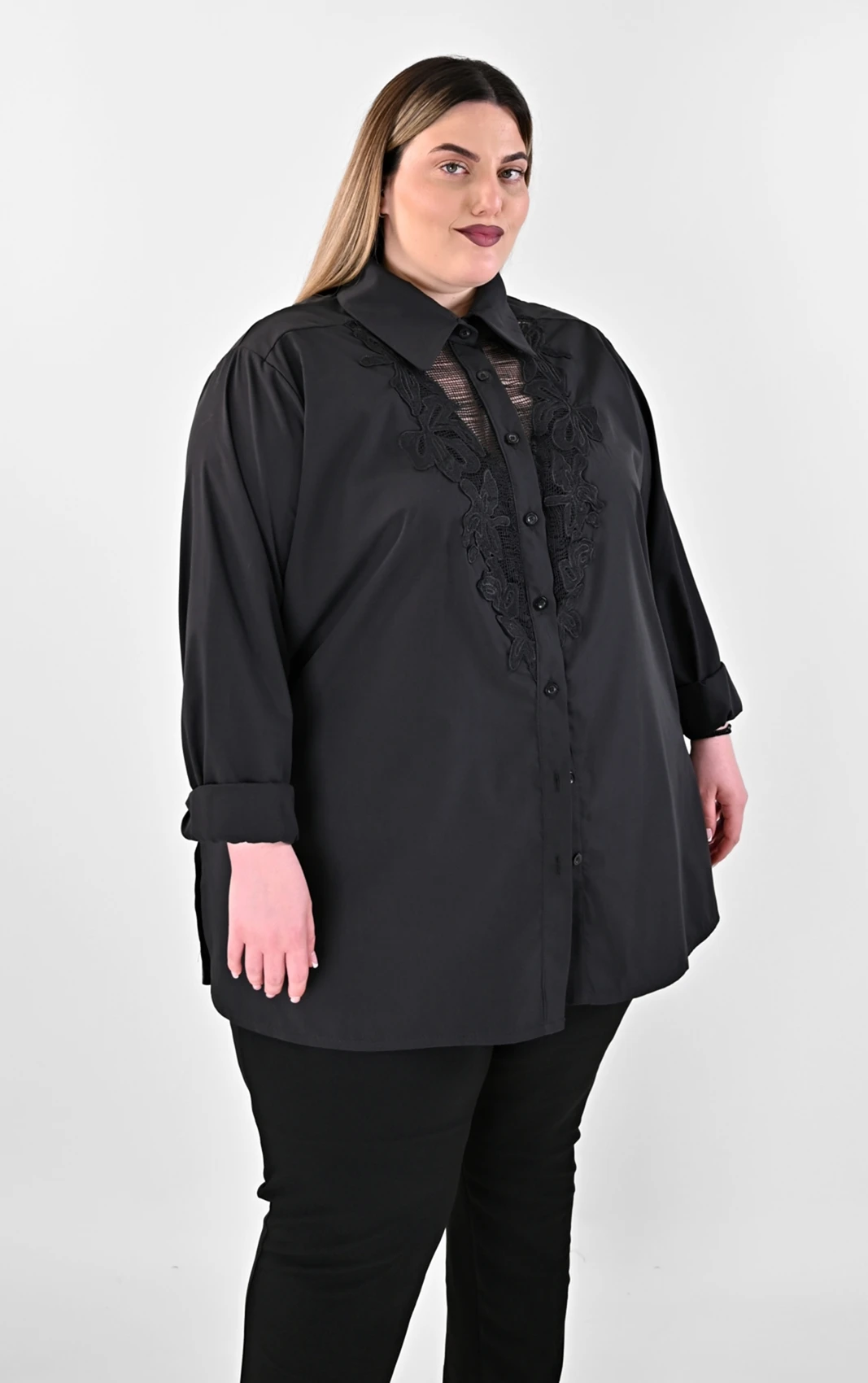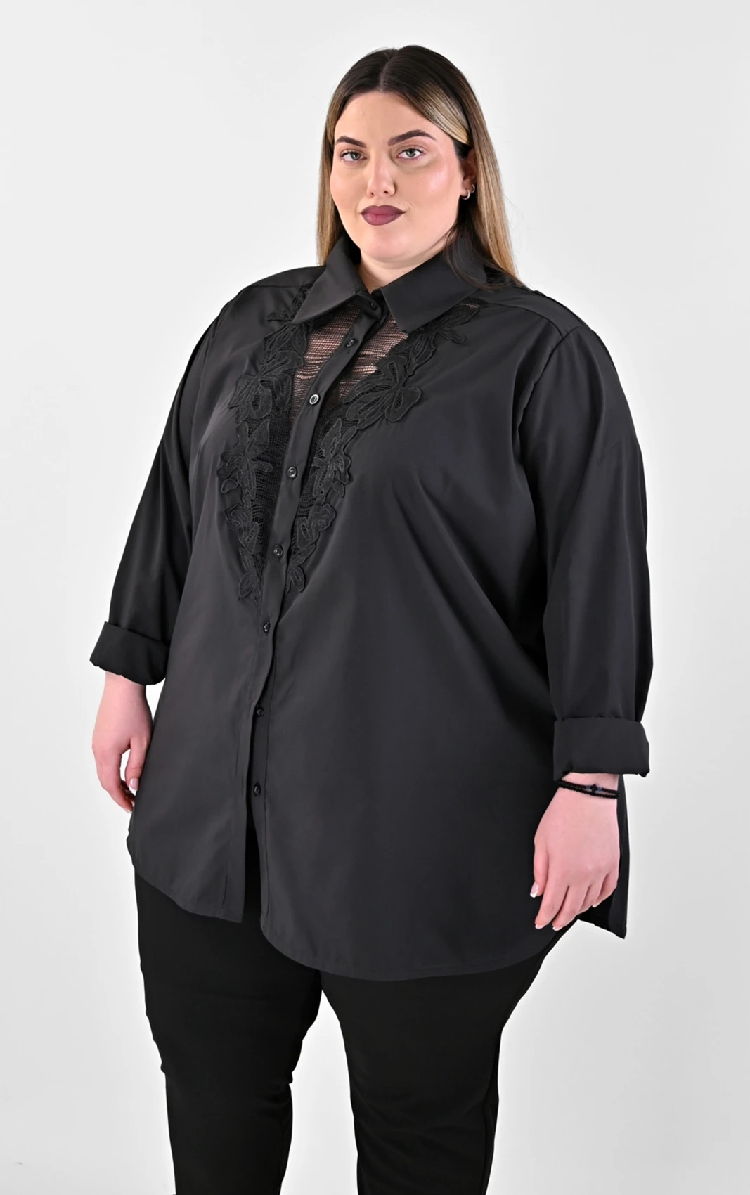 Ανακάλυψε την απόλυτη ισορροπία ανάμεσα στο δυναμικό στυλ και τη θηλυκότητα με αυτό το Μαύρο Πουκάμισο με Δαντελένιο Μοτίφ. Το κύριο χαρακτηριστικό του είναι το εντυπωσιακό κεντημένο μοτίφ από δαντέλα στο στήθος, που δημιουργεί μια διακριτική διαφάνεια και δίνει βάθος στο σχέδιο. Με άνετη γραμμή και προσεγμένα ανοίγματα στο πλάι, προσφέρει εξαιρετική κίνηση και στρώσιμο, ενώ ο κλασικός γιακάς και τα κουμπιά διατηρούν τον διαχρονικό του χαρακτήρα.