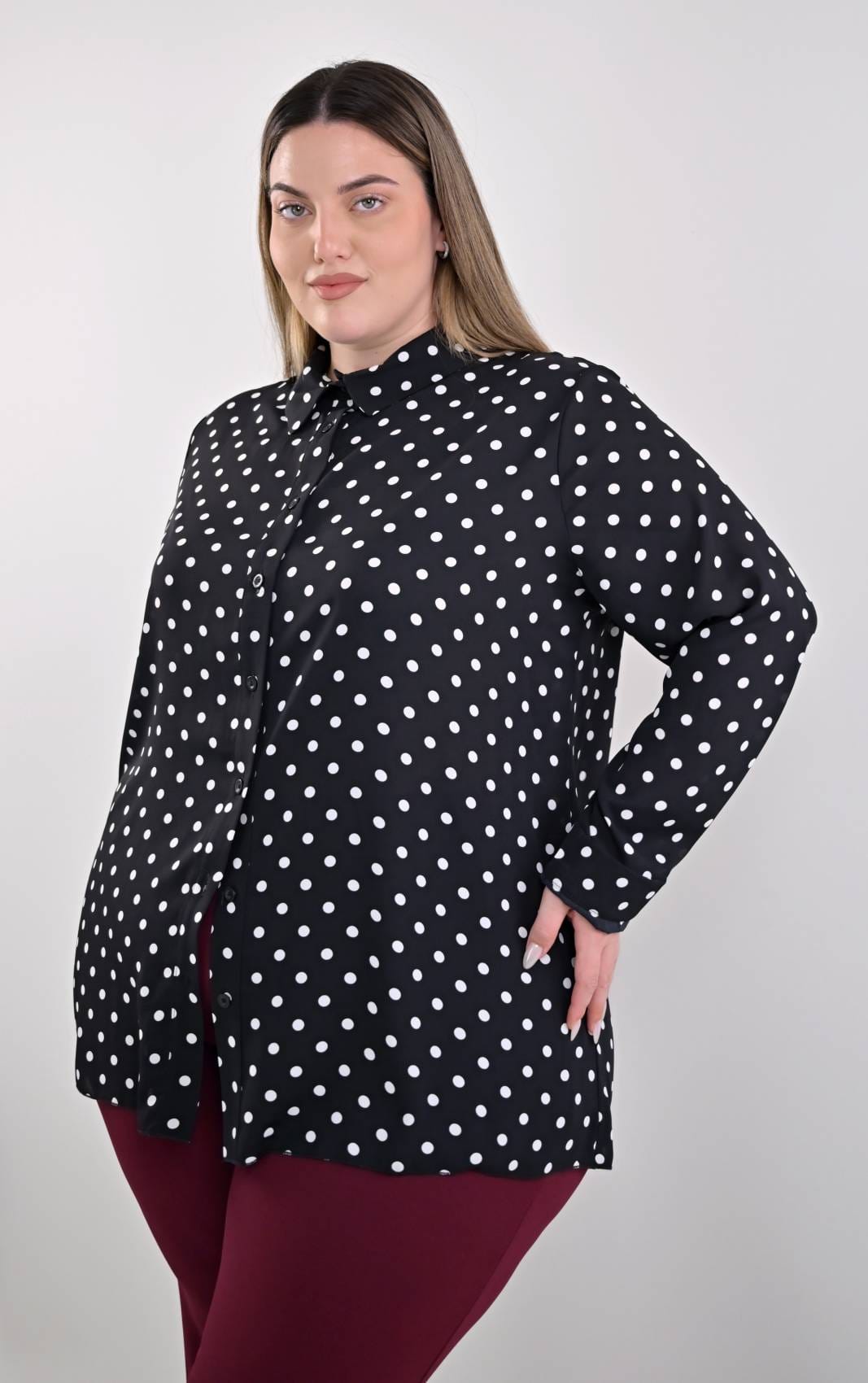 Αυτό το plus size πουκάμισο με το κλασικό πουά μοτίβο είναι ένα κομμάτι που δεν φεύγει ποτέ από τη μόδα. Ο συνδυασμός του μαύρου με το λευκό πουά δημιουργεί ένα αποτέλεσμα που είναι ταυτόχρονα παιχνιδιάρικο και απίστευτα σικ, καθιστώντας το ιδανικό για αμέτρητες περιστάσεις.