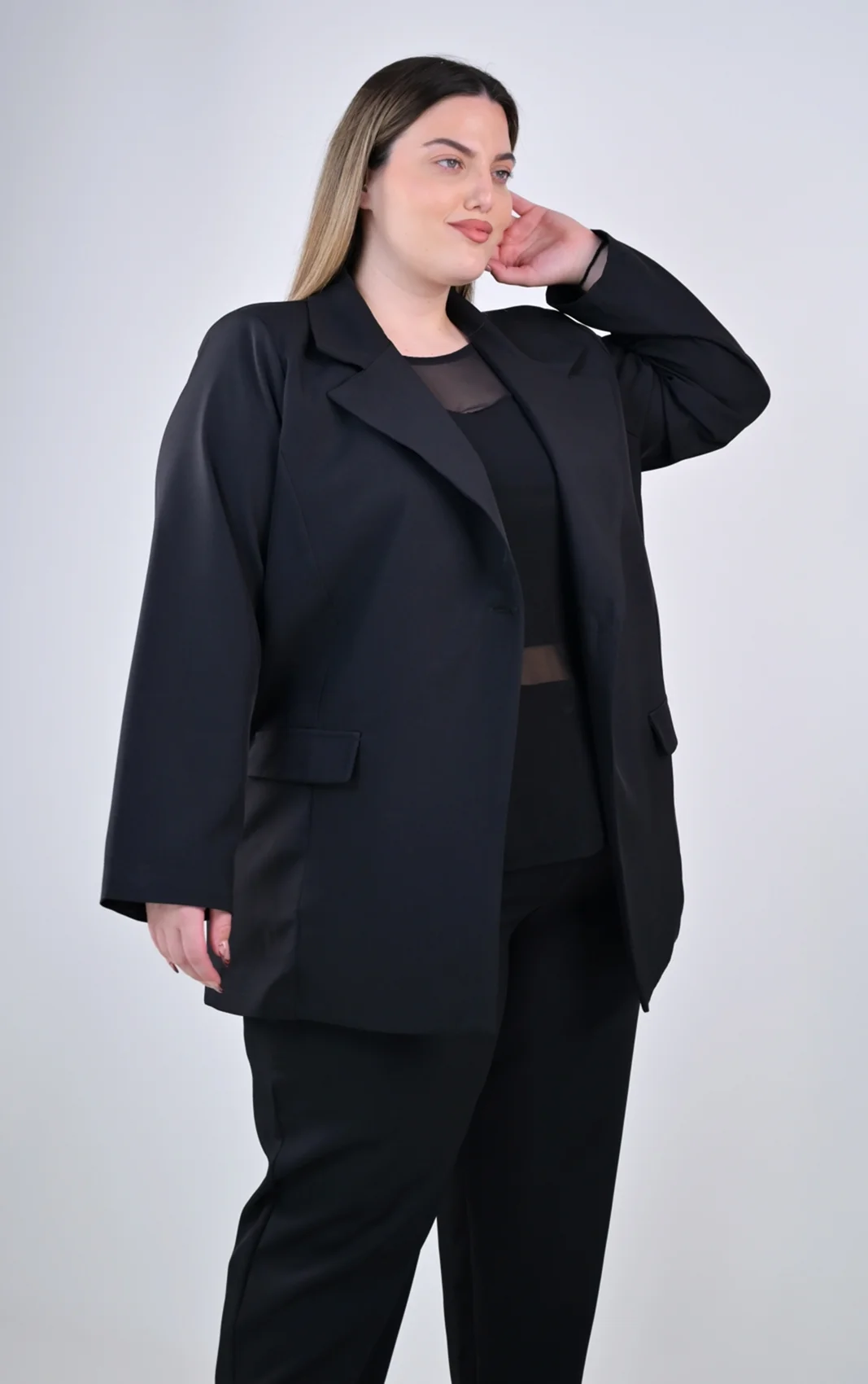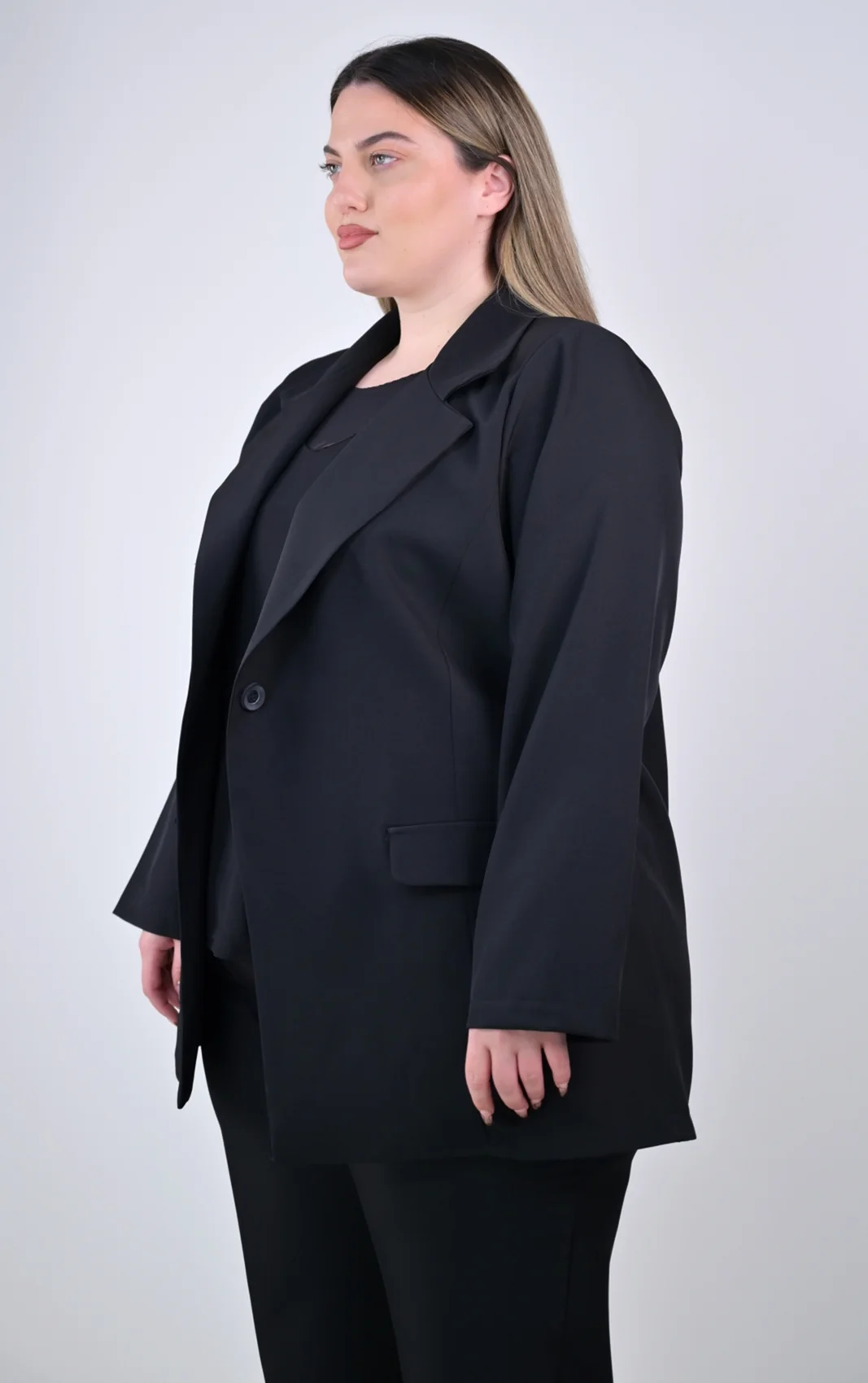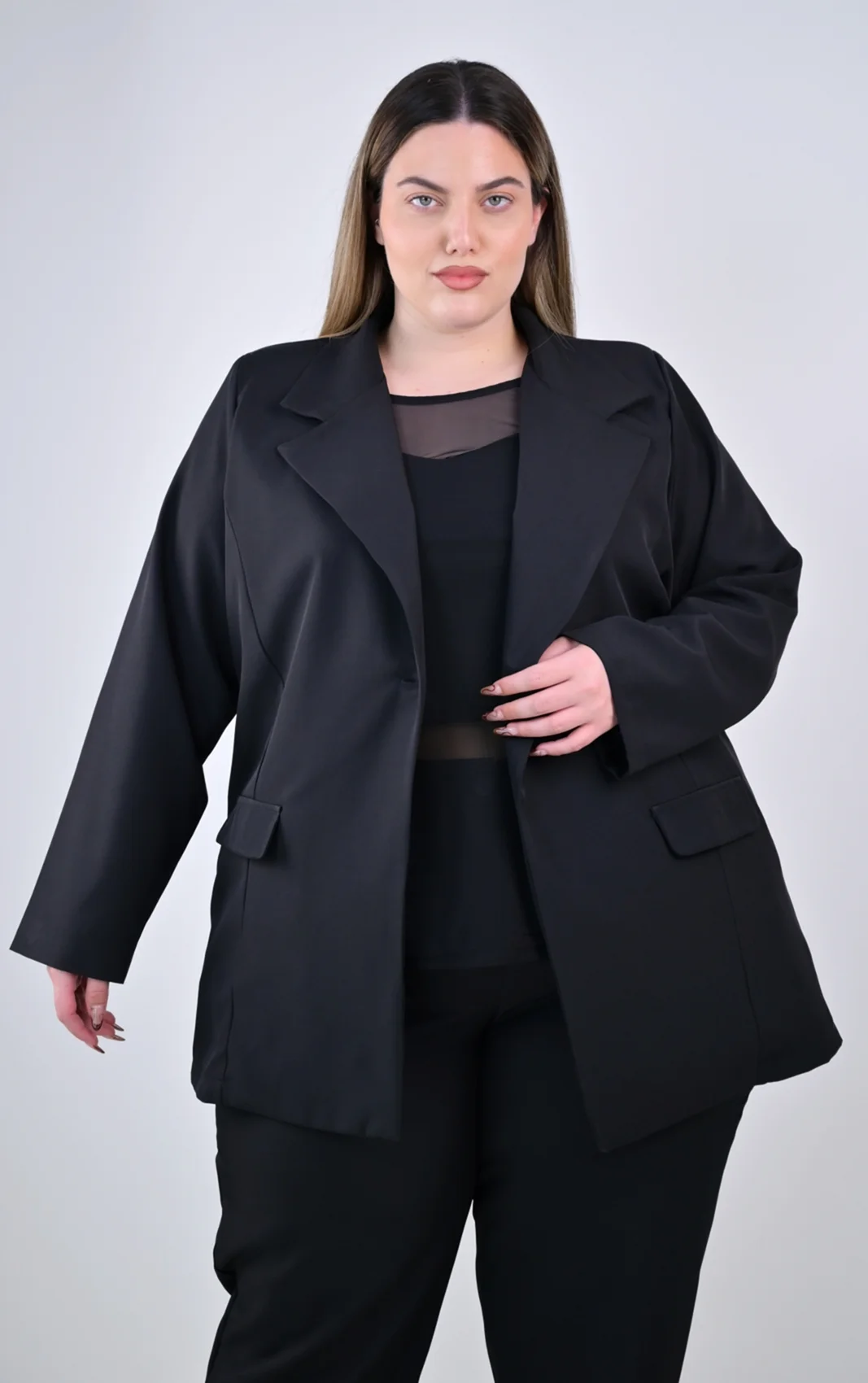 Αναβαθμίστε αμέσως την γκαρνταρόμπας σας με αυτό το plus size μαύρο σακάκι, το απόλυτο σύμβολο δυναμικού στυλ. Σχεδιασμένο για να σας συνοδεύει από τις επαγγελματικές συναντήσεις μέχρι τις χαλαρές βόλτες, προσφέρει την τέλεια ισορροπία μεταξύ άνετης εφαρμογής και προσεγμένης εμφάνισης, χαρίζοντας αυτοπεποίθηση σε κάθε σας βήμα.