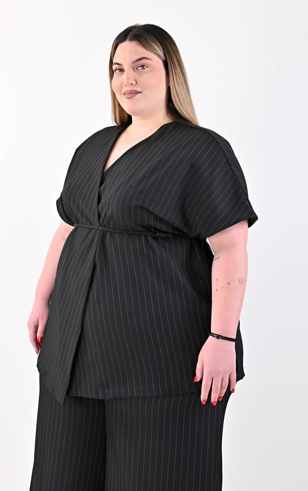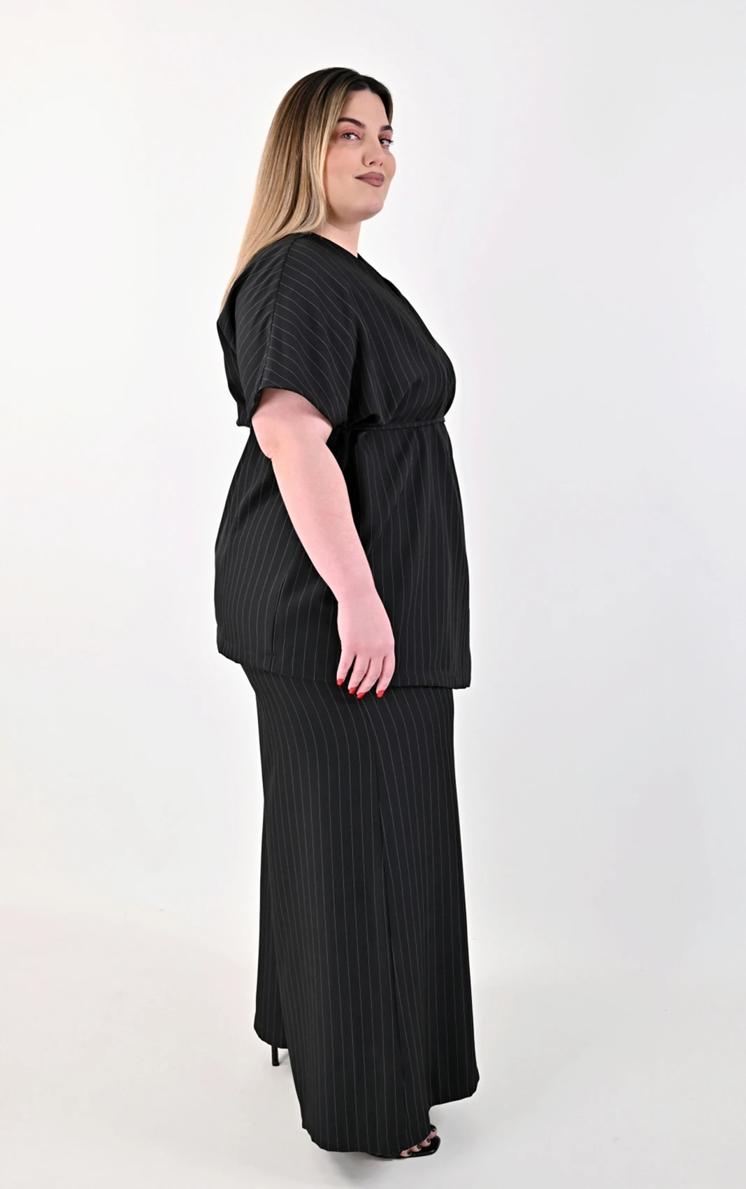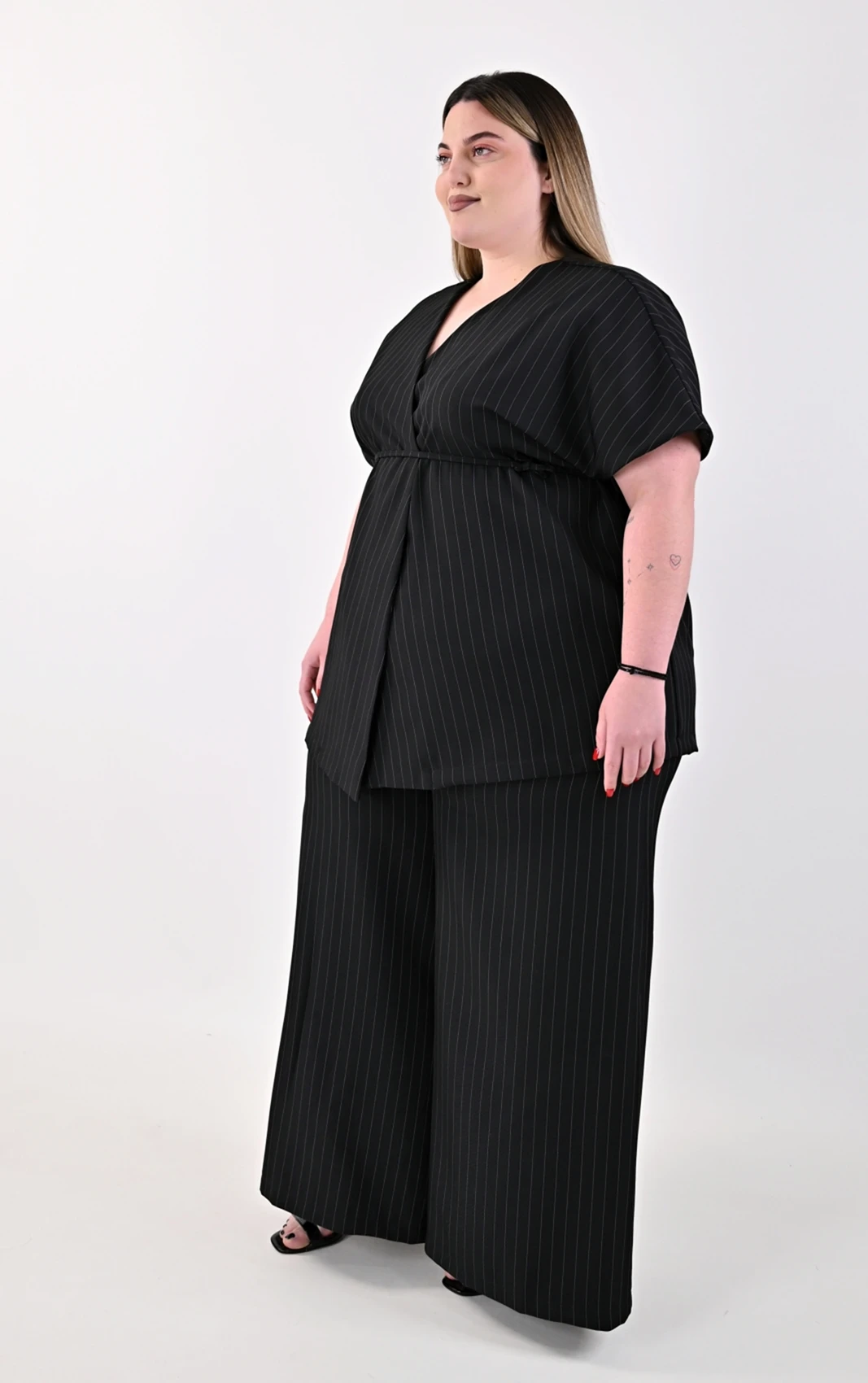Απογειώστε το stylish ντύσιμό σας με αυτό το εκλεπτυσμένο Plus Size σετ, που συνδυάζει την κλασική γοητεία της ρίγας με τον modern σχεδιασμό. Αποτελείται από ένα εντυπωσιακό κρουαζέ τοπ και μια άνετη, ψηλόμεση παντελόνα, δημιουργώντας μια ολοκληρωμένη και προσεγμένη εμφάνιση.