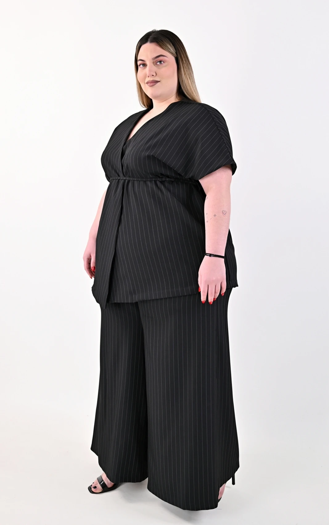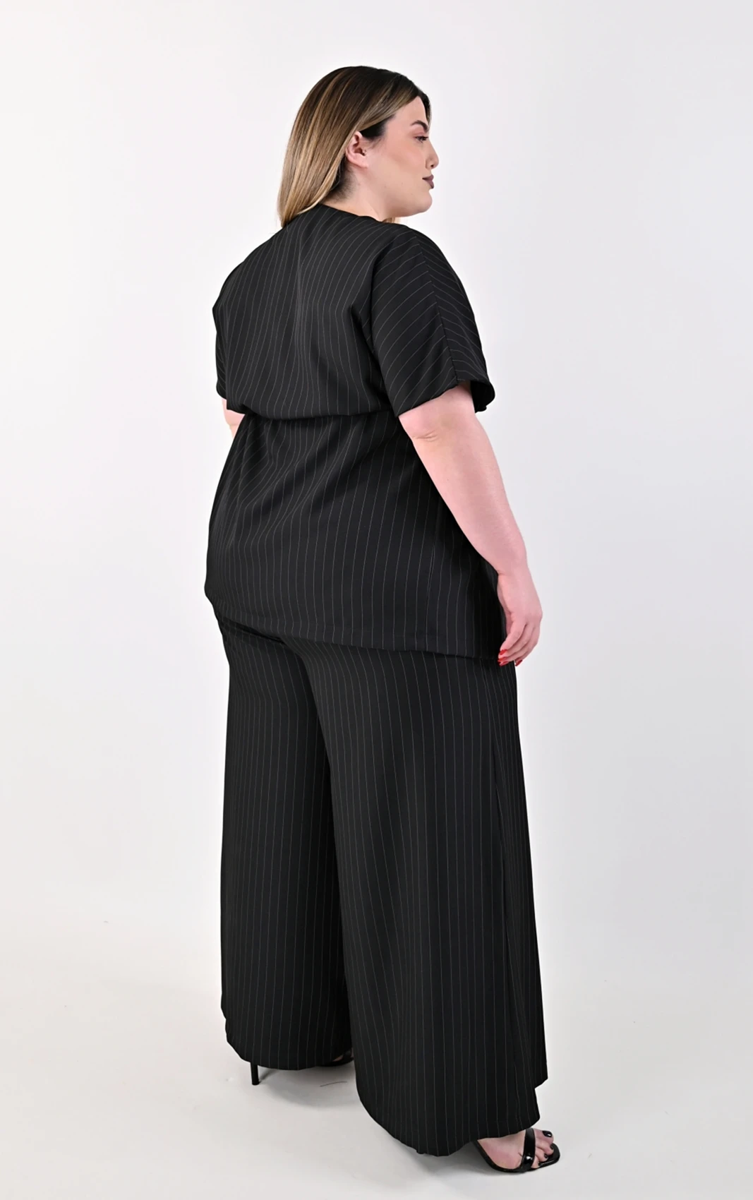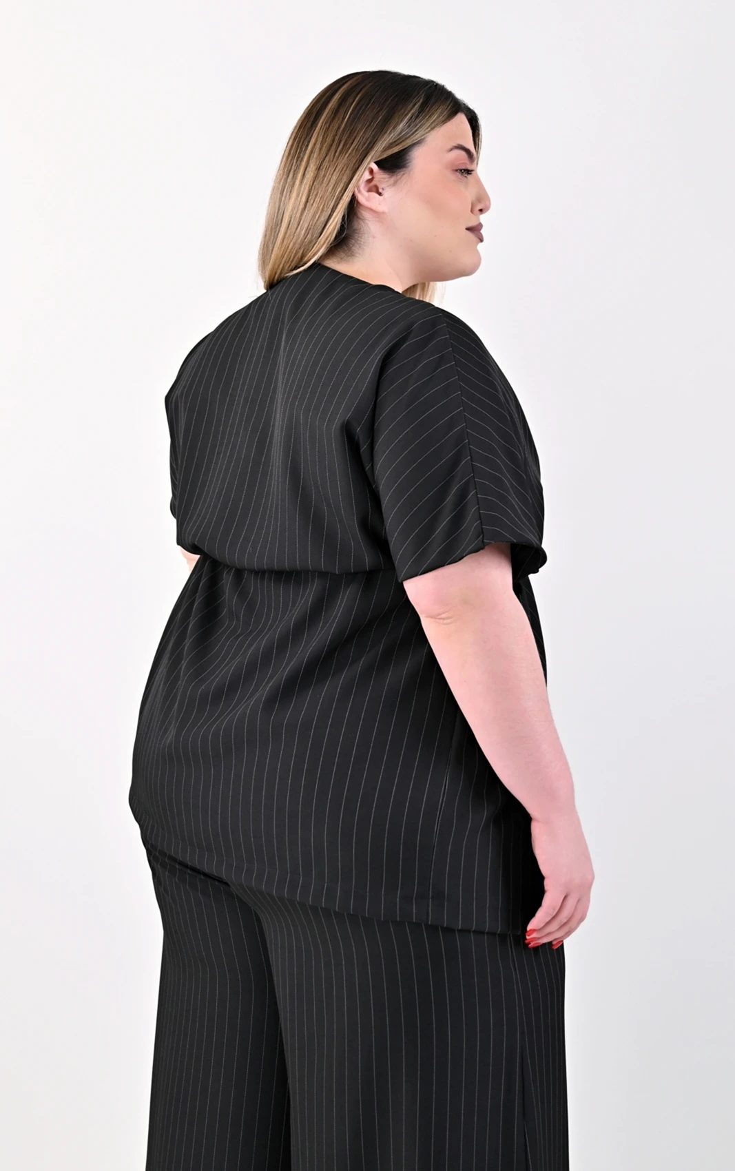 Απογειώστε το stylish ντύσιμό σας με αυτό το εκλεπτυσμένο Plus Size σετ, που συνδυάζει την κλασική γοητεία της ρίγας με τον modern σχεδιασμό. Αποτελείται από ένα εντυπωσιακό κρουαζέ τοπ και μια άνετη, ψηλόμεση παντελόνα, δημιουργώντας μια ολοκληρωμένη και προσεγμένη εμφάνιση.