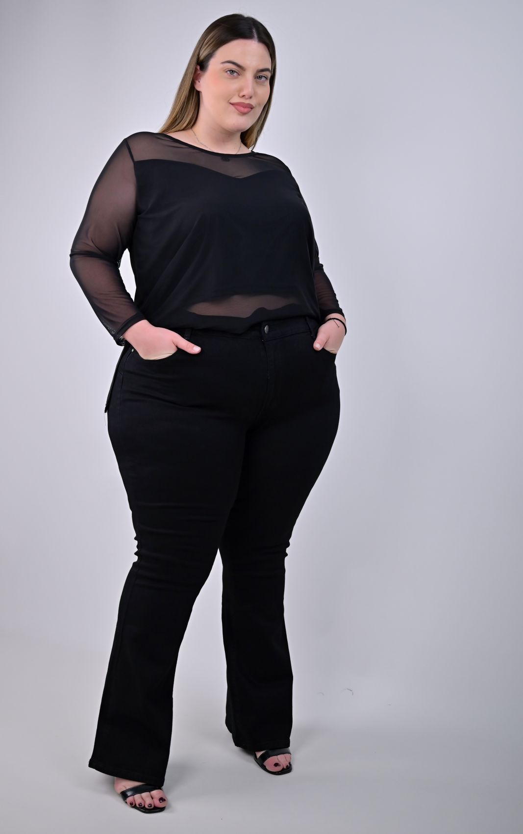 Ανανεώστε την γκαρνταρόμπα σας με αυτό το plus size μαύρο τζιν καμπάνα συνδυάζει το διαχρονικό στυλ με τη μοντέρνα άνεση. Σχεδιασμένο για να αγκαλιάζει τις καμπύλες και να μακραίνει οπτικά τη σιλουέτα, είναι το παντελόνι που θα σας χαρίσει αυτοπεποίθηση και αμέτρητους συνδυασμούς.
