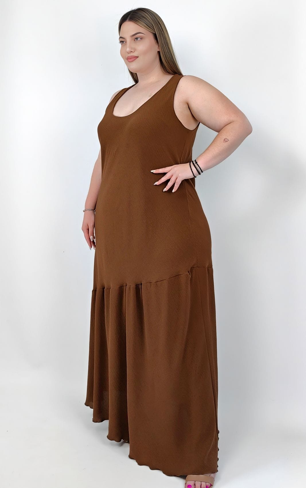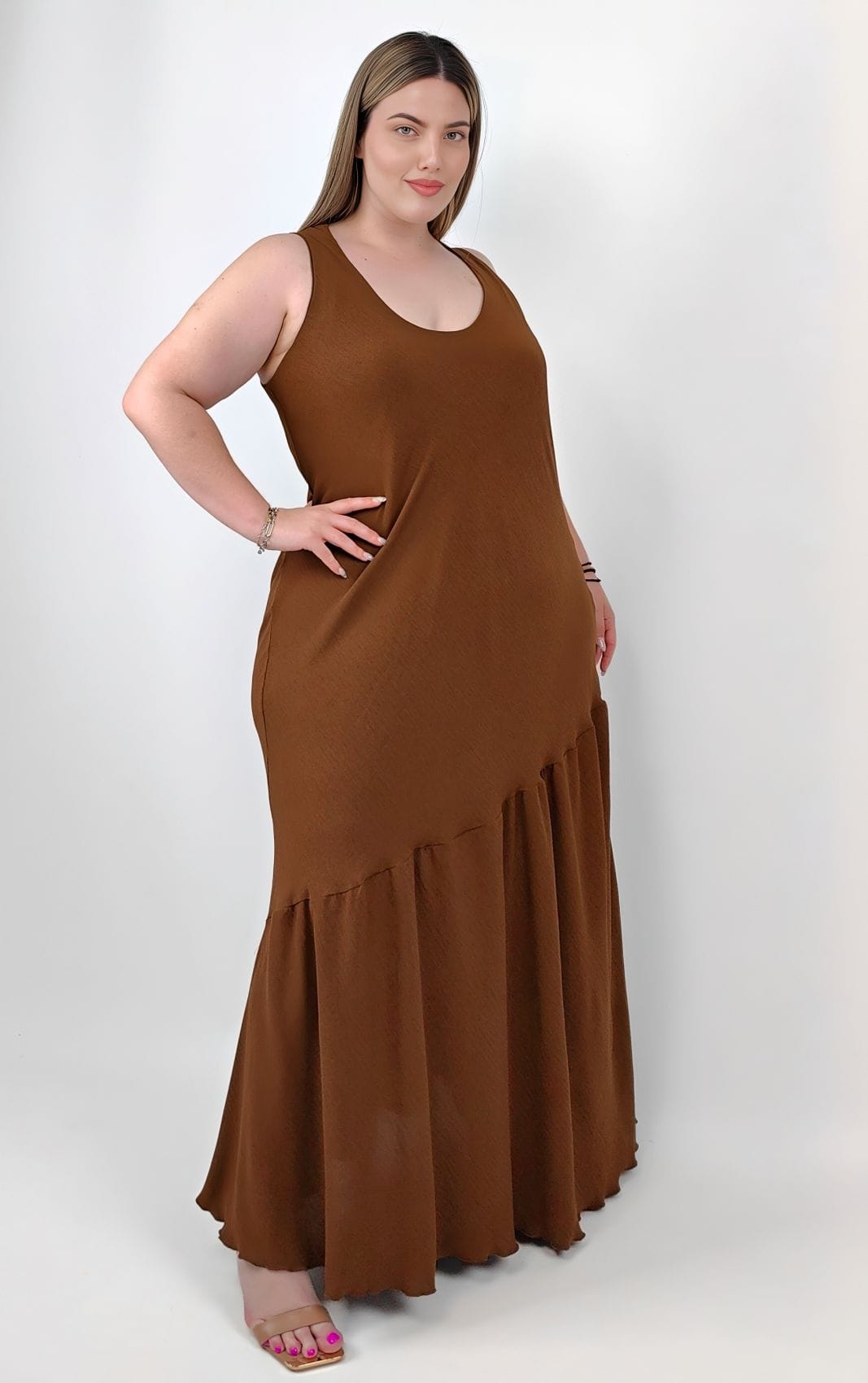 Αυτό το plus size μάξι φόρεμα σε ζεστό καφέ χρώμα είναι αμάνικο και κατασκευασμένο από ελαστικό, τσαλακωτό ύφασμα που αγκαλιάζει απαλά το σώμα, προσφέροντας άνεση και ελευθερία κινήσεων. Το ασύμμετρο βολάν στο τελείωμα προσθέτει κίνηση και φινέτσα στο σχέδιο, ενώ η φαρδιά γραμμή εξασφαλίζει ευχάριστη εφαρμογή χωρίς περιορισμούς. Ιδανικό για καθημερινές εμφανίσεις ή πιο χαλαρές περιστάσεις