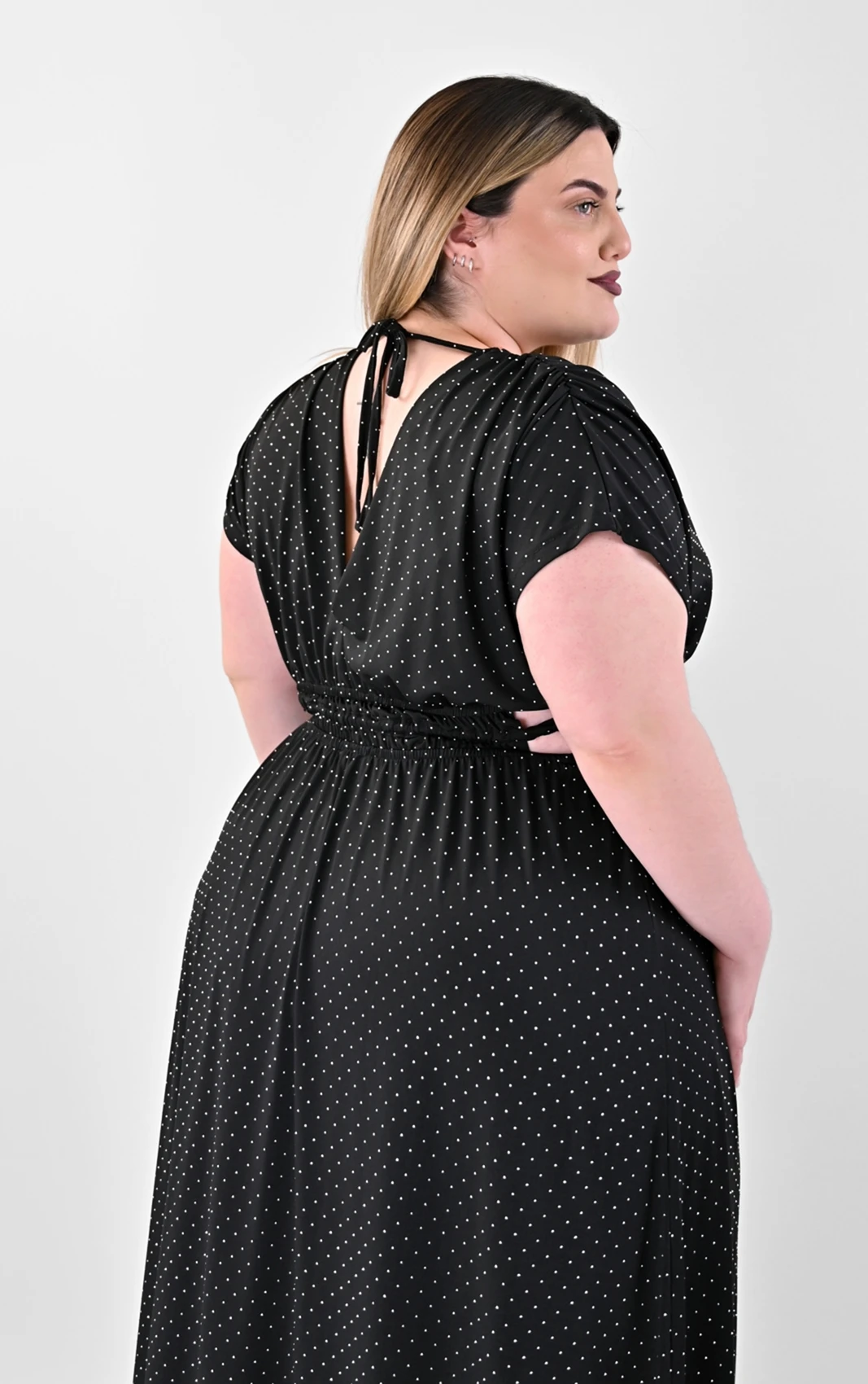 Αναδείξτε τη θηλυκότητά σας με το Μάξι Μαύρο Φόρεμα Cut Out με Στρας. Το σχέδιο κλέβει τις εντυπώσεις χάρη στα αμέτρητα, διάσπαρτα στρας που του χαρίζουν μια διακριτική, αλλά καθηλωτική λάμψη σε κάθε σου κίνηση. Οι διπλές cut-out λεπτομέρειες στις δύο πλευρές της μέσης προσθέτουν μια αισθησιακή και μοντέρνα διάσταση, ενώ το σκίσιμο στο πλάι προσφέρει κίνηση και αποκαλύπτει διακριτικά το πόδι. Το φόρεμα διαθέτει κομψή V-λαιμόκοψη, ελαστική μέση για τέλεια εφαρμογή και ανάλαφρα, κοντά μανίκια που κολακεύουν. Το δέσιμο στην πλάτη προσθέτει μια ακόμα θηλυκή λεπτομέρεια, εξασφαλίζοντας ένα tasteful αποτέλεσμα από κάθε γωνία.