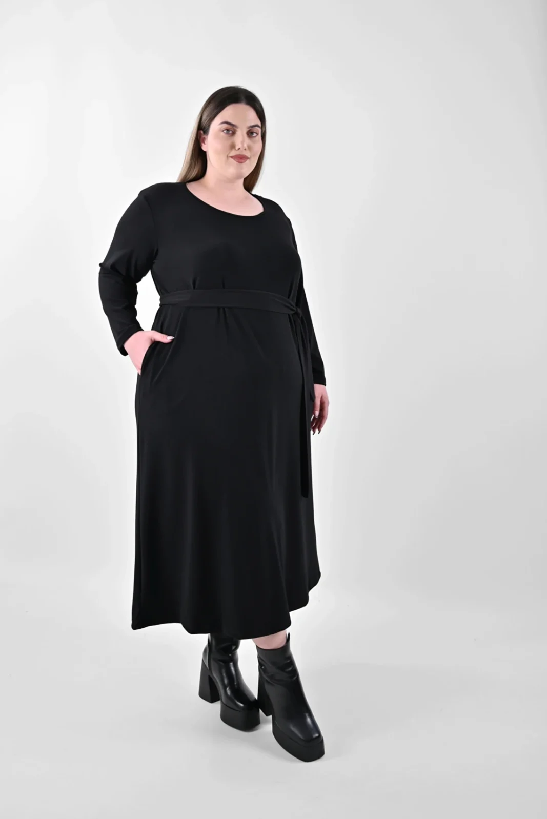 Μαύρο Midi Φόρεμα με Τσέπες και Ζώνη