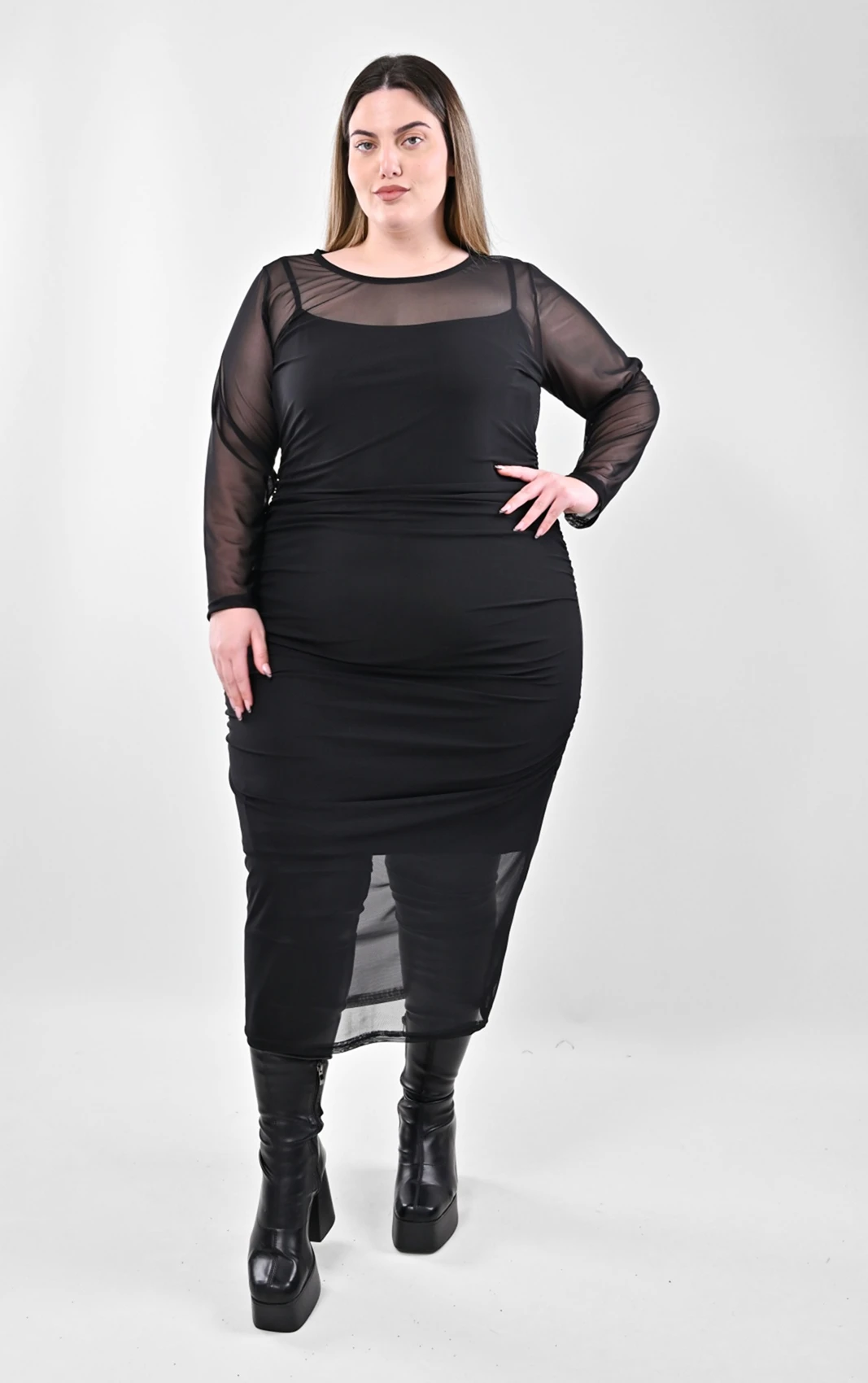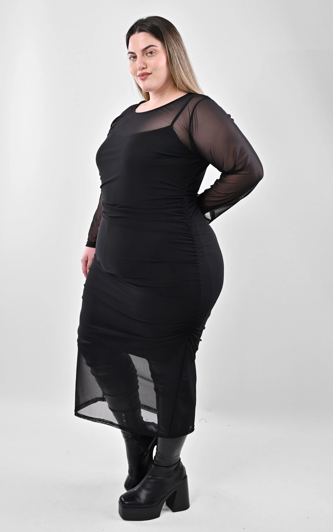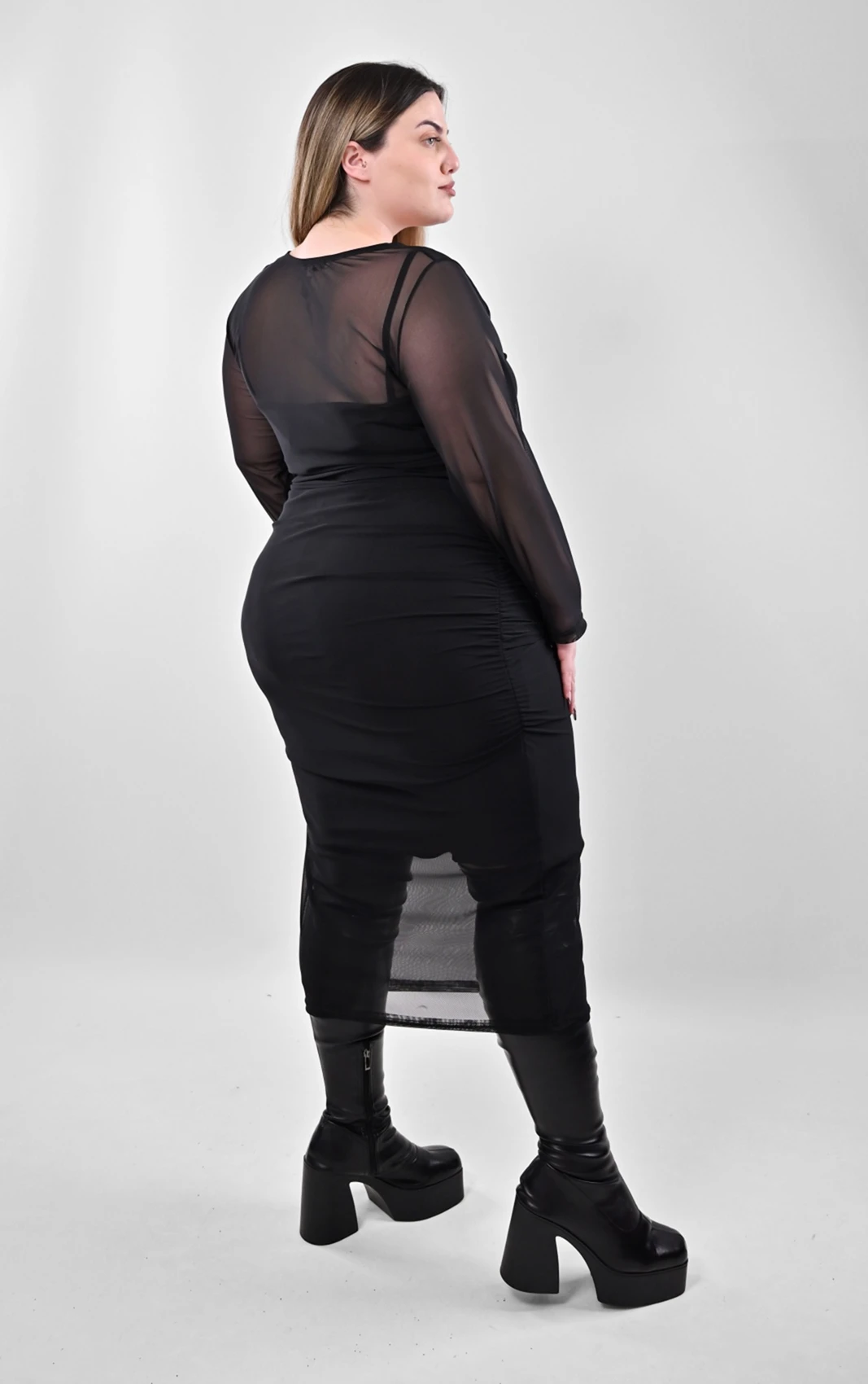 Midi Μαύρο Φόρεμα με Σούρες & Διάφανο Τούλι