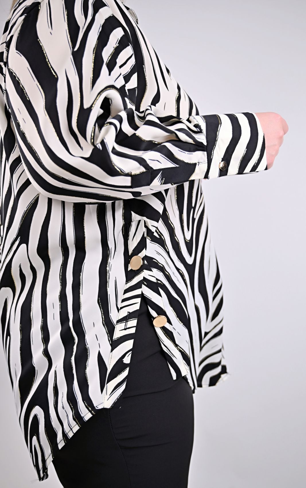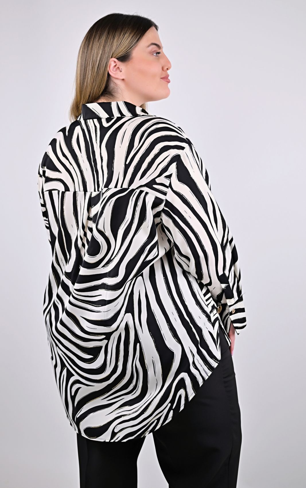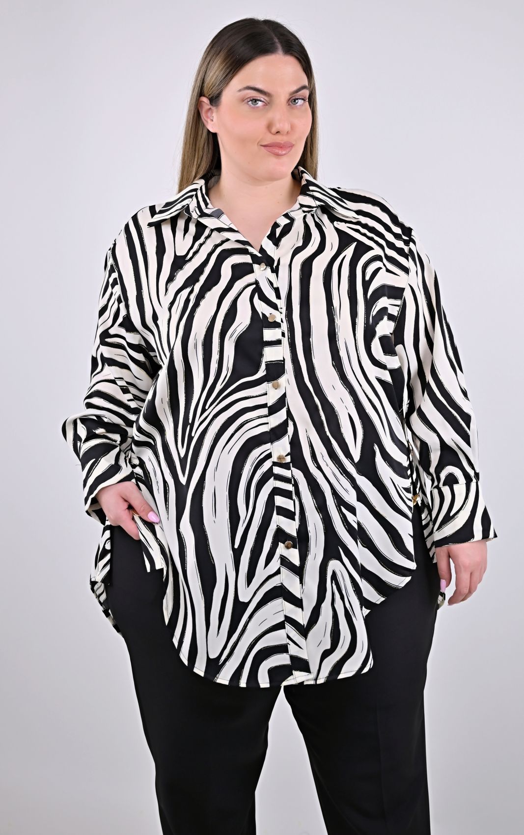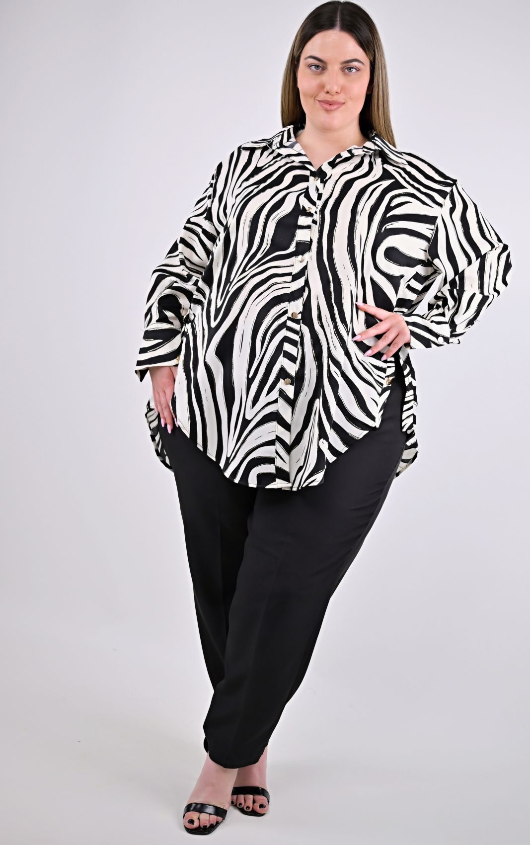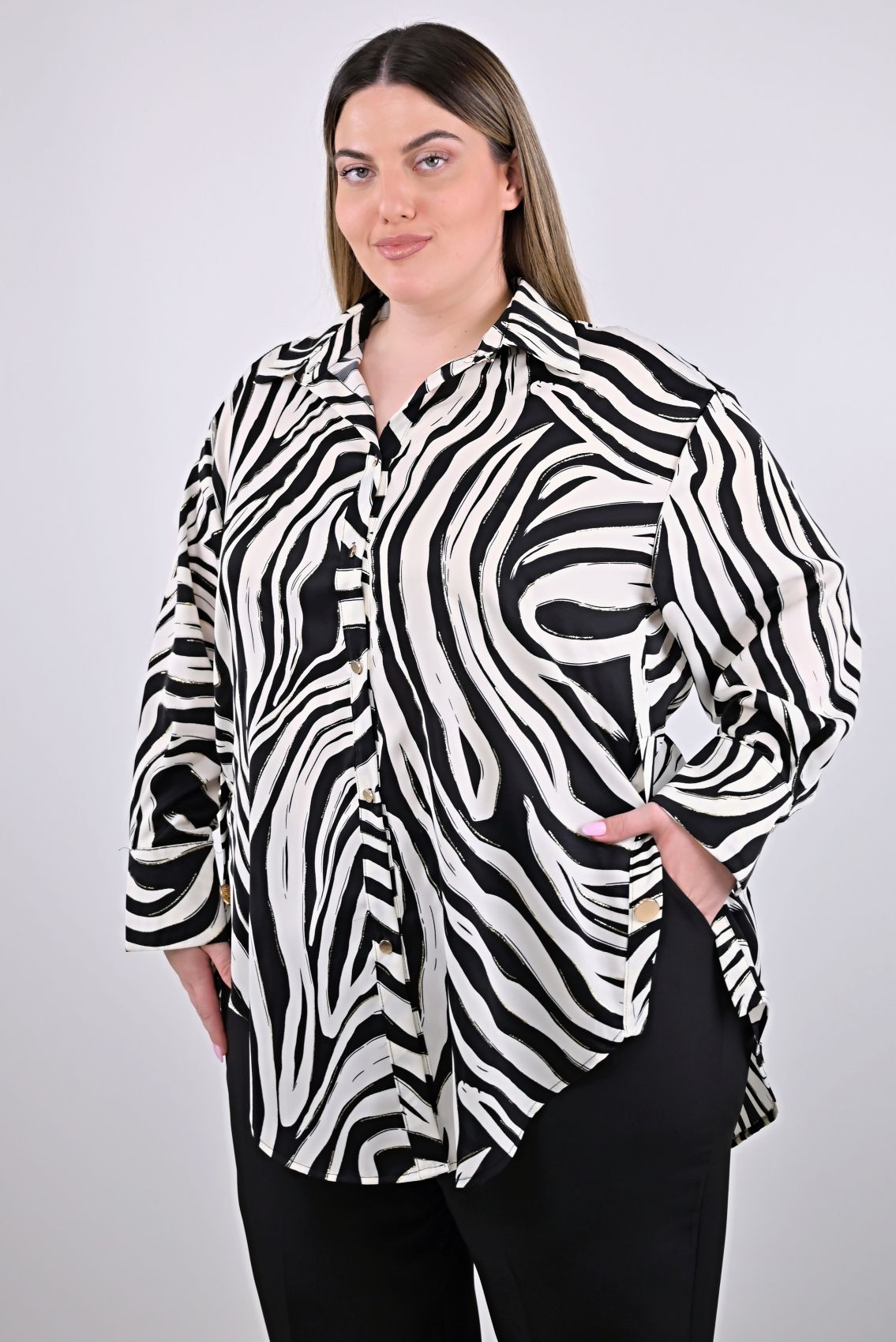 Ανανεώστε το animal print look σας με αυτή τη μοντέρνα plus size μπεζ ζεβρέ πουκαμίσα. Οι ζεστοί, γήινοι τόνοι του μπεζ συνδυάζονται με το κλασικό μαύρο, δημιουργώντας ένα καλαίσθητο αποτέλεσμα που φοριέται εύκολα από το πρωί ως το βράδυ. Ένα statement κομμάτι που συνδυάζει την άνεση με τις τελευταίες τάσεις της μόδας.