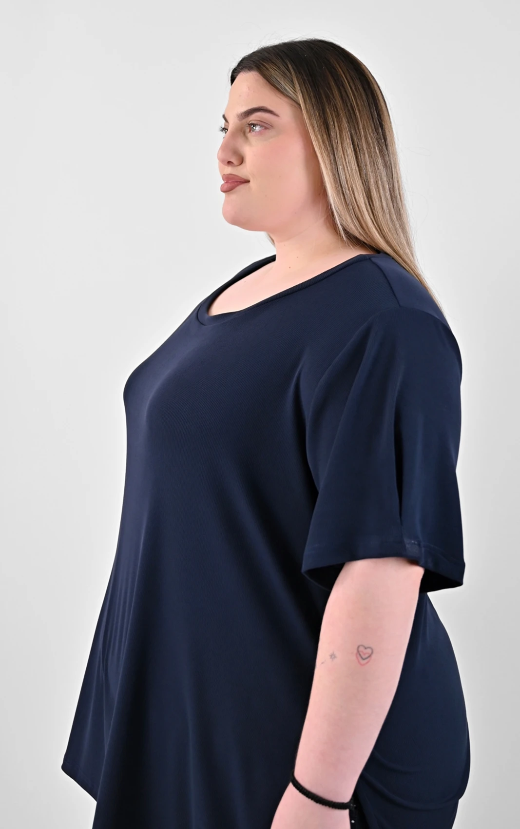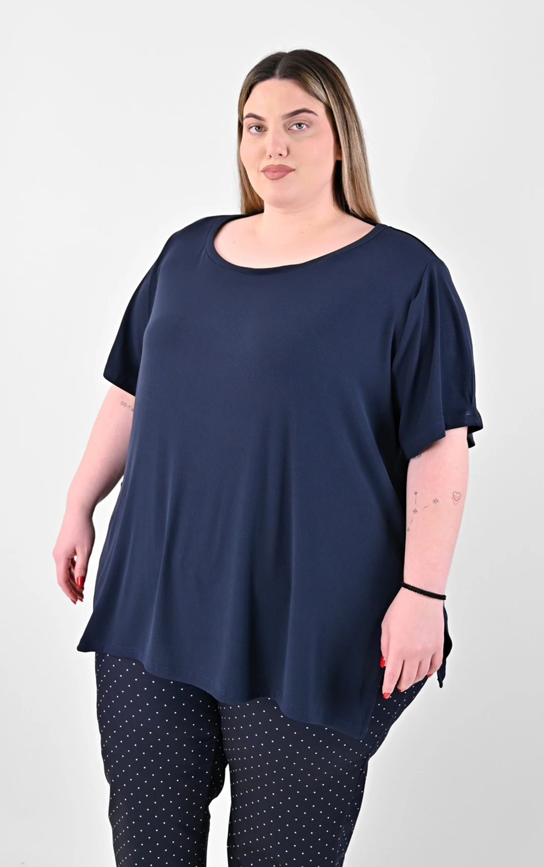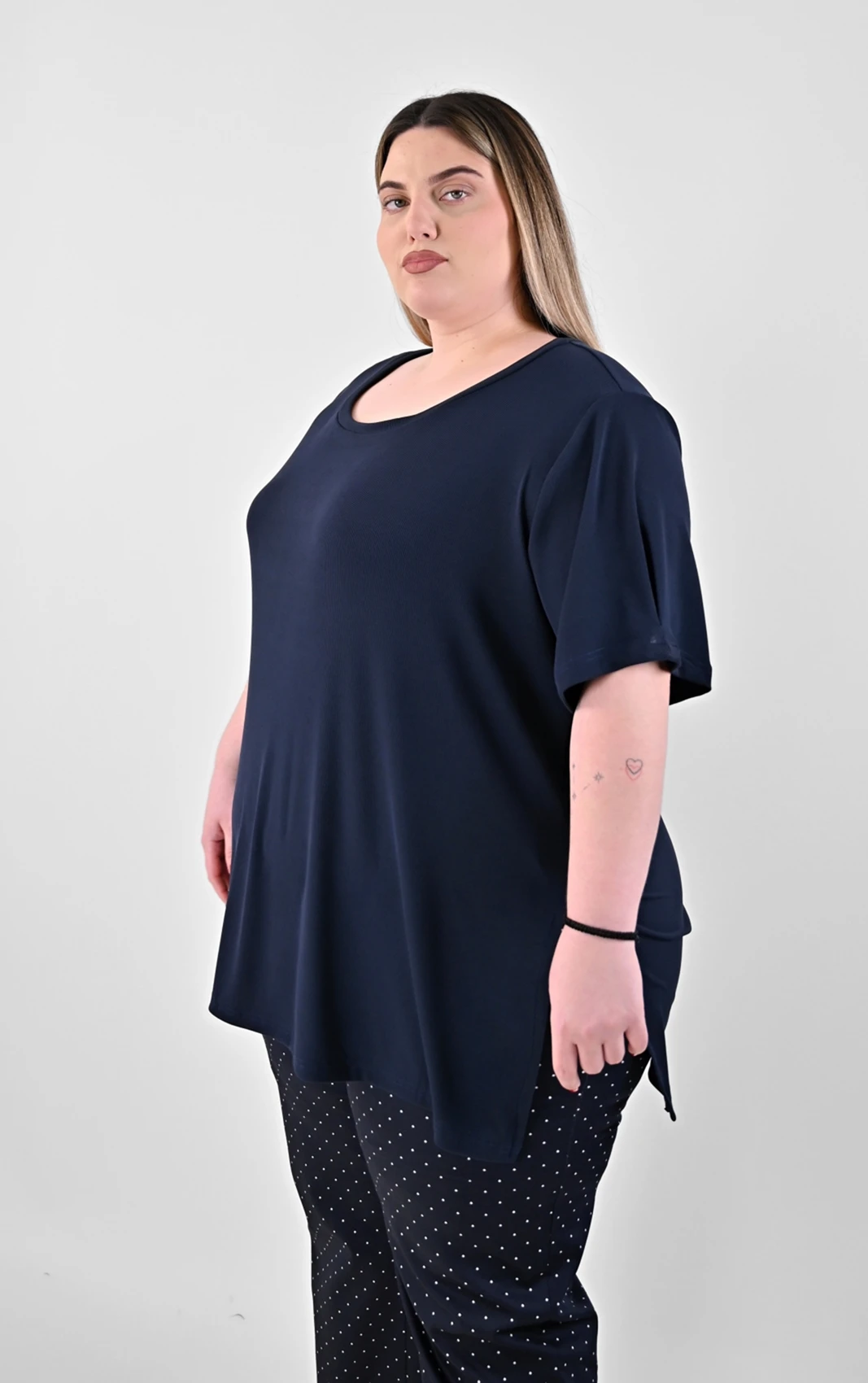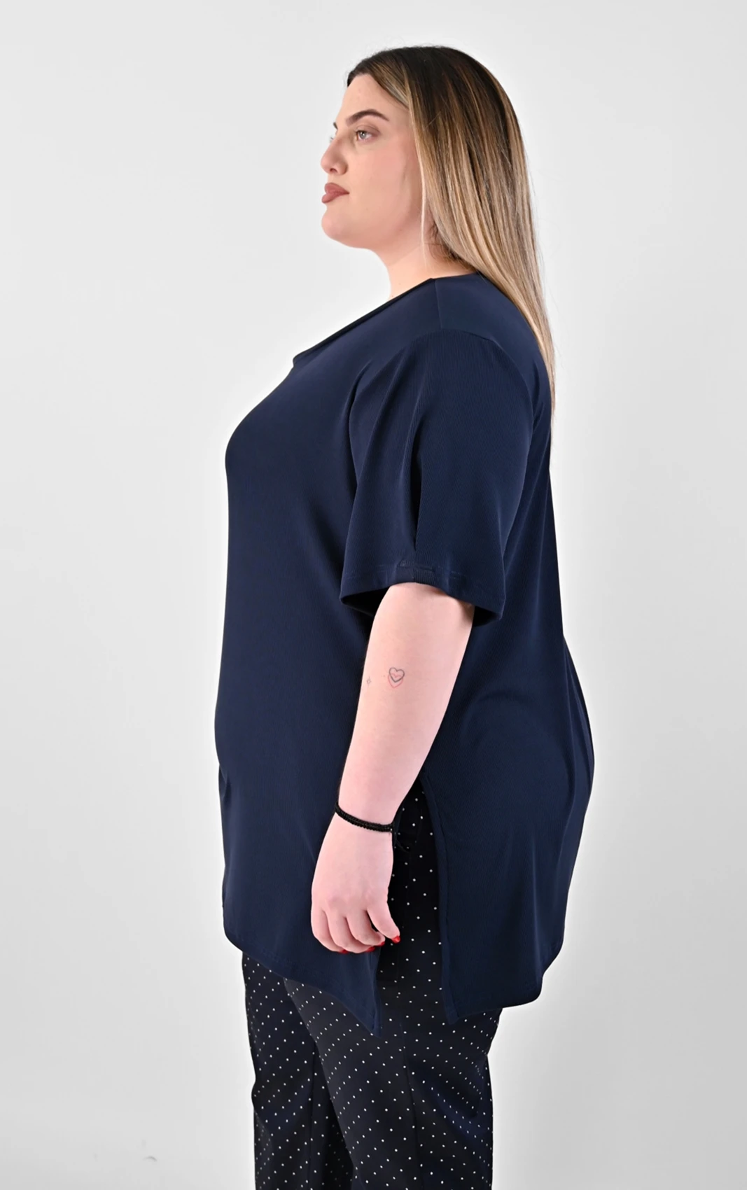 Μπλε Σκούρο Κοντομάνικη Μπλούζα με Πλαινά Ανοίγματα