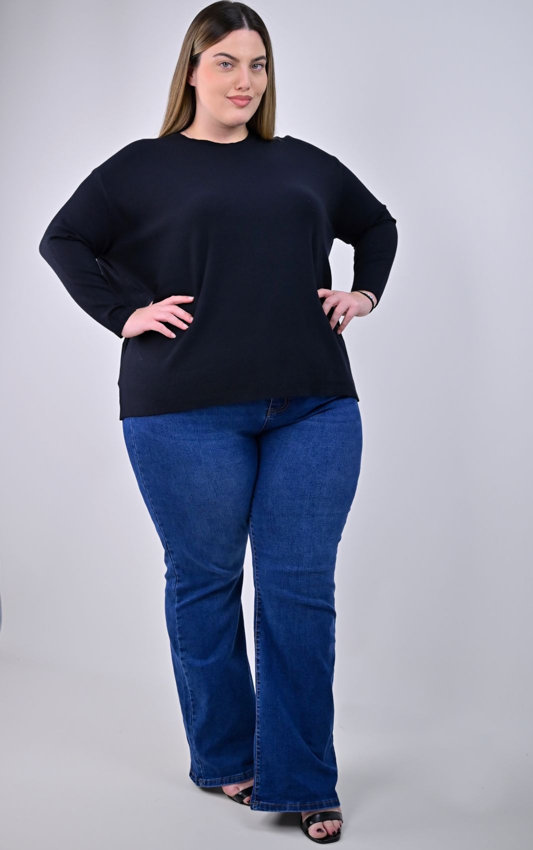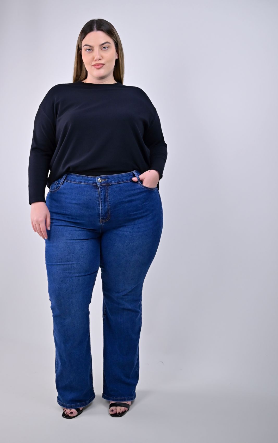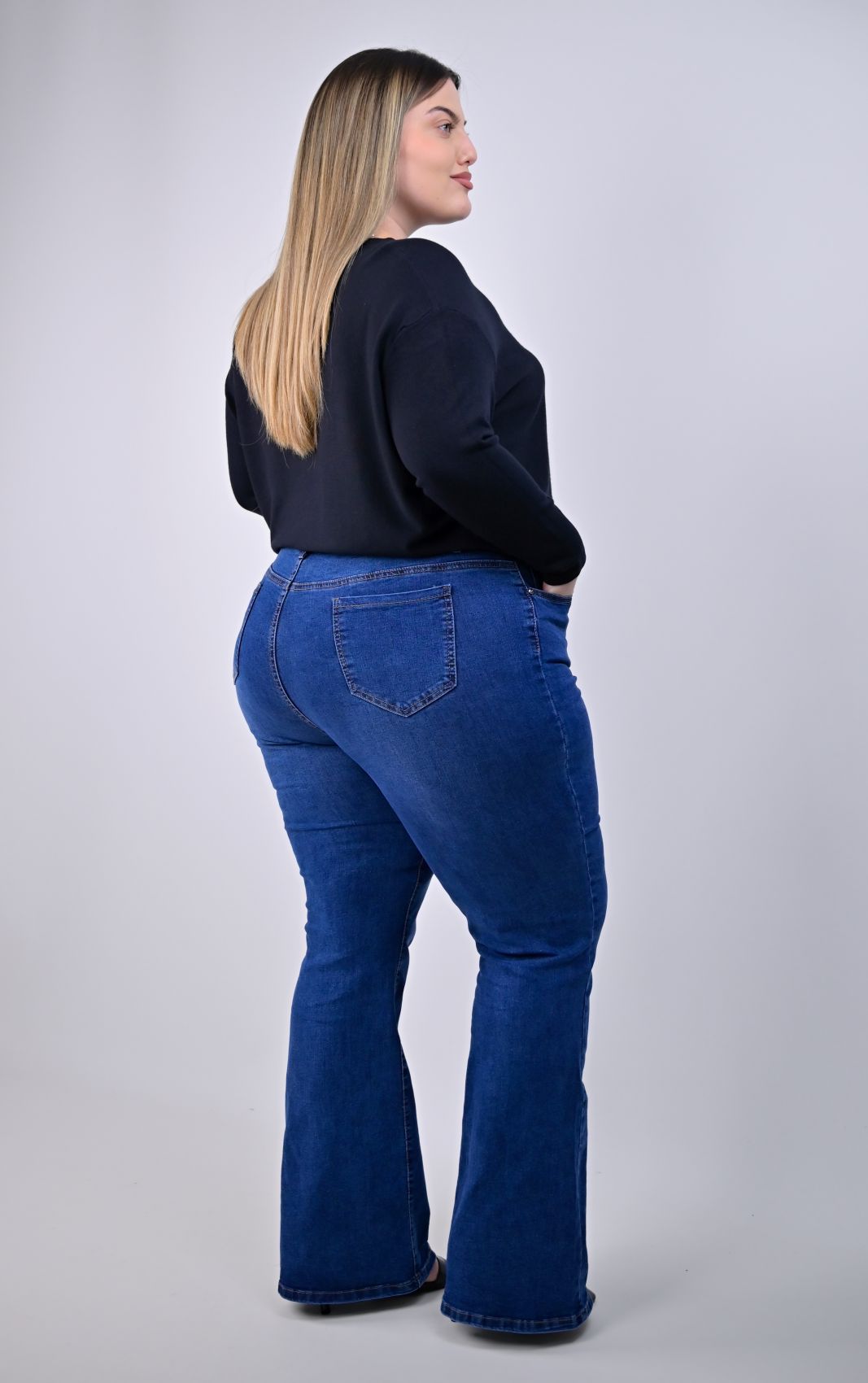 Αυτό το plus size μπλε τζιν καμπάνα είναι το διαχρονικό κομμάτι που δεν πρέπει να λείπει από την γκαρνταρόμπα σας. Συνδυάζει το ρετρό στυλ με τη μοντέρνα άνεση και είναι σχεδιασμένο για να κολακεύει τις καμπύλες, ενώ το ψηλόμεσο κόψιμό του προσφέρει άψογη εφαρμογή.