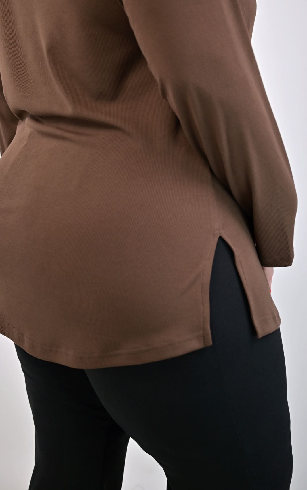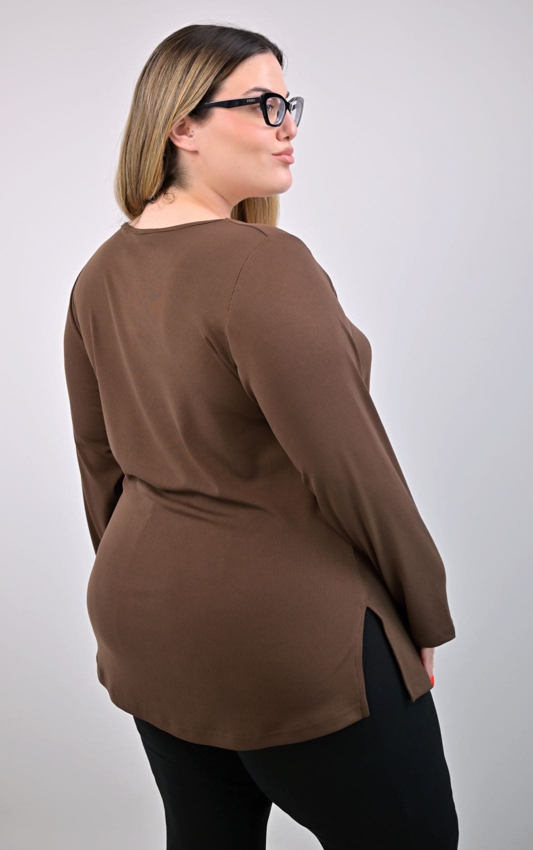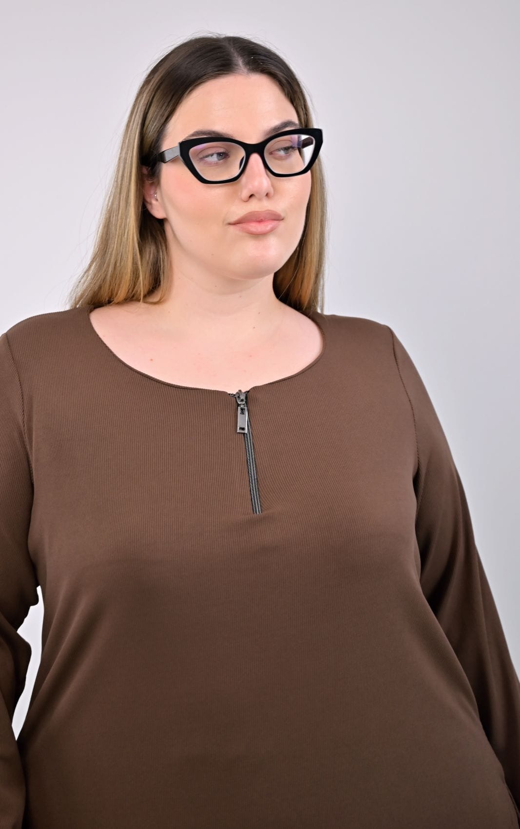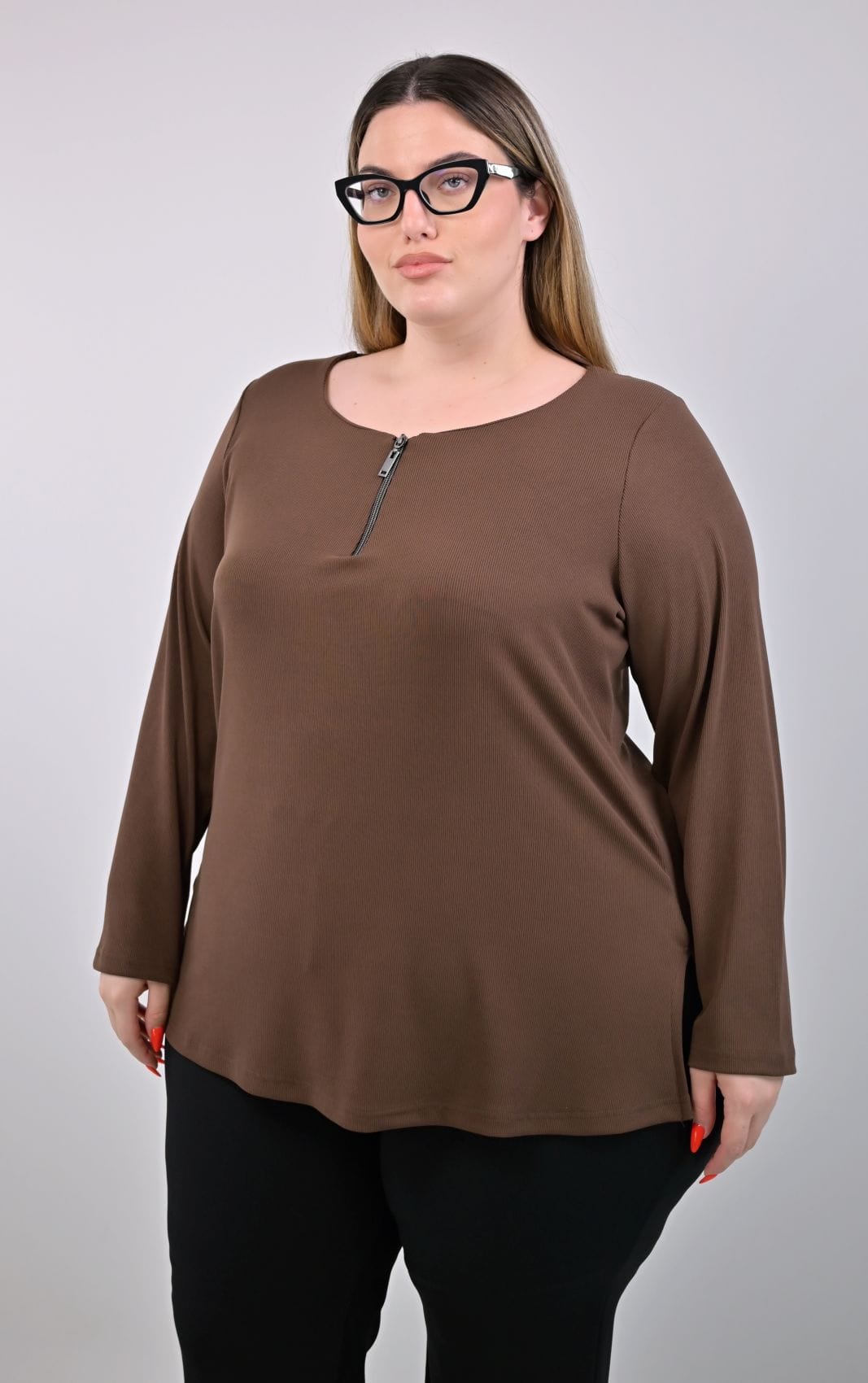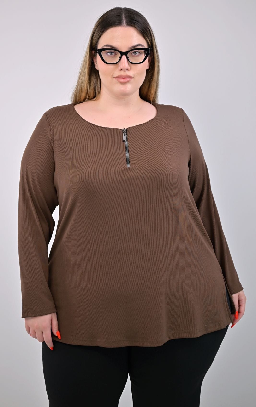 Αυτή η plus size μπλούζα καφέ είναι μια εξαιρετική προσθήκη στην γκαρνταρόμπα σας, προσφέροντας μια γήινη και ταυτόχρονα μοντέρνα πινελιά. Ο σχεδιασμός της με τη στρογγυλή λαιμόκοψη που καταλήγει σε διακριτικό φερμουάρ, την καθιστά ιδανική για κάθε περίσταση, από την καθημερινότητα μέχρι τις πιο ιδιαίτερες στιγμές.