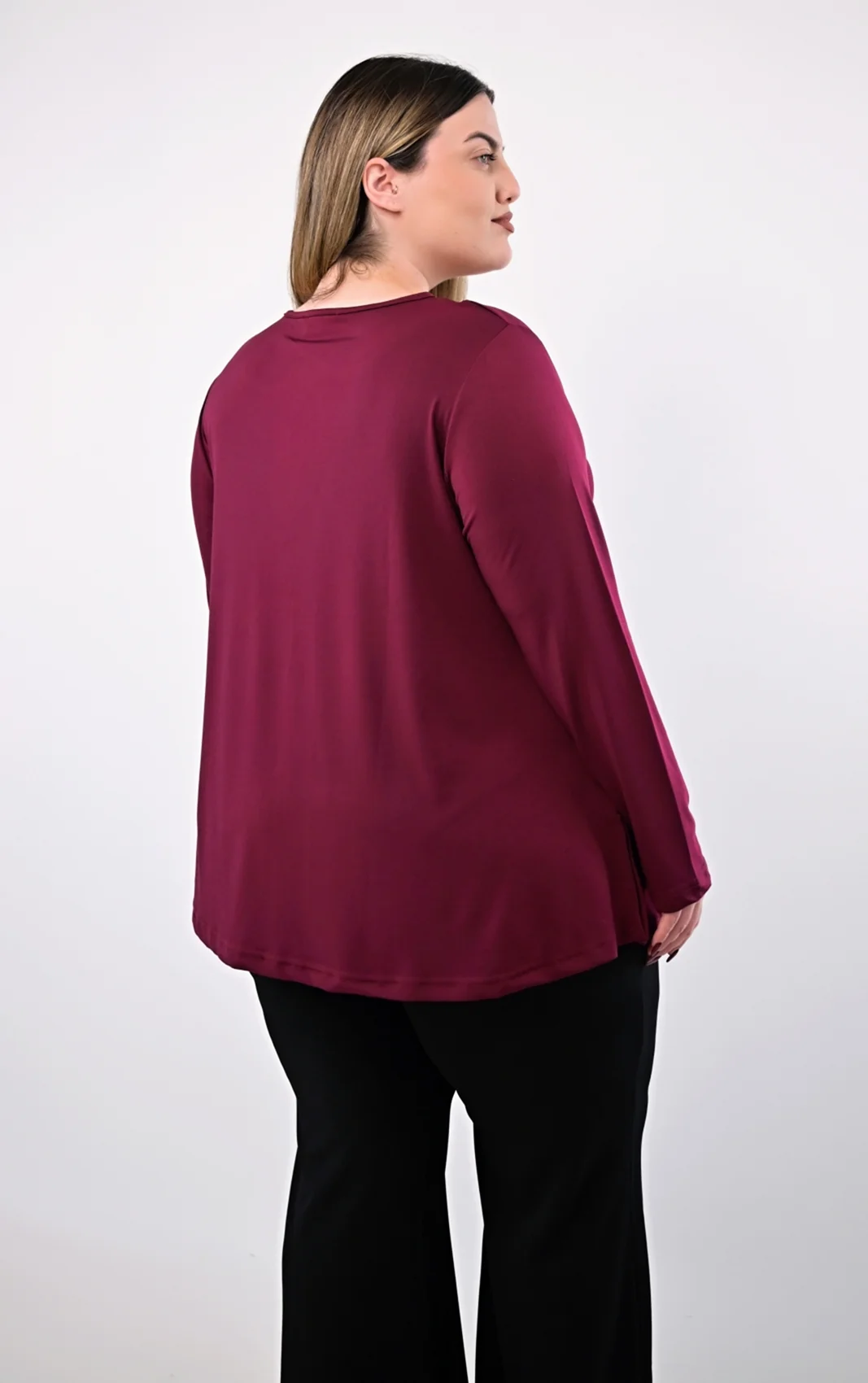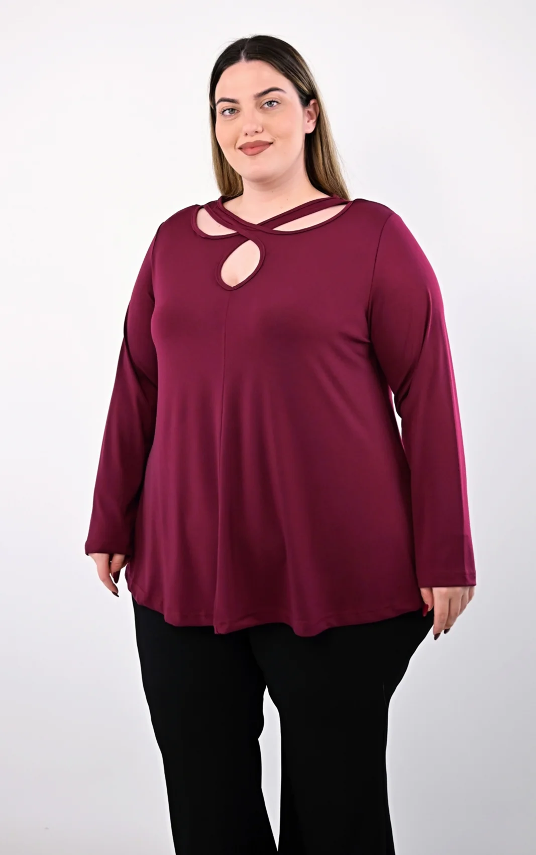 Ανανεώστε την γκαρνταρόμπα σας με αυτή τη plus size μοντέρνα μπλούζα σε βαθύ, ζεστό μπορντό χρώμα.