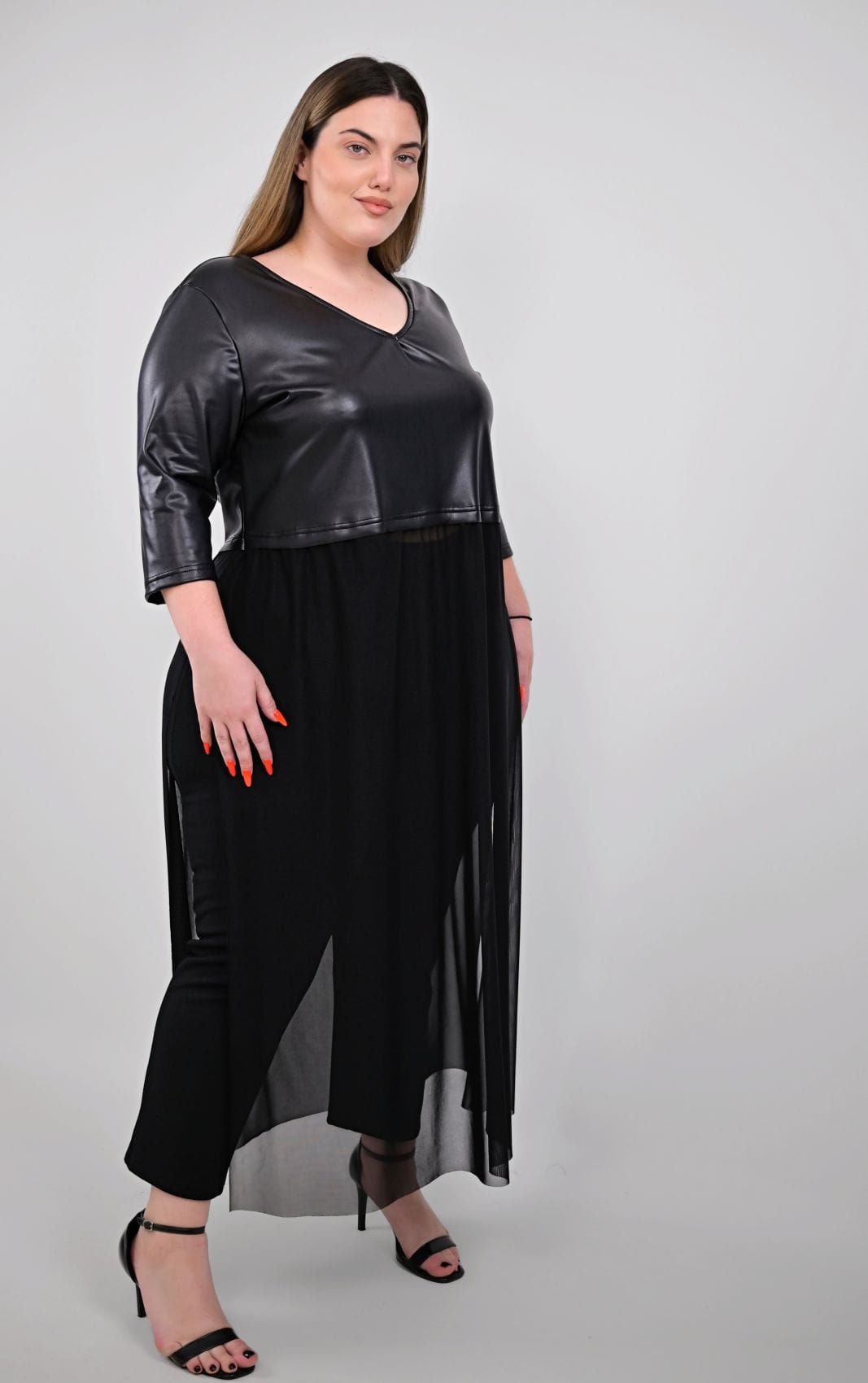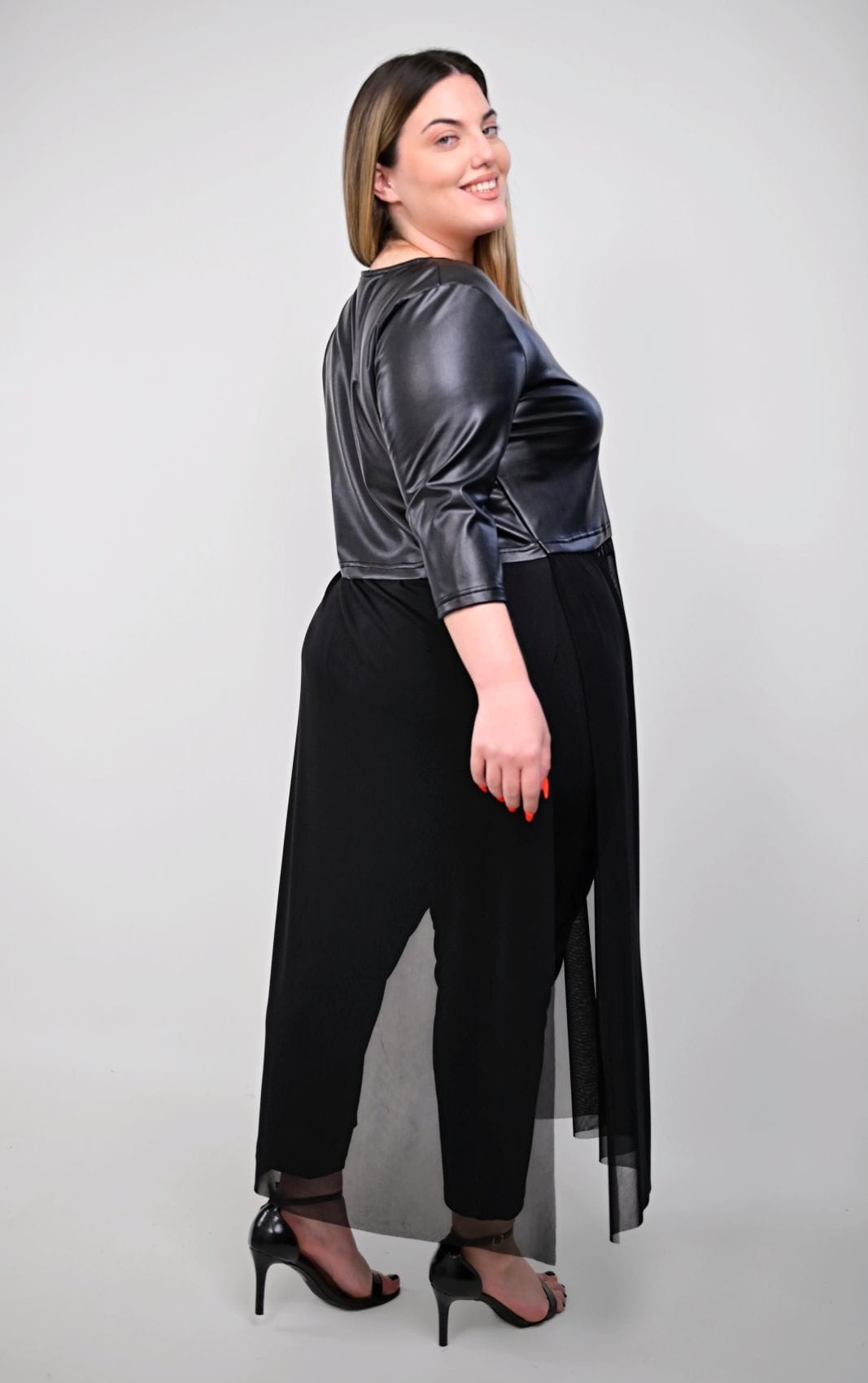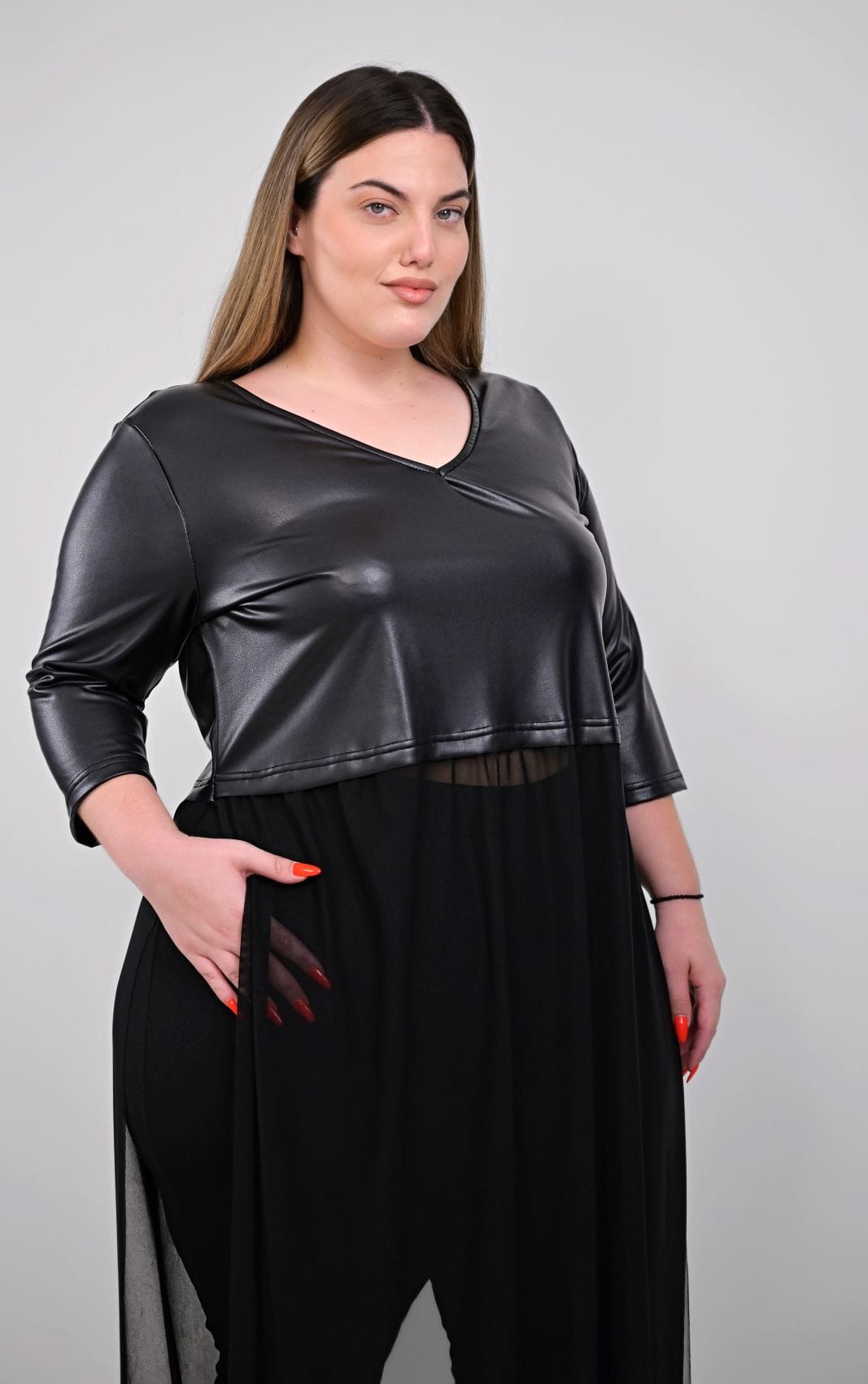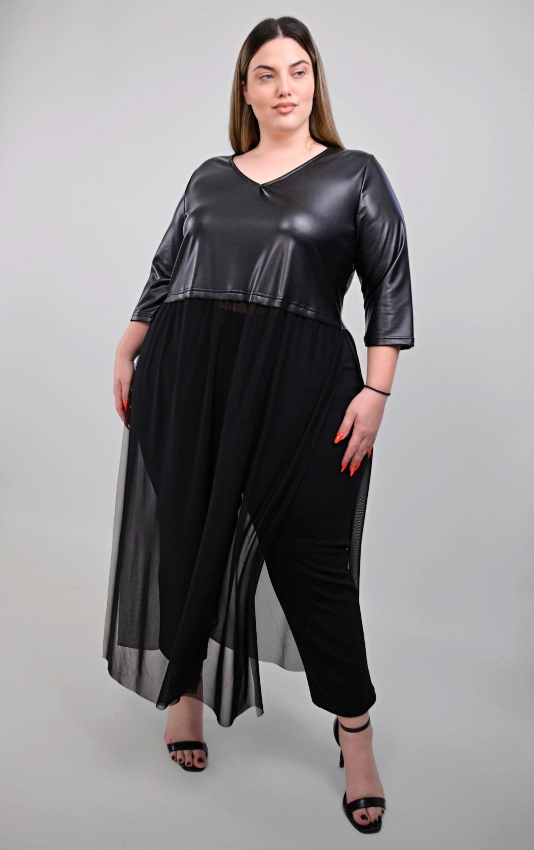 Το πάνω μέρος του μπλουζοφορέματος, κατασκευασμένο από μαλακή δερματίνη, διαθέτει μια κολακευτική V-λαιμόκοψη που αναδεικνύει τον λαιμό και το ντεκολτέ. Τα τρουάκαρ μανίκια προσθέτουν μια chic λεπτομέρεια, ενώ η εφαρμογή του είναι άνετη και δυναμική. Περίπου μέχρι τη μέση των μηρών, το δερματίνη μέρος δίνει τη σκυτάλη στο κάτω μέρος, το οποίο αποτελείται από μακρύ, διάφανο τούλι. Το τούλι πέφτει ανάλαφρα, δημιουργώντας μια αέρινη σιλουέτα που κολακεύει κάθε plus size σωματότυπο και προσδίδει κίνηση και δραματικότητα στο σύνολο. Η άνετη γραμμή του μπλουζοφορέματος επιτρέπει πλήρη ελευθερία κινήσεων, ενώ οι ανοιχτές πλευρές του τούλιου ενισχύουν αυτή την αίσθηση και προσθέτουν στυλ.