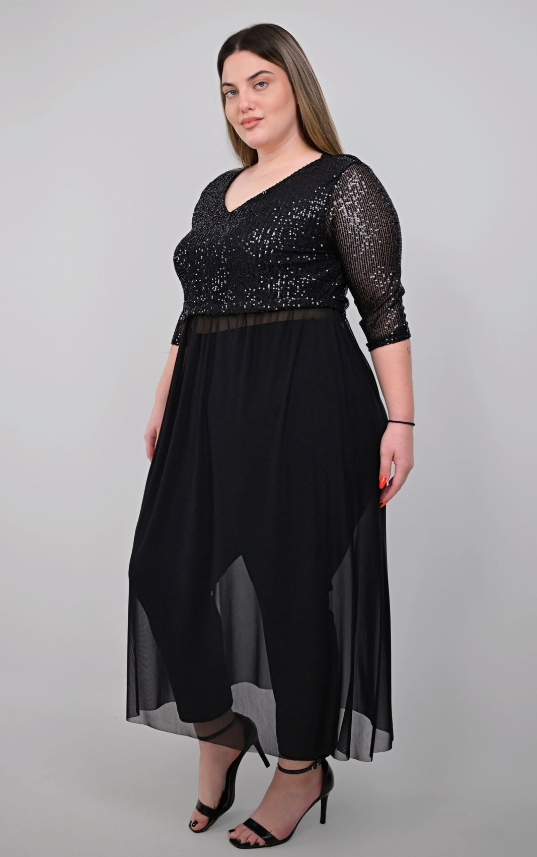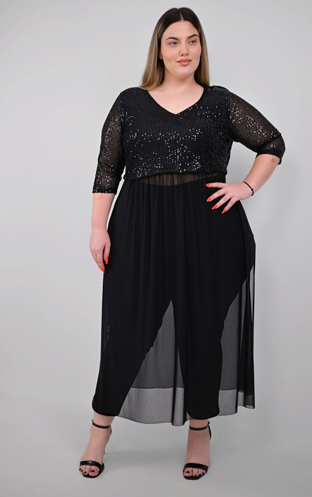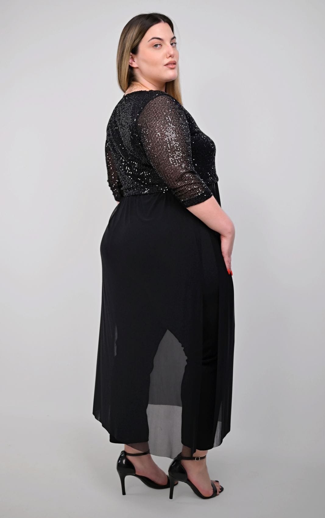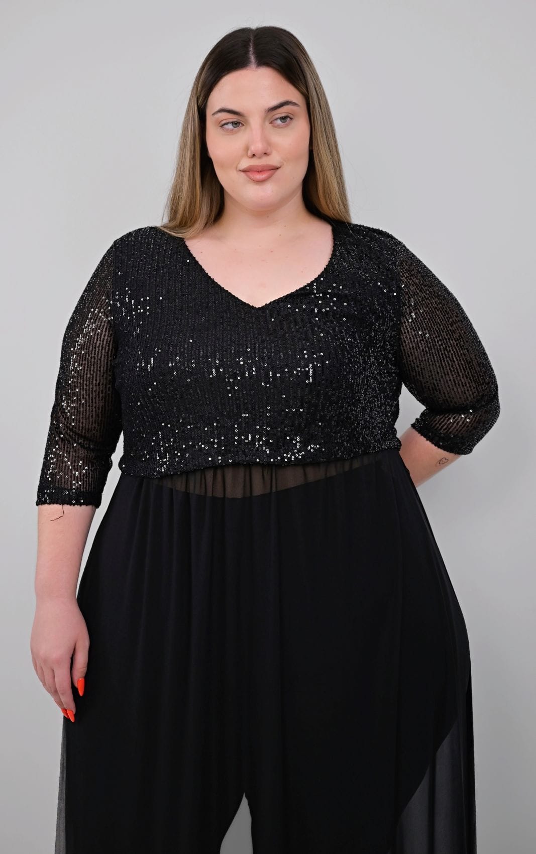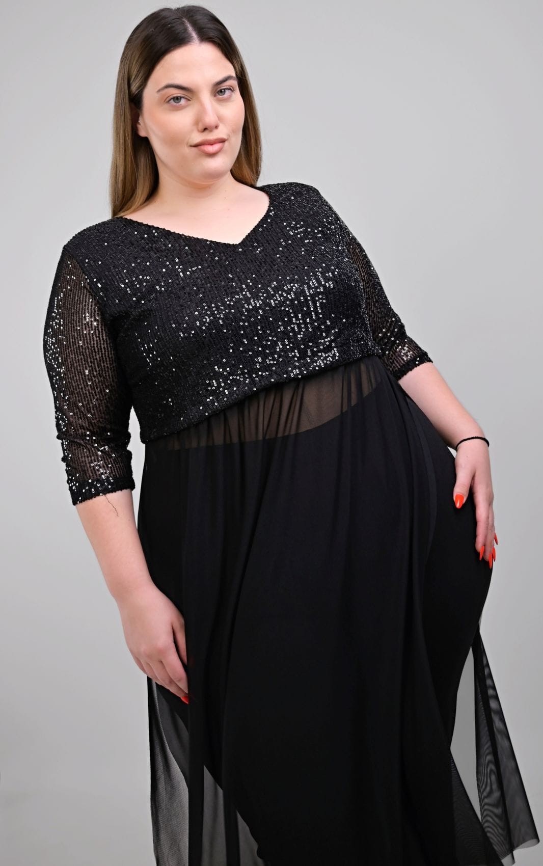 Απογειώστε το βραδινό σας στυλ με αυτό το λαμπερό μαύρο plus size μπλουζοφόρεμα, που συνδυάζει την εκθαμβωτική λάμψη των παγιέτας με την αέρινη κομψότητα του τούλι. Σχεδιασμένο για να προσφέρει άνεση και μια εντυπωσιακή εμφάνιση, είναι η ιδανική επιλογή για πάρτι, επίσημες εκδηλώσεις ή οποιαδήποτε περίσταση θέλετε να ξεχωρίσετε, φορεμένο πάνω από ένα παντελόνι ή κολάν.
