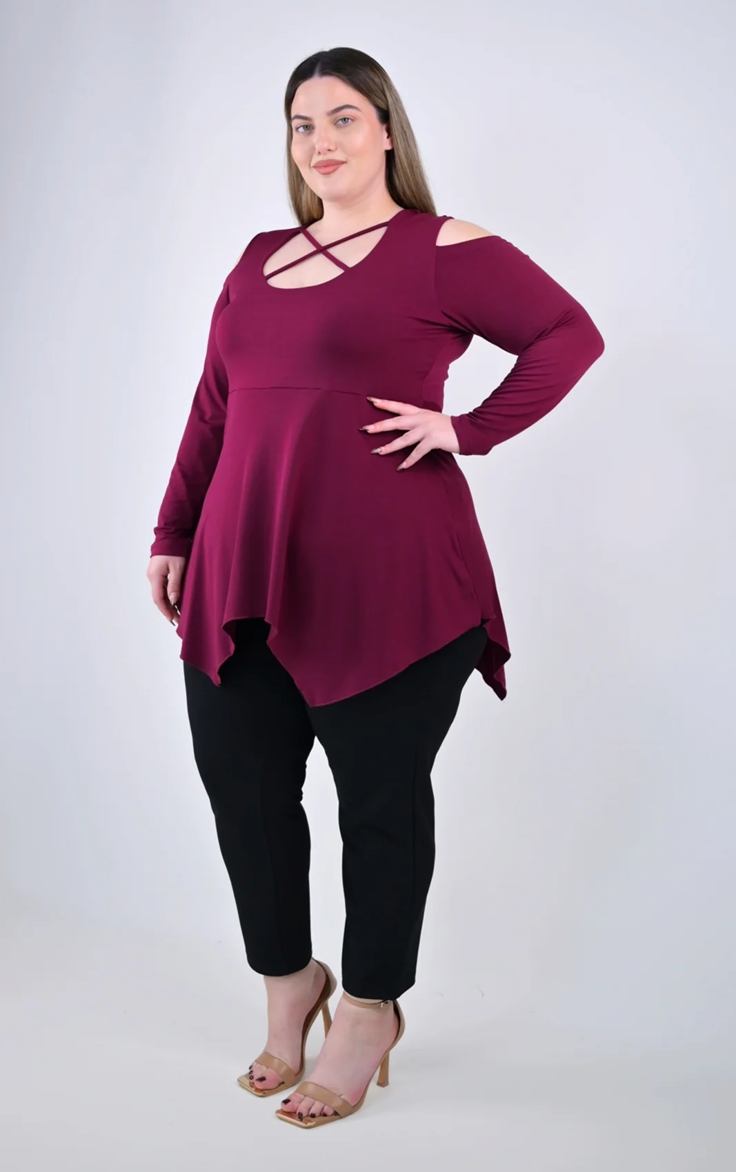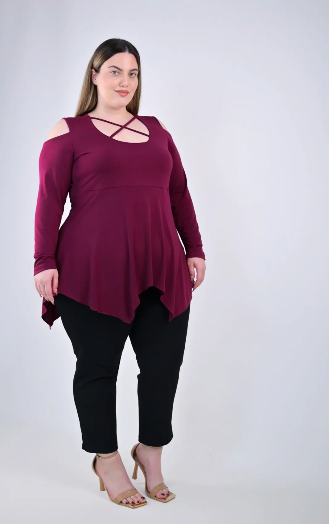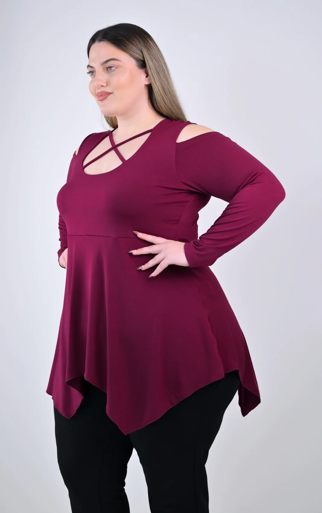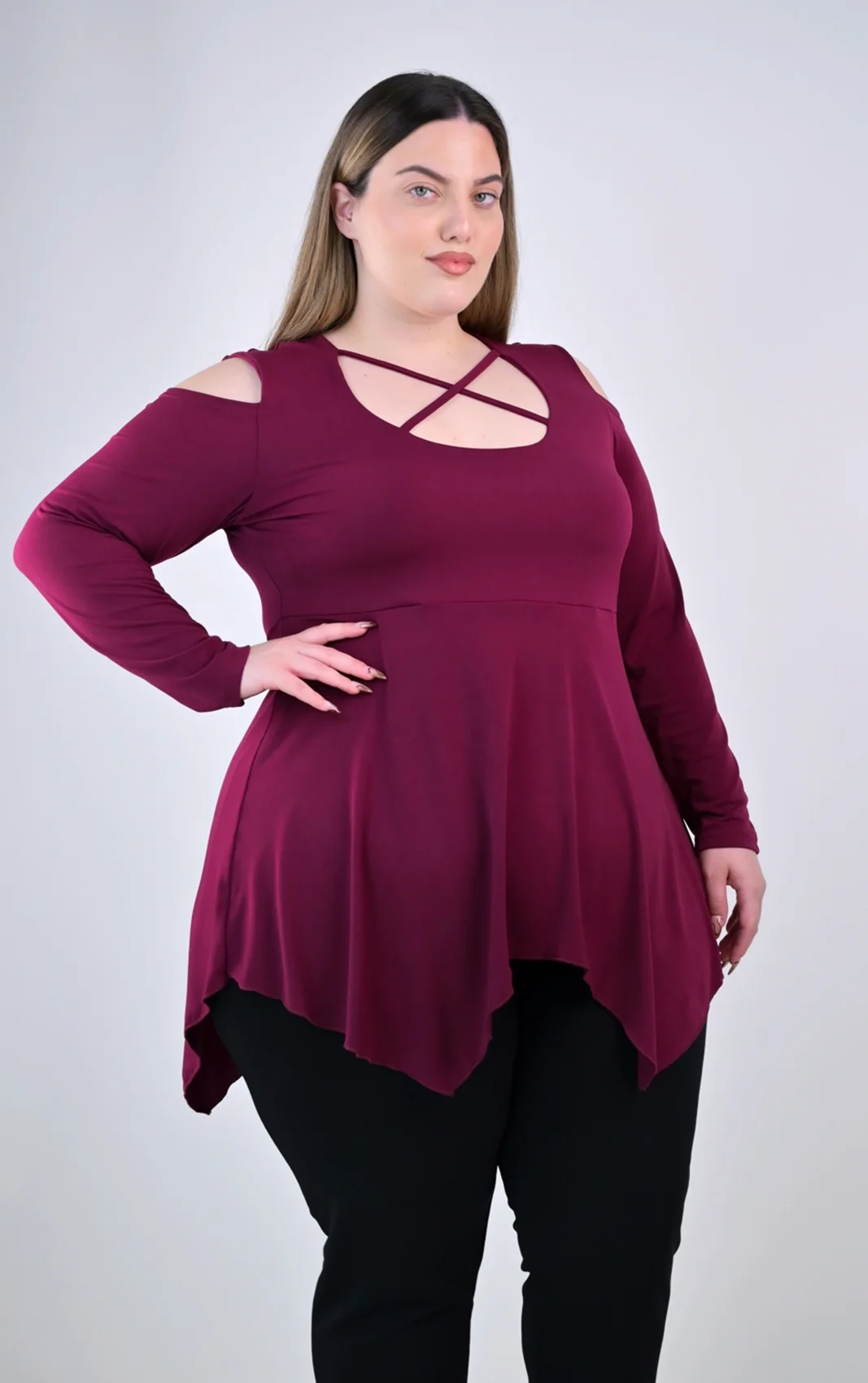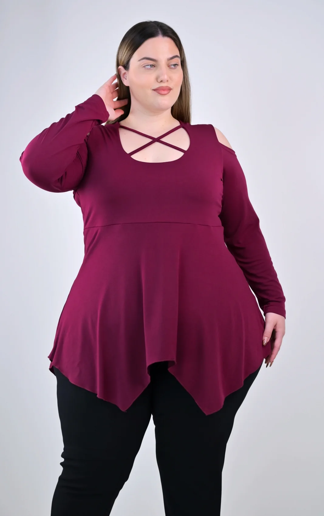 Ασύμμετρη Μπορντό Μπλούζα με Χιαστί Ντεκολτέ