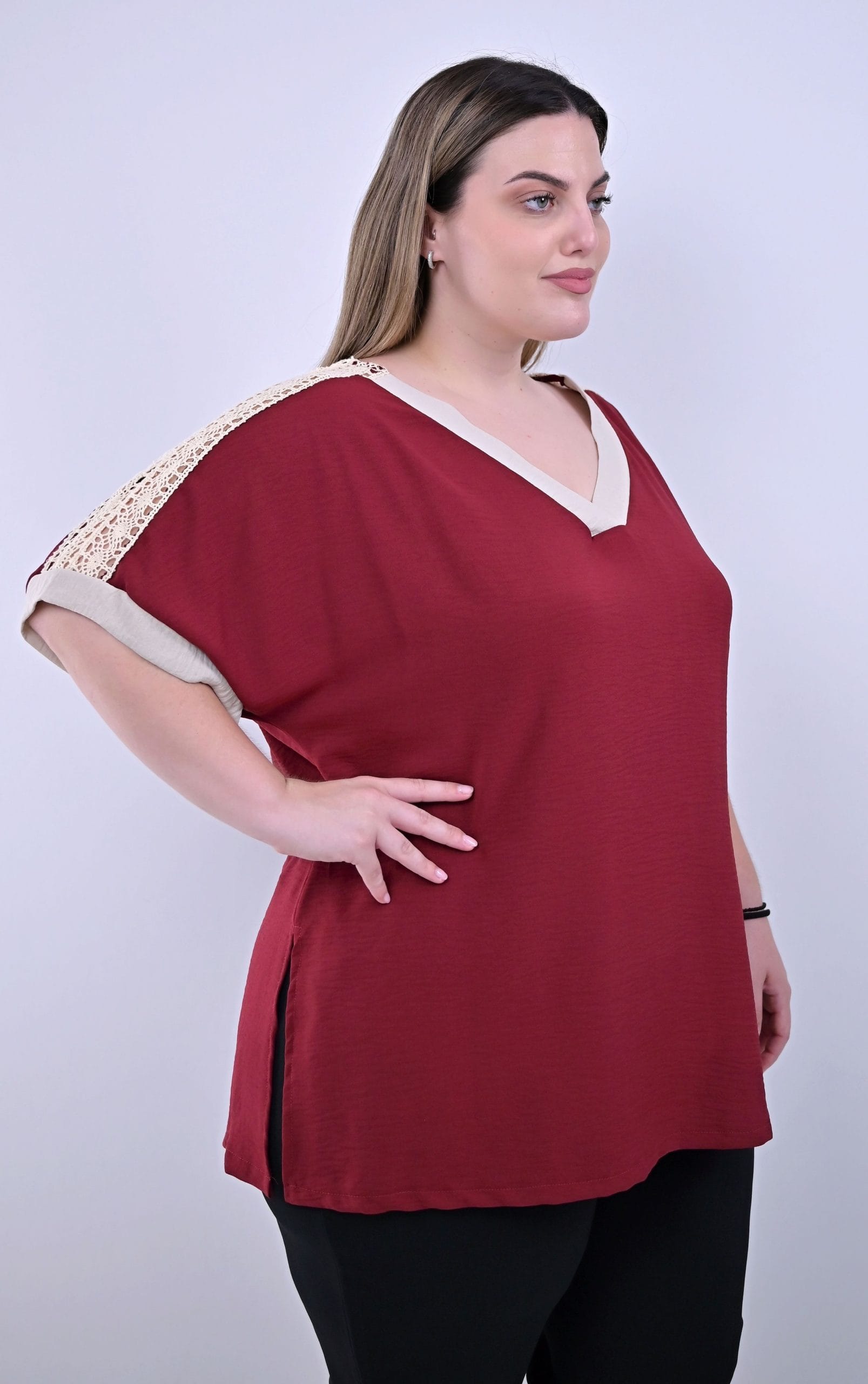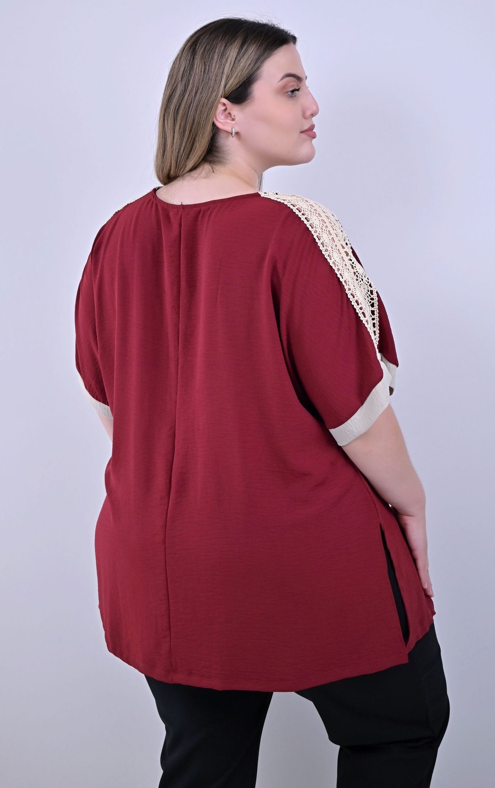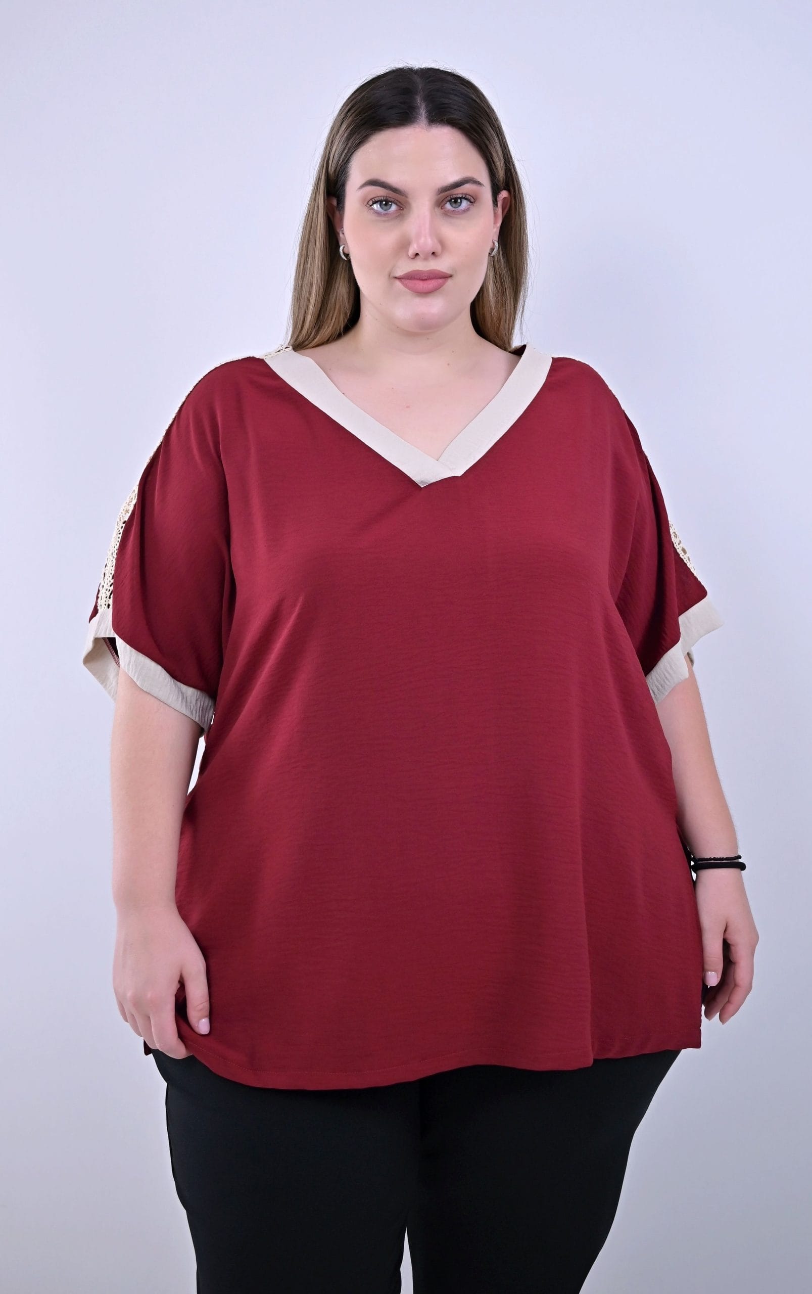 Plus size μπλούζα σε μπορντό χρώμα, κατασκευασμένη από ελαφρώς τσαλακωτό ύφασμα που προσφέρει άνετη εφαρμογή και ελαστικότητα.