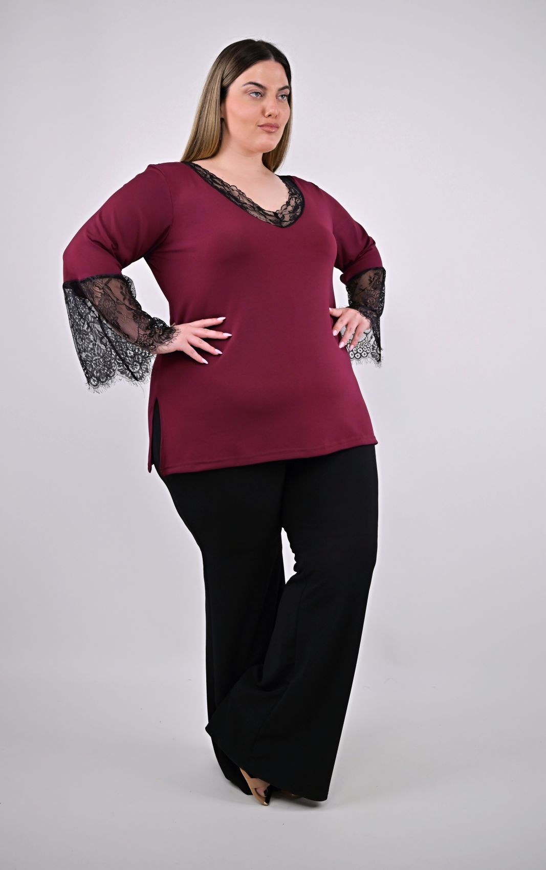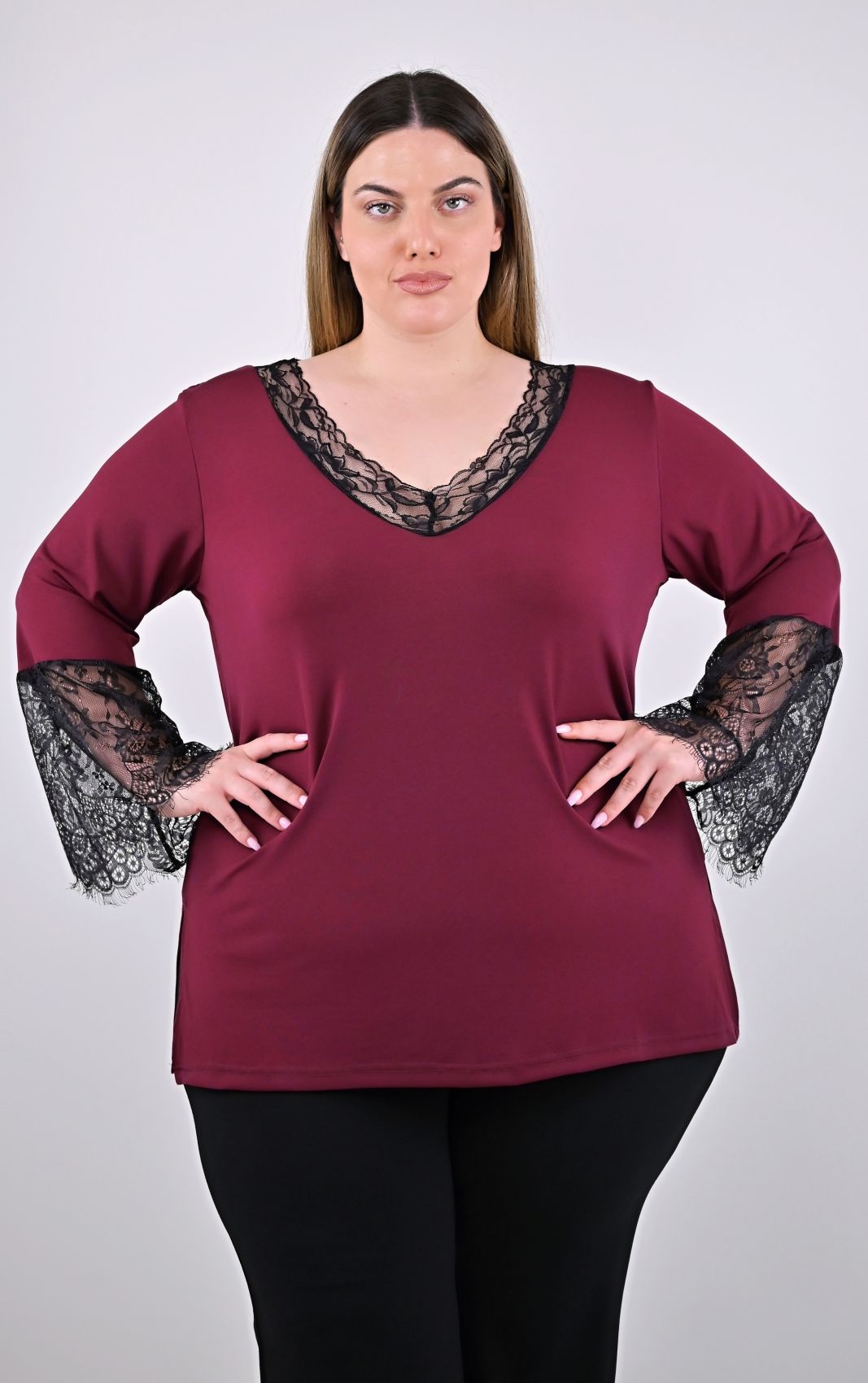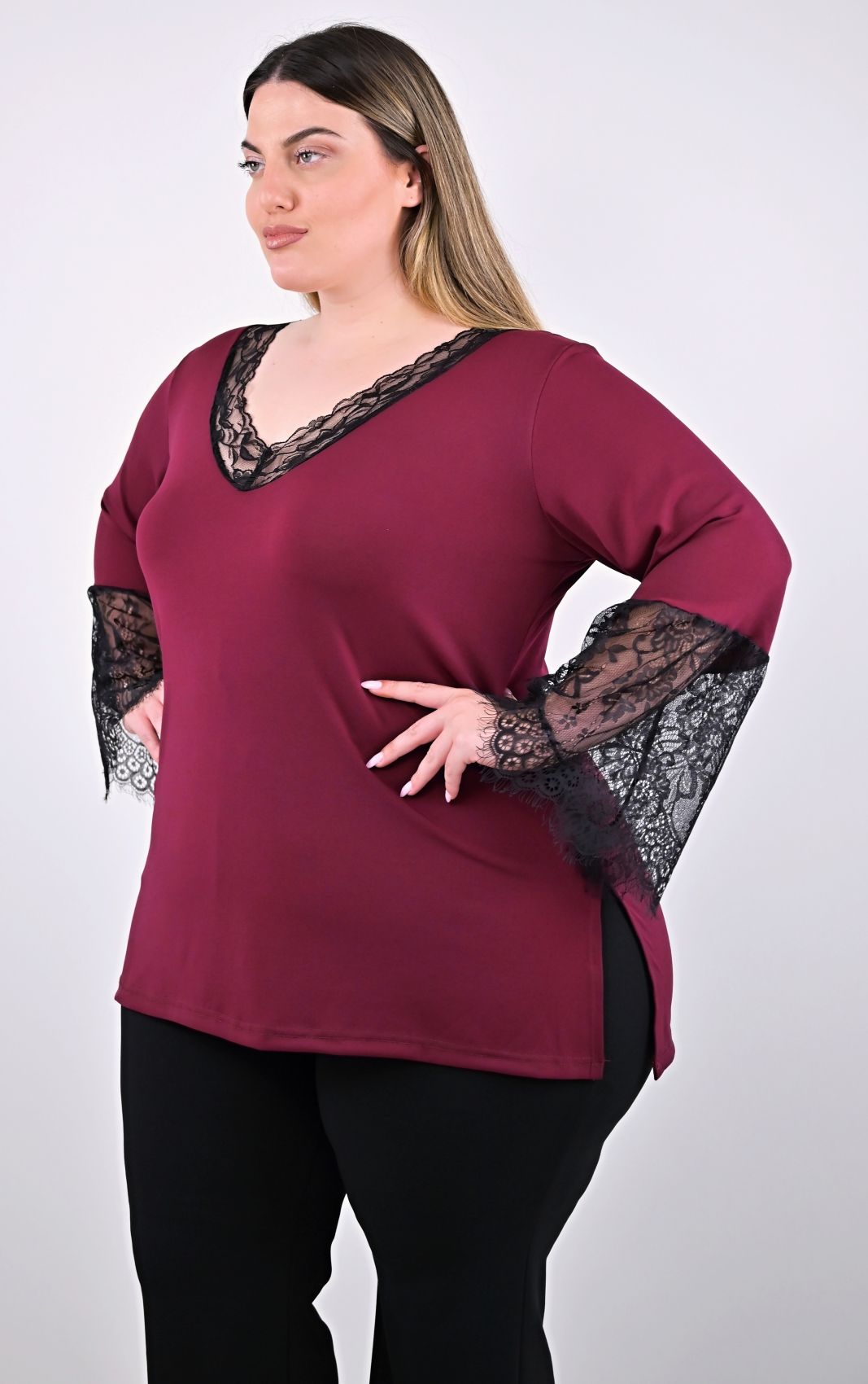 Μπορντό Μπλούζα με Λεπτομέρειες Δαντέλας