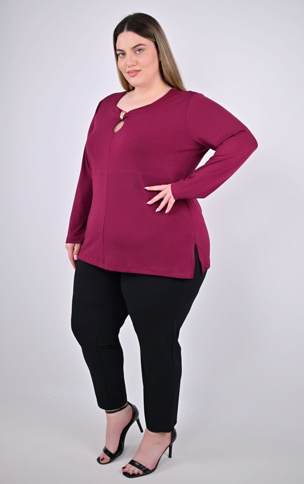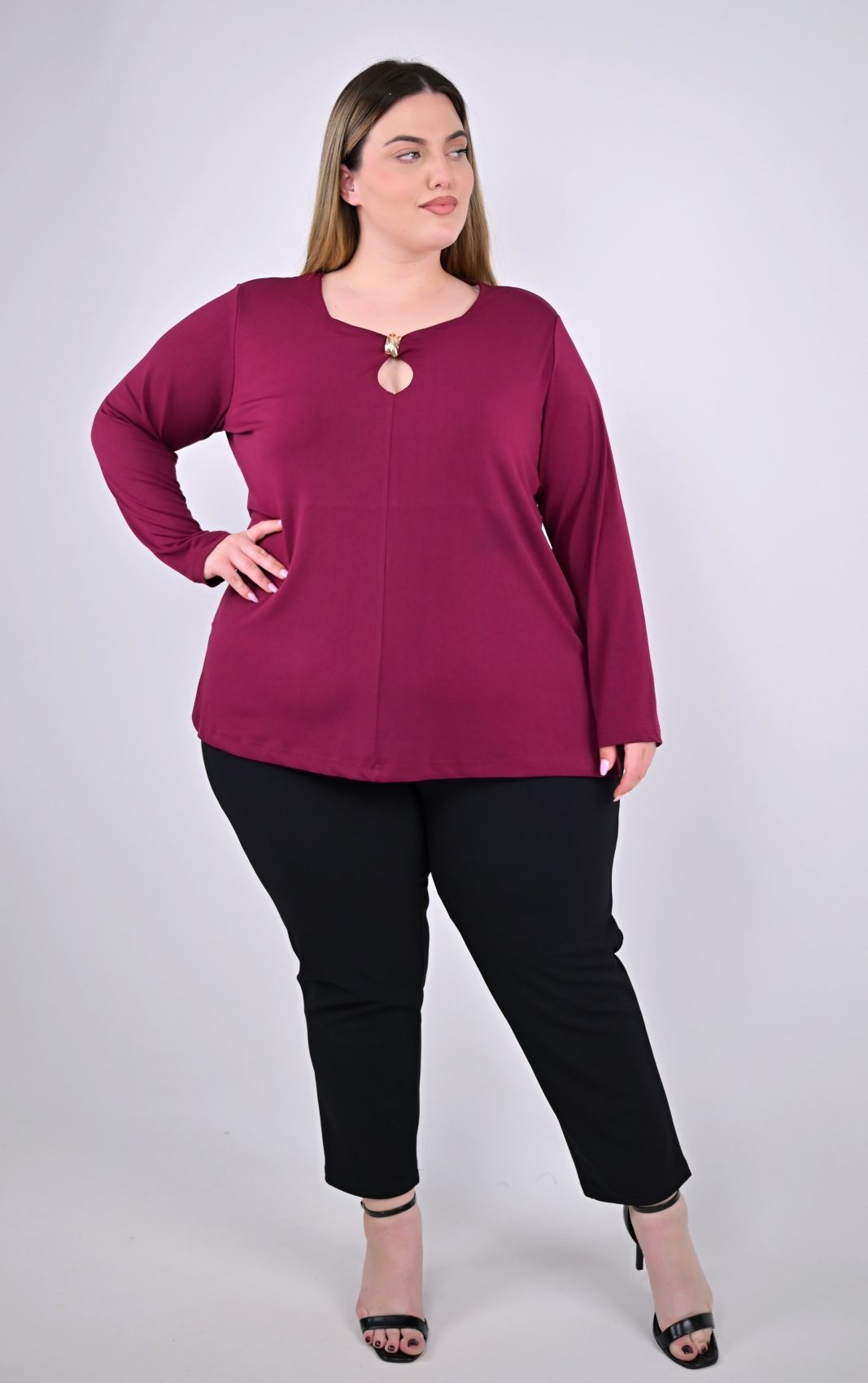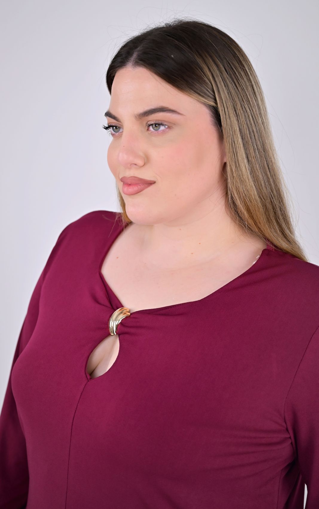 Προσθέστε μια μοντέρνα και ξεχωριστή πινελιά στην γκαρνταρόμπα σας με αυτή την plus size μπορντό μπλούζα. Η κομψή χρυσή μεταλλική λεπτομέρεια στο ντεκολτέ δημιουργεί ένα statement κομμάτι, ιδανικό για να σας συνοδεύσει σε κάθε περίσταση, από μια επαγγελματική εμφάνιση μέχρι μια έξοδο.
