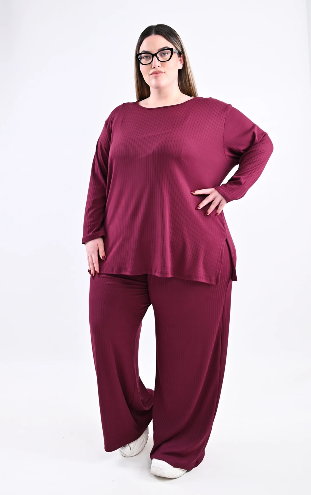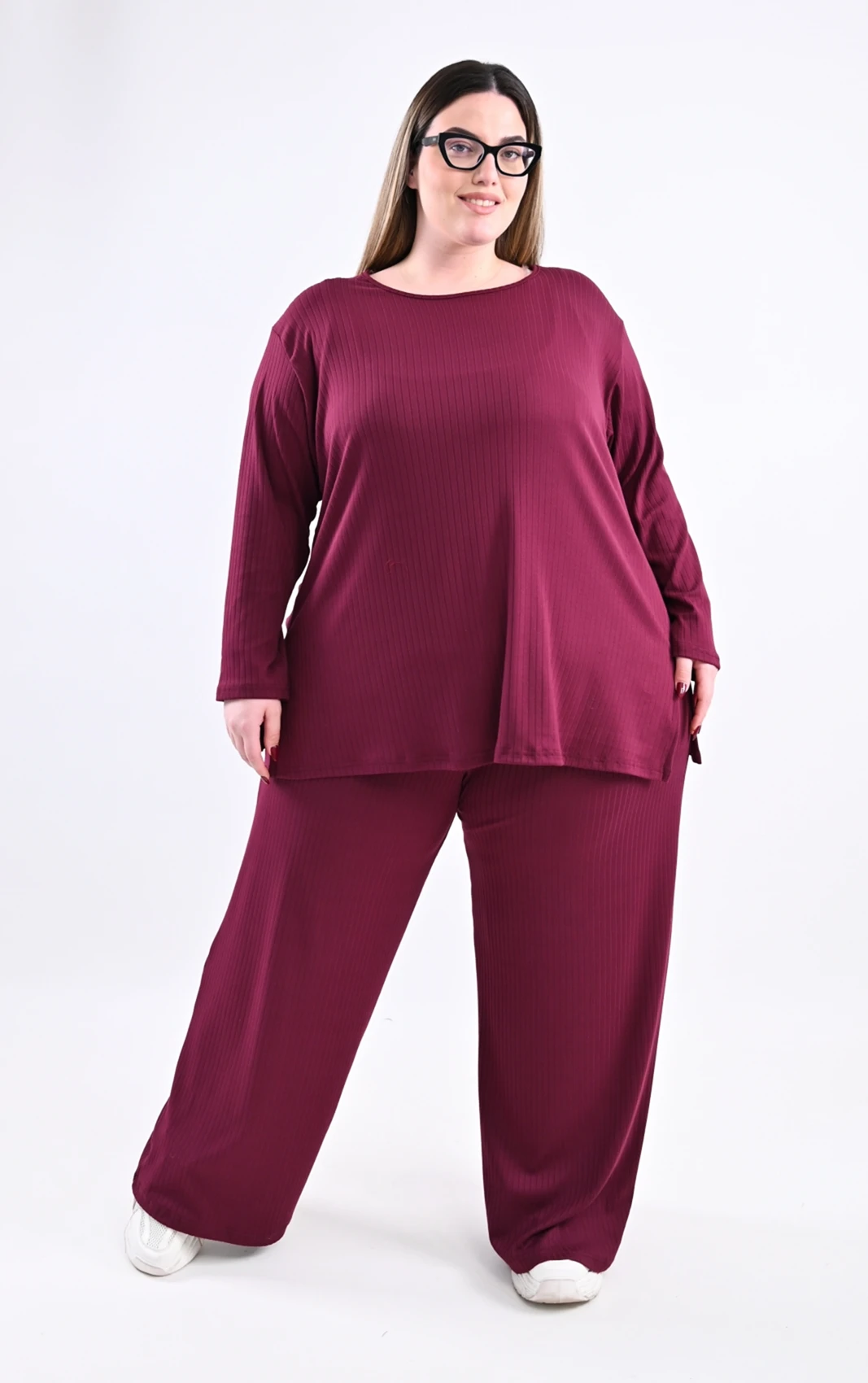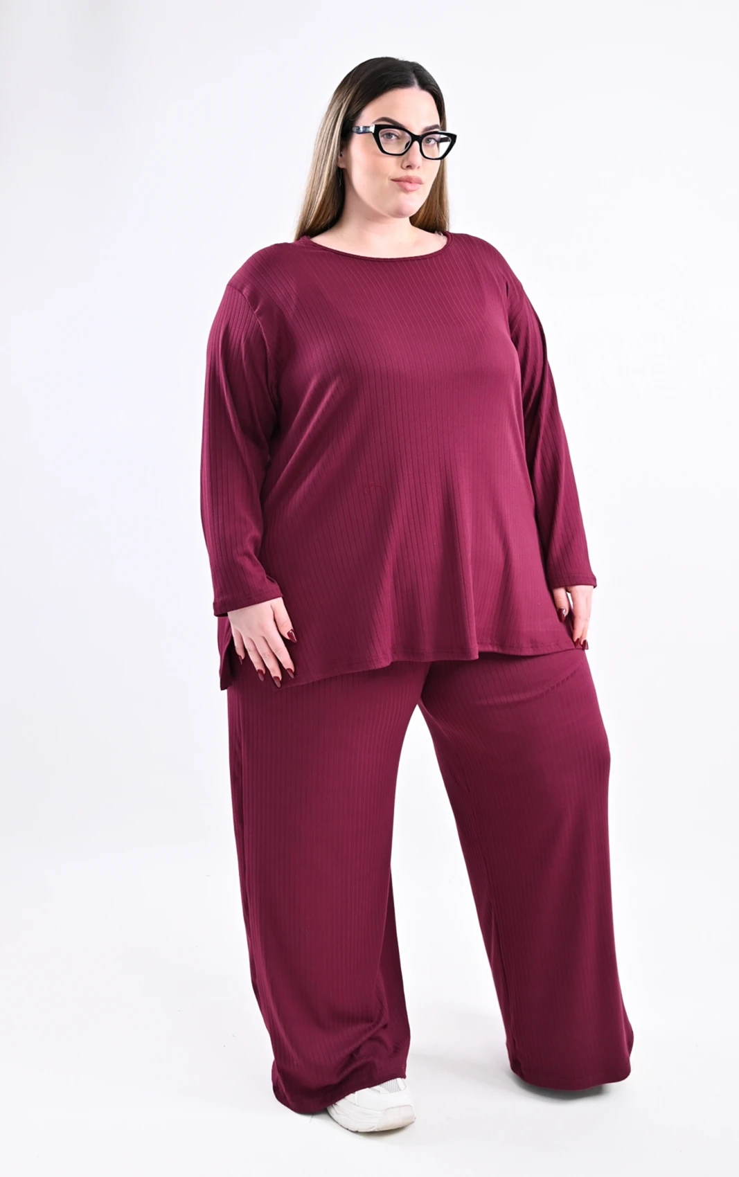Ανακαλύψτε αυτό το υπέροχο σετ δύο τεμαχίων. Σχεδιασμένο για να προσφέρει μια χαλαρή και ταυτόχρονα καλόγουστη εμφάνιση, είναι η ιδανική επιλογή για την γυναίκα που θέλει να νιώθει άνετα και όμορφα όλη μέρα. Η απαλή, ριπ πλέξη του έχει υπέροχη υφή και κίνηση, ενώ το πλούσιο μπορντό χρώμα του είναι ζεστό, διαχρονικό και εντυπωσιακό.