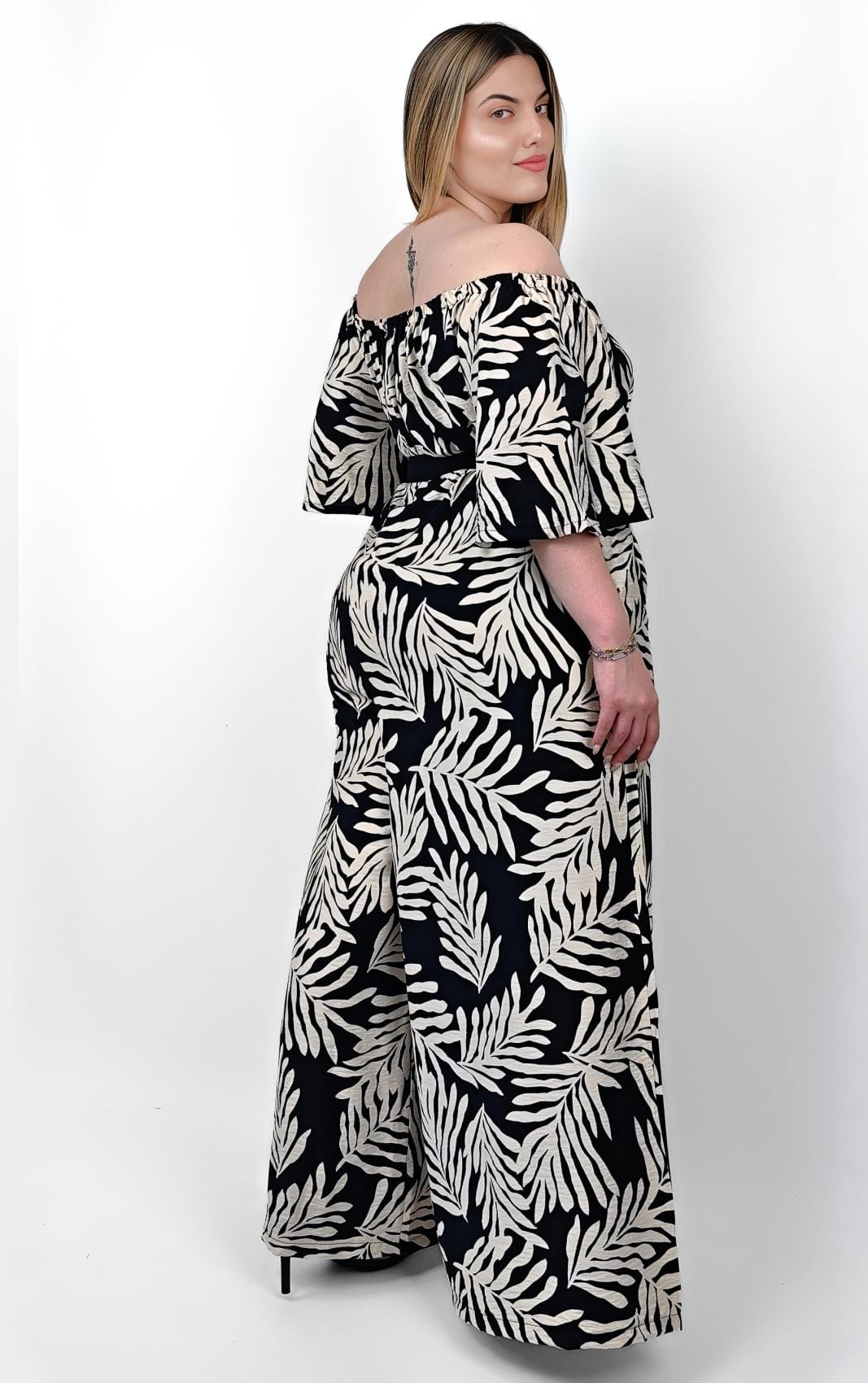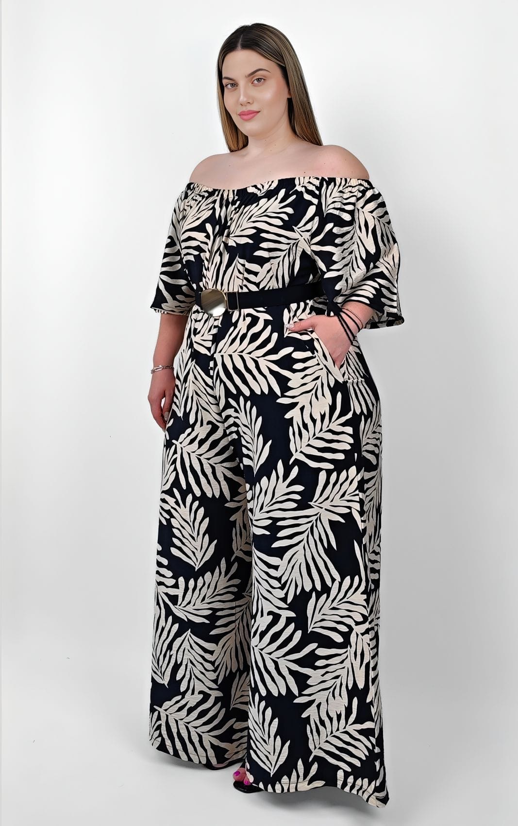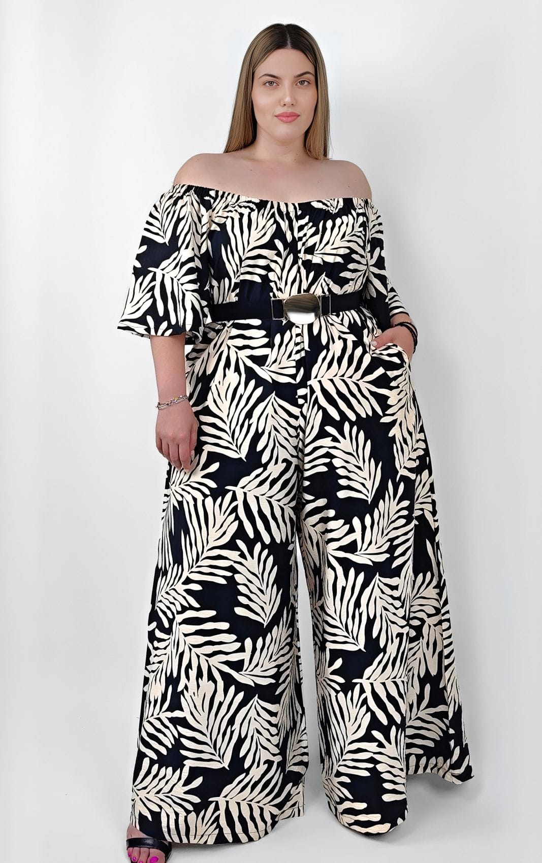 Η plus size ολόσωμη φόρμα μαύρη με print φύλλων ξεχωρίζει για το έντονο σχέδιό της σε εκρού αποχρώσεις και τη χαλαρή, σταθερή εφαρμογή της. Το μαύρο φόντο με print φύλλων δημιουργεί ξεκάθαρη αντίθεση χωρίς υπερβολές.