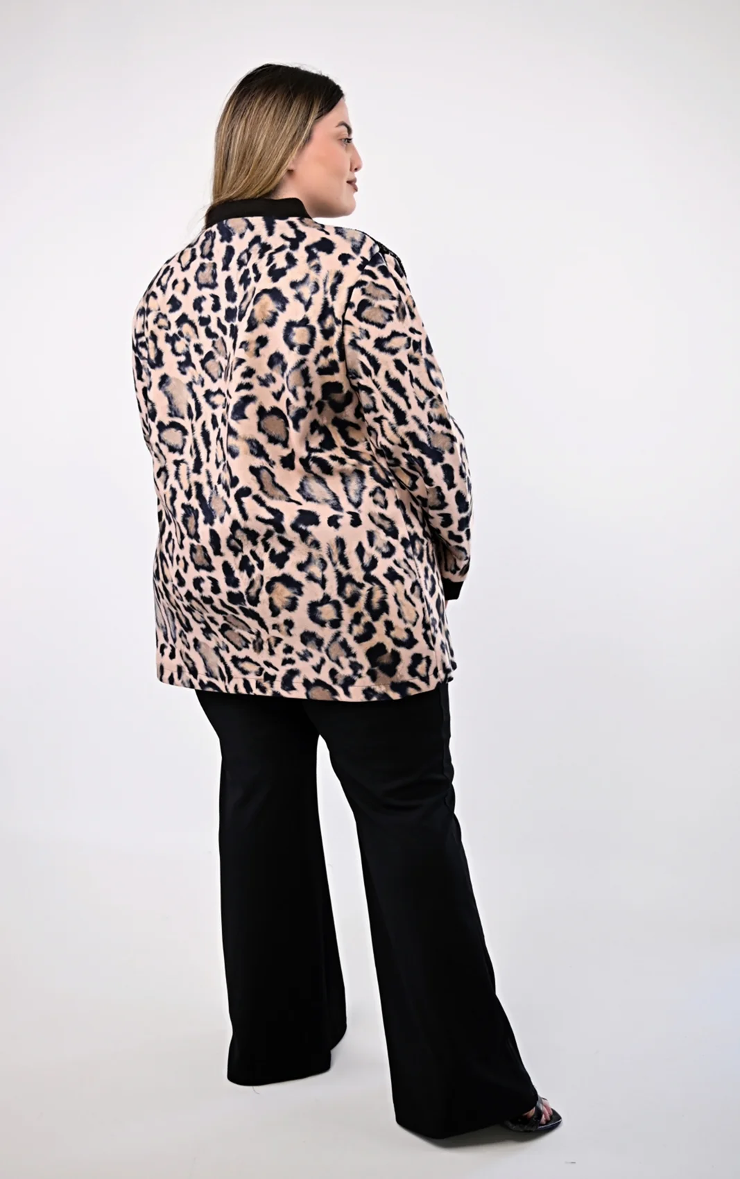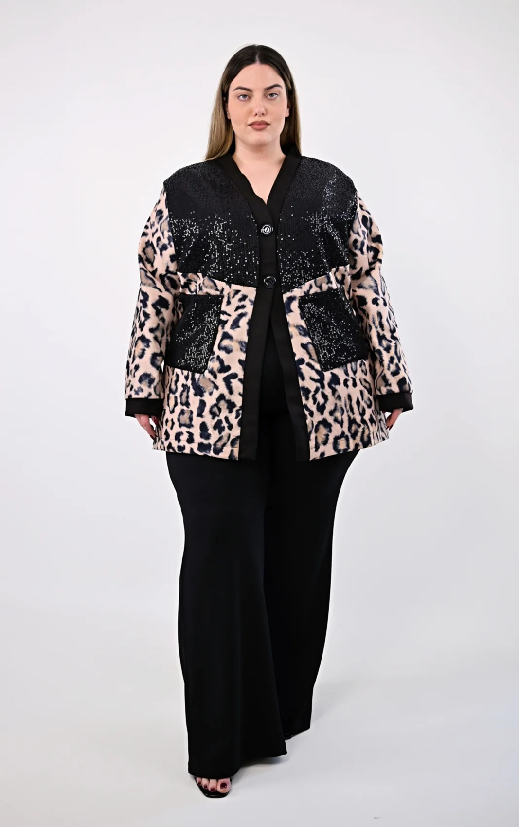 Η παλτοζακέτα συνδυάζει δύο υφές: ποιοτικό ύφασμα με animal print (λεοπάρ) σε όλο το μήκος των μανικιών και την πλάτη, με μαύρες παγιέτες στο μπροστινό κεντρικό μέρος και τις τσέπες. Αυτός ο τολμηρός συνδυασμός προσδίδει στυλ και δυναμική εμφάνιση. Η γραμμή της είναι άνετη και χαλαρή, με μήκος που καλύπτει τους γοφούς, εξασφαλίζοντας άνεση και ζεστασιά. Είναι το τέλειο πανωφόρι για να δώσει έναν καλαίσθητο και ιδιαίτερο τόνο σε κάθε σας σύνολο.
