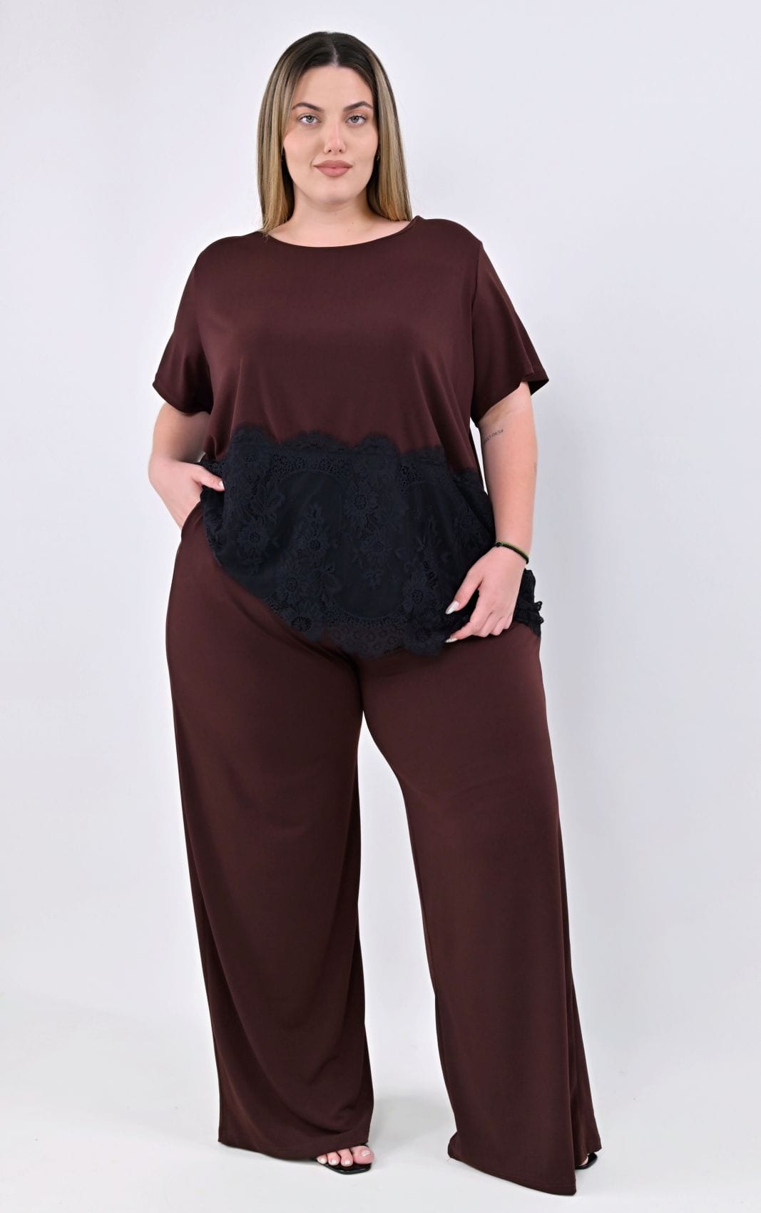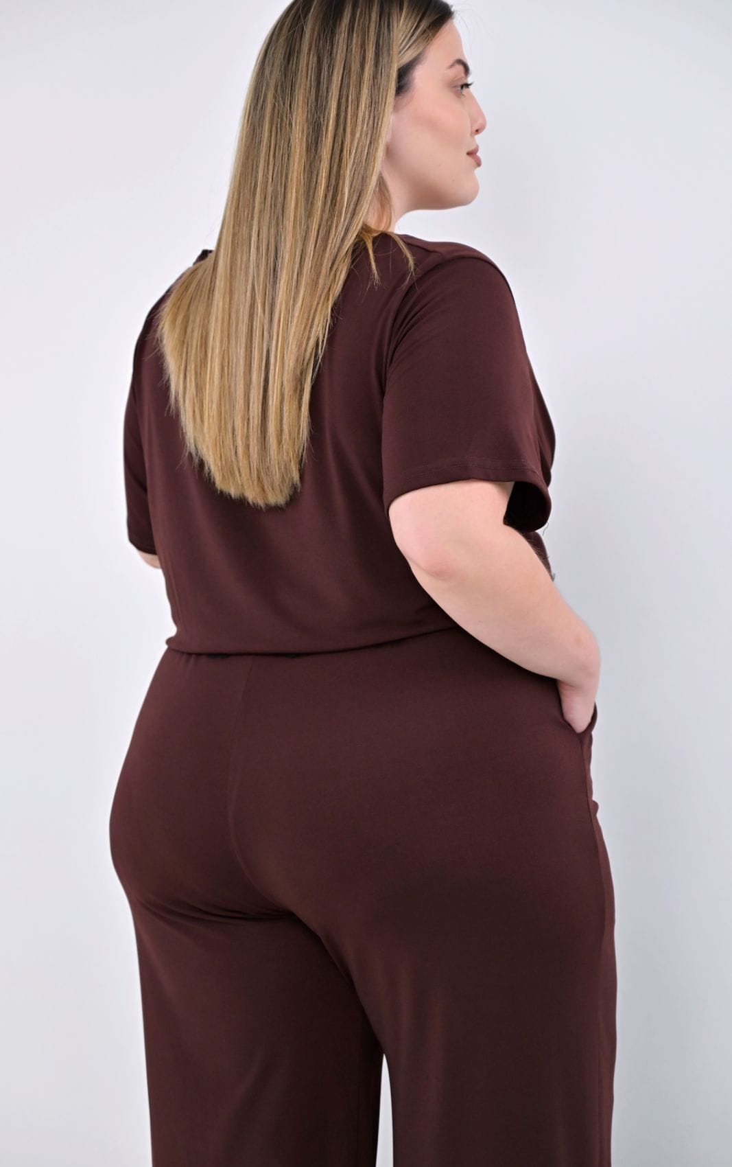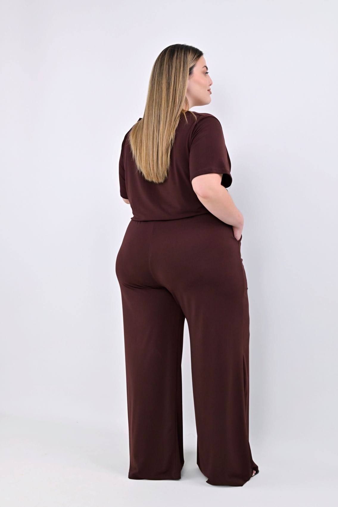Η Plus Size Παντελόνα Καφέ Wide Leg συνδυάζει κομψή γραμμή και έξτρα άνεση, με φαρδιά «palazzo» γραμμή που πέφτει ελεύθερα από τη μέση μέχρι το έδαφος. Το ελαστικό ύφασμα jersey με μικρό ποσοστό ελαστάνης εγγυάται άνετη εφαρμογή και ελευθερία κινήσεων.
