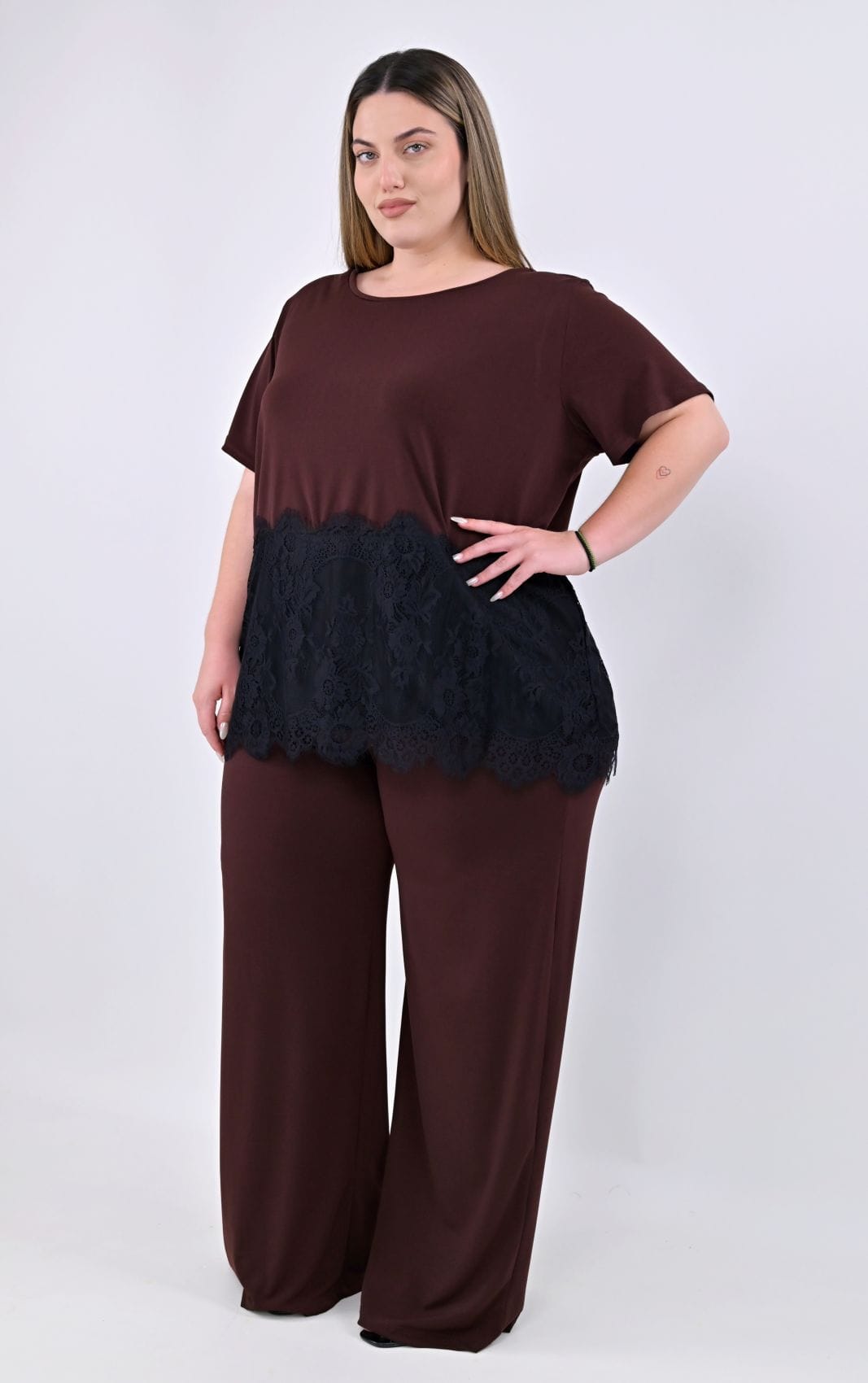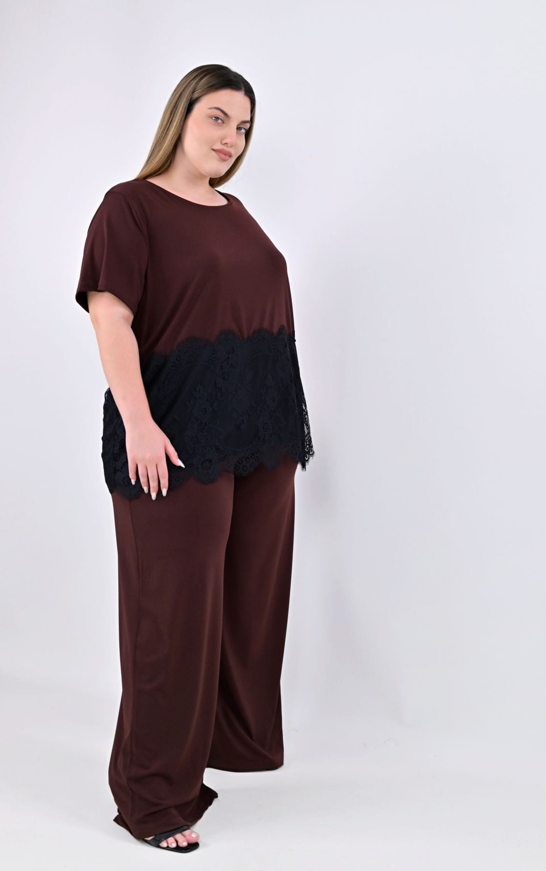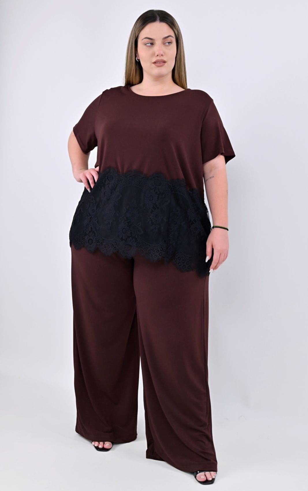 Η Plus Size Παντελόνα Καφέ Wide Leg συνδυάζει κομψή γραμμή και έξτρα άνεση, με φαρδιά «palazzo» γραμμή που πέφτει ελεύθερα από τη μέση μέχρι το έδαφος. Το ελαστικό ύφασμα jersey με μικρό ποσοστό ελαστάνης εγγυάται άνετη εφαρμογή και ελευθερία κινήσεων.