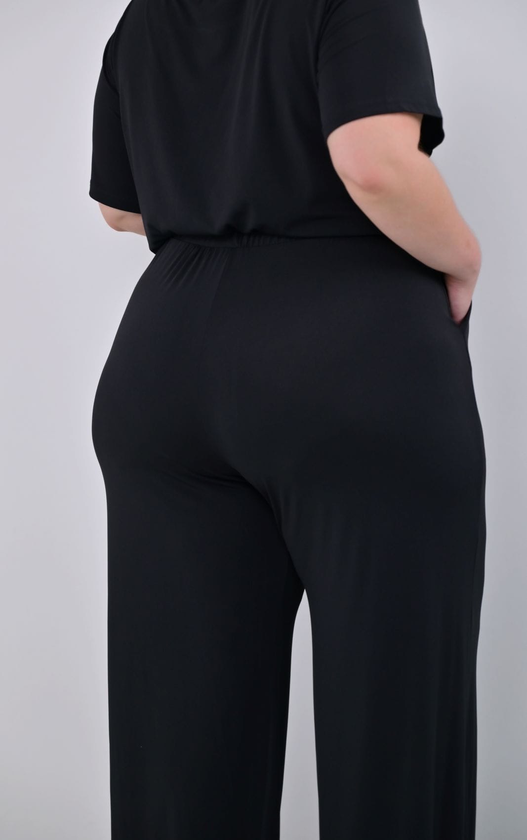 Η Plus Size Παντελόνα Μαύρη Wide Leg συνδυάζει κομψή γραμμή και έξτρα άνεση, με φαρδιά «palazzo» γραμμή που πέφτει ελεύθερα από τη μέση μέχρι το έδαφος. Το ελαστικό ύφασμα jersey με μικρό ποσοστό ελαστάνης εγγυάται άνετη εφαρμογή και ελευθερία κινήσεων.