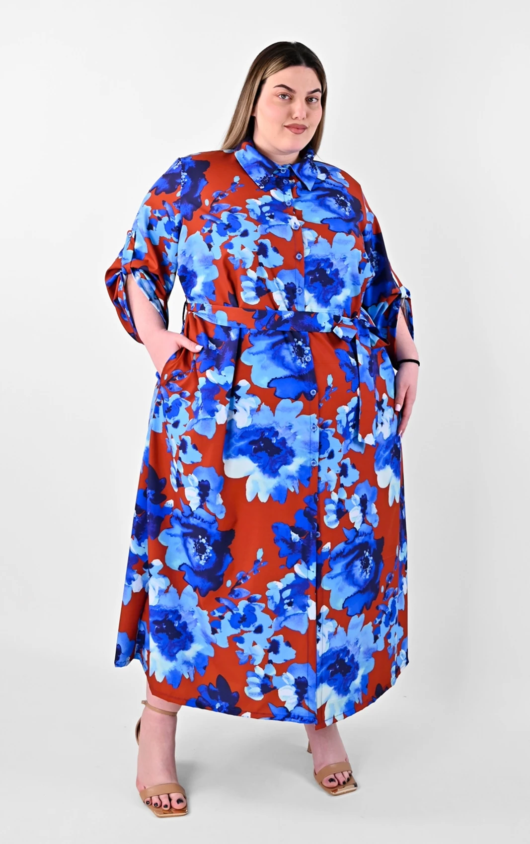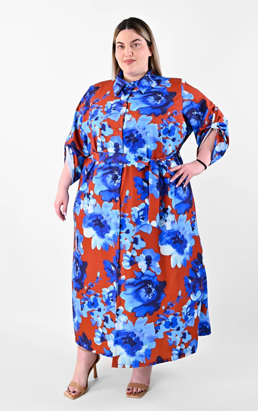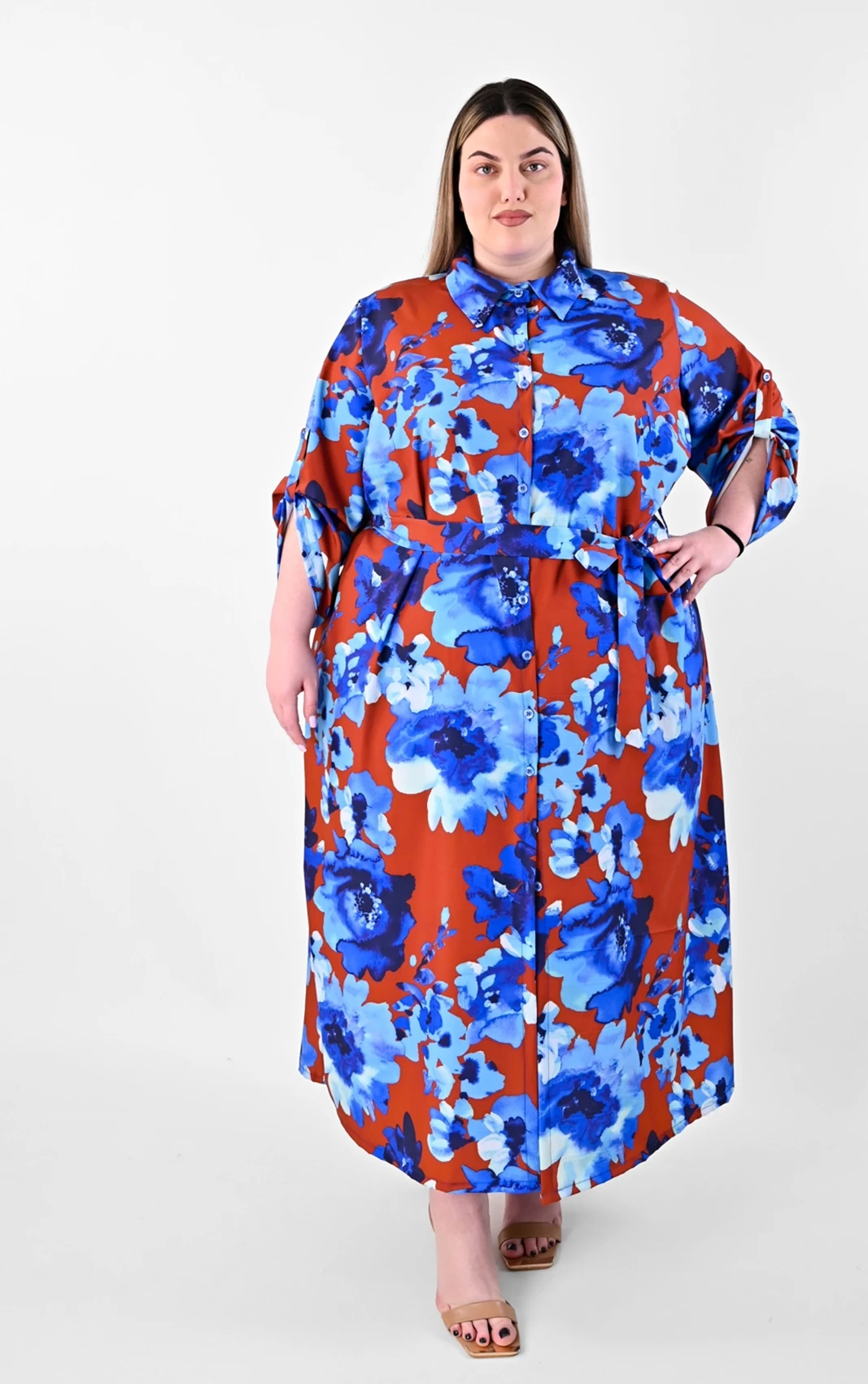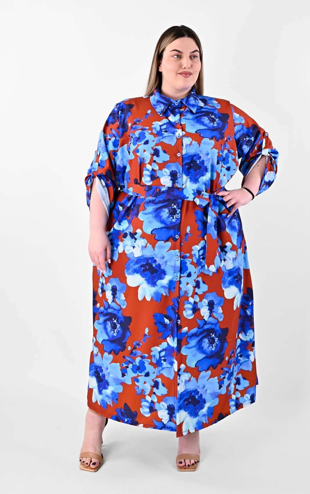 Αυτό το πουκαμισοφόρεμα αποτελεί μια από τις πιο καλόγουστες επιλογές για τη νέα σεζόν. Ο συνδυασμός του καφέ φόντου με τα μεγάλα μπλε λουλούδια δημιουργεί μια αισθητική που είναι ταυτόχρονα μοντέρνα και διαχρονική, προσφέροντας την άνεση που χρειάζεστε χωρίς να θυσιάζετε το προσωπικό σας γούστο.