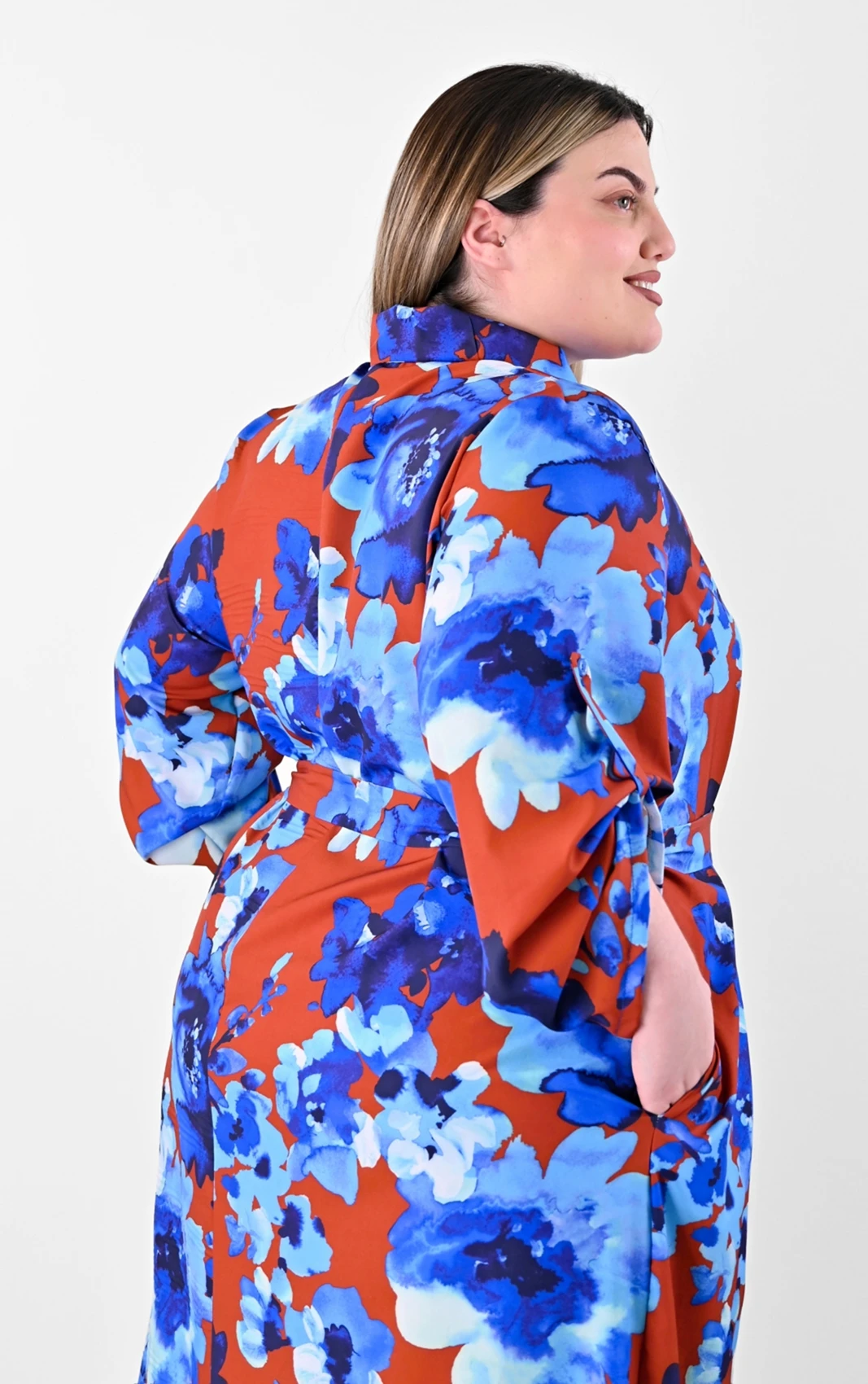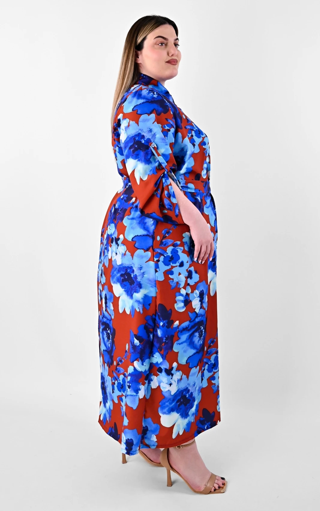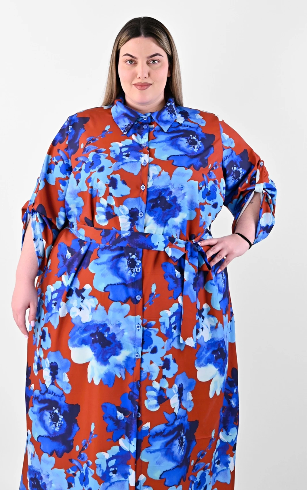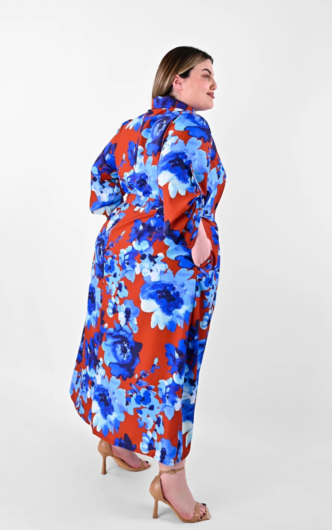Αυτό το πουκαμισοφόρεμα αποτελεί μια από τις πιο καλόγουστες επιλογές για τη νέα σεζόν. Ο συνδυασμός του καφέ φόντου με τα μεγάλα μπλε λουλούδια δημιουργεί μια αισθητική που είναι ταυτόχρονα μοντέρνα και διαχρονική, προσφέροντας την άνεση που χρειάζεστε χωρίς να θυσιάζετε το προσωπικό σας γούστο.
