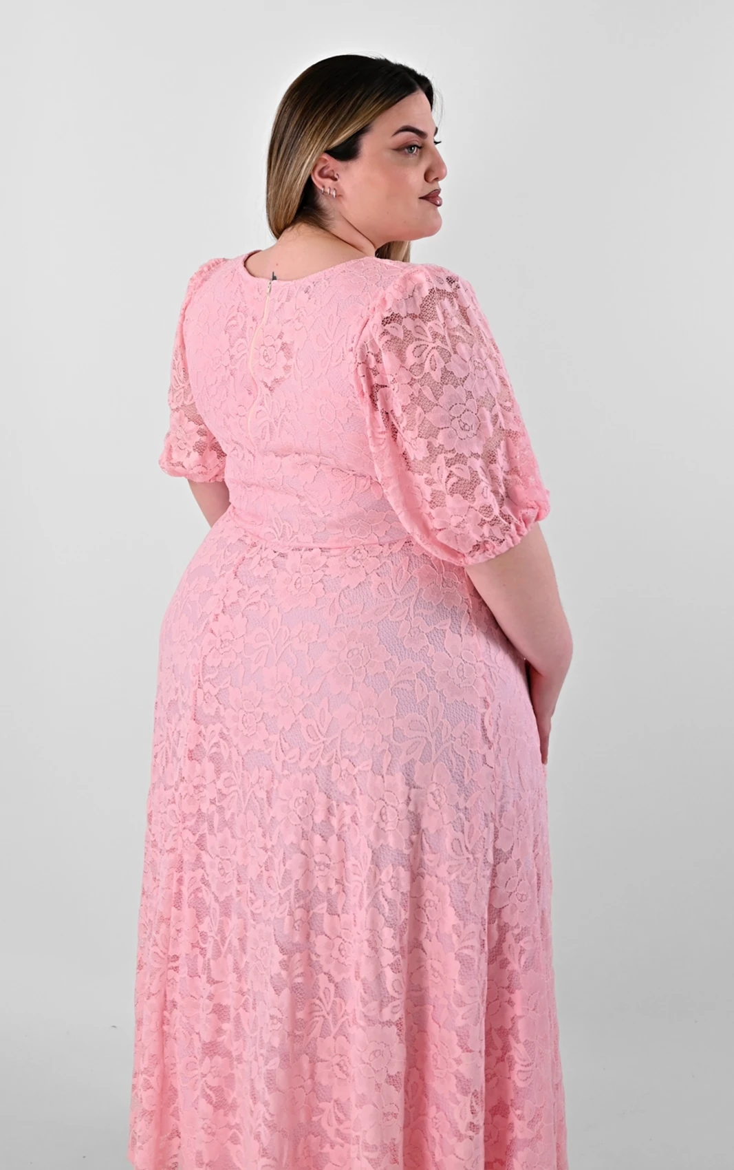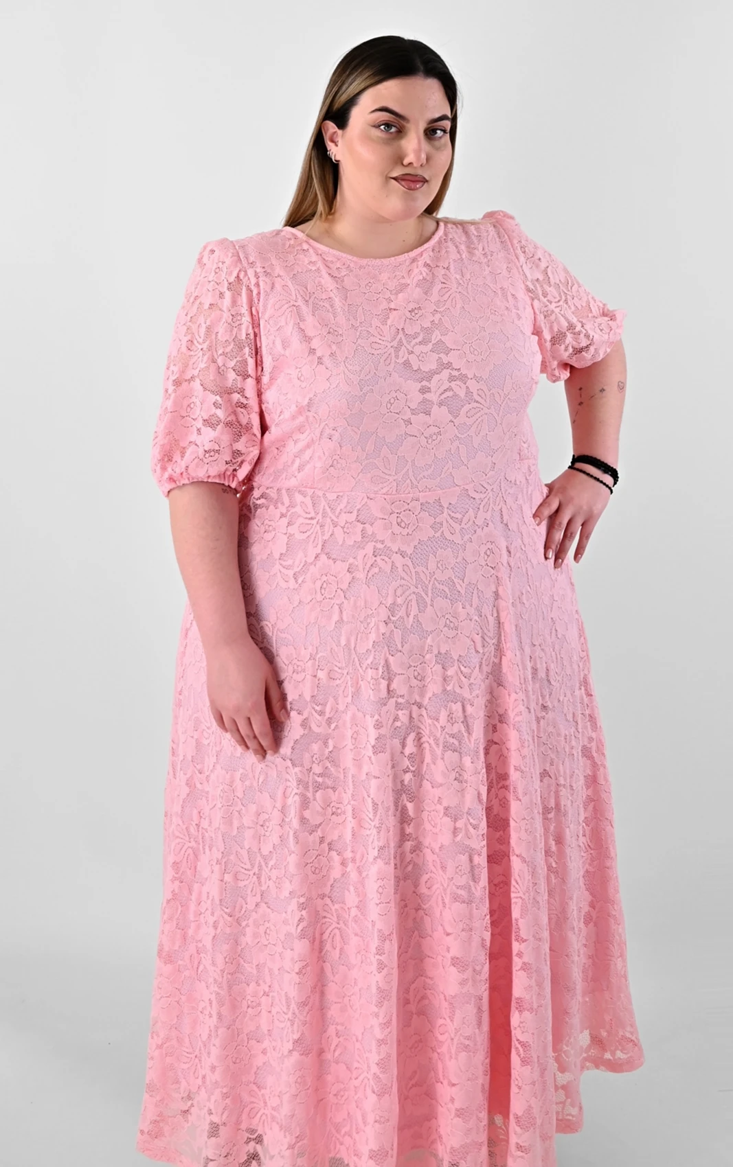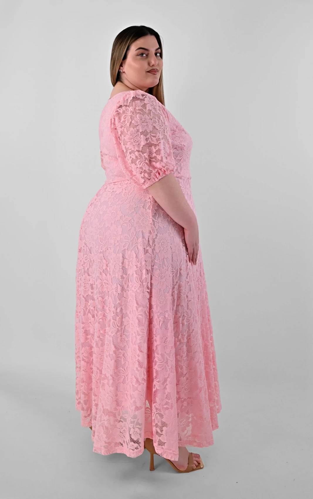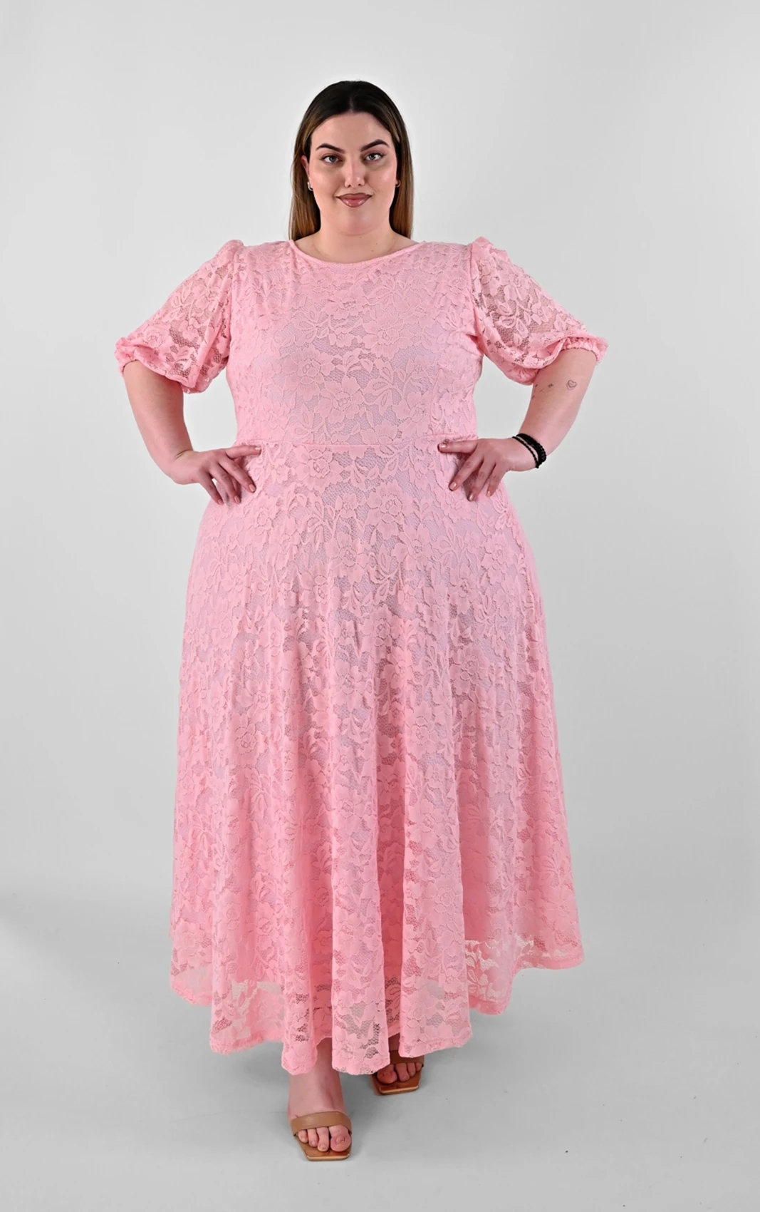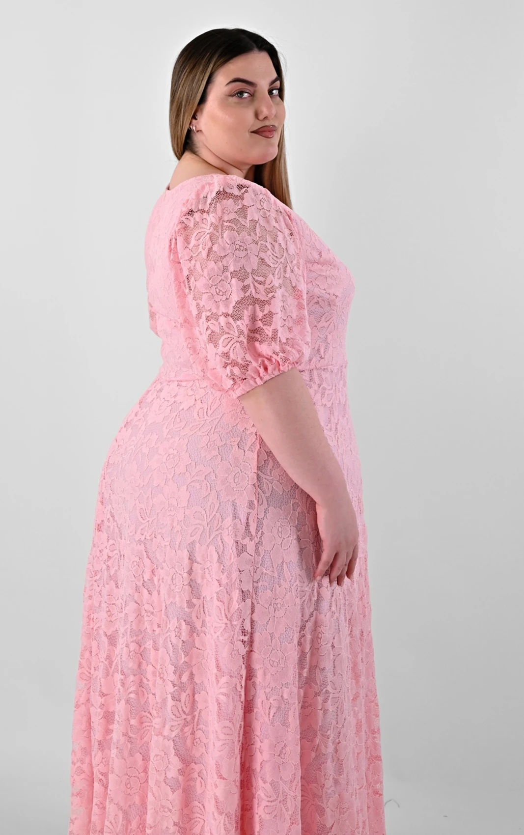 Ανακαλύψτε ένα απόλυτα θηλυκό και ρομαντικό κομμάτι που θα κλέψει τις εντυπώσεις. Αυτό το Plus size maxi φόρεμα σε απαλό ροζ χρώμα είναι φτιαγμένο από δαντέλα με ανάγλυφα σχέδια, προσφέροντας ένα καλόγουστο και εντυπωσιακό αποτέλεσμα.