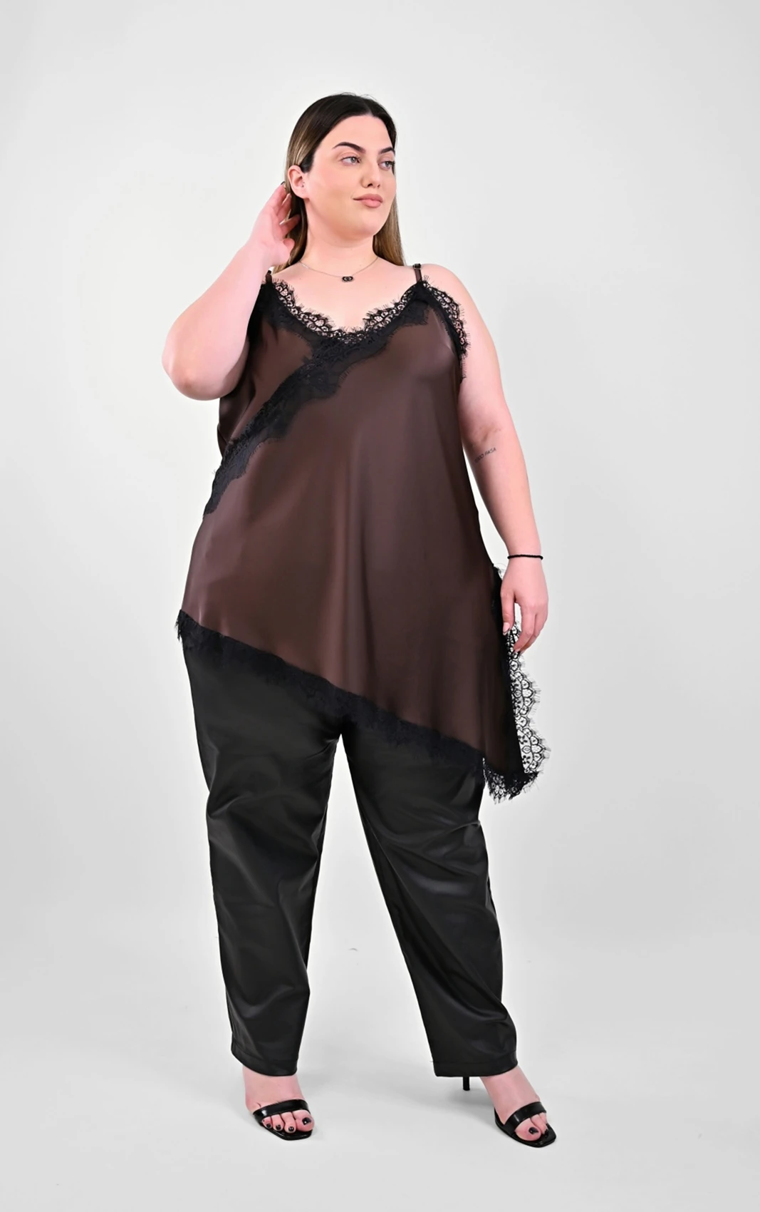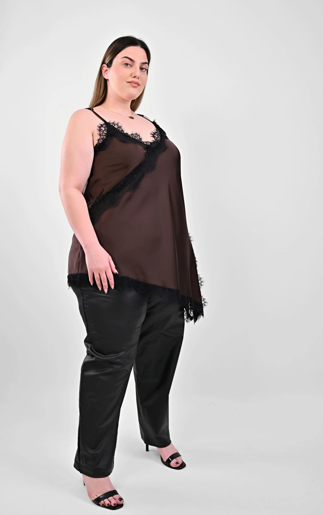 Ένα μοντέρνο και καλαίσθητο plus size τοπ που θα γίνει το αγαπημένο σας. Αυτό το τοπ ξεχωρίζει για τον στυλάτο σχεδιασμό του, συνδυάζοντας την απαλή, ποιοτική αίσθηση του σατέν υφάσματος με περίτεχνες λεπτομέρειες από μαύρη δαντέλα.
