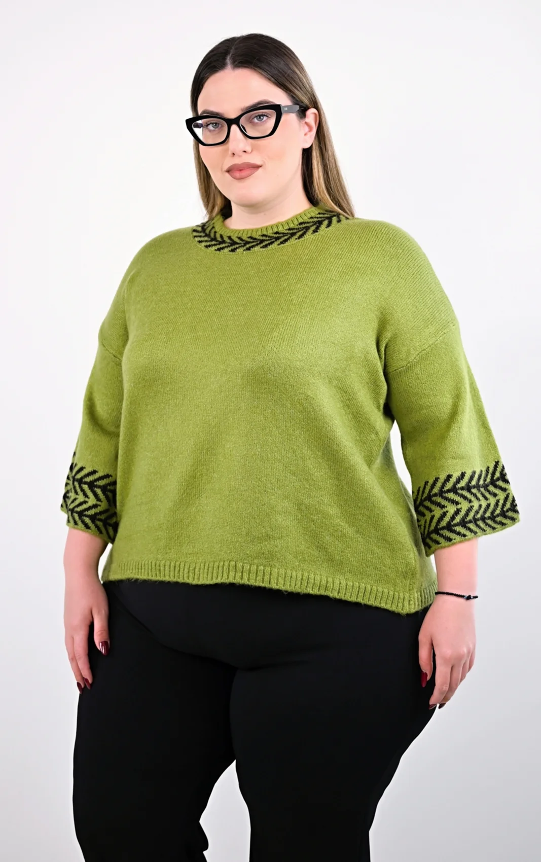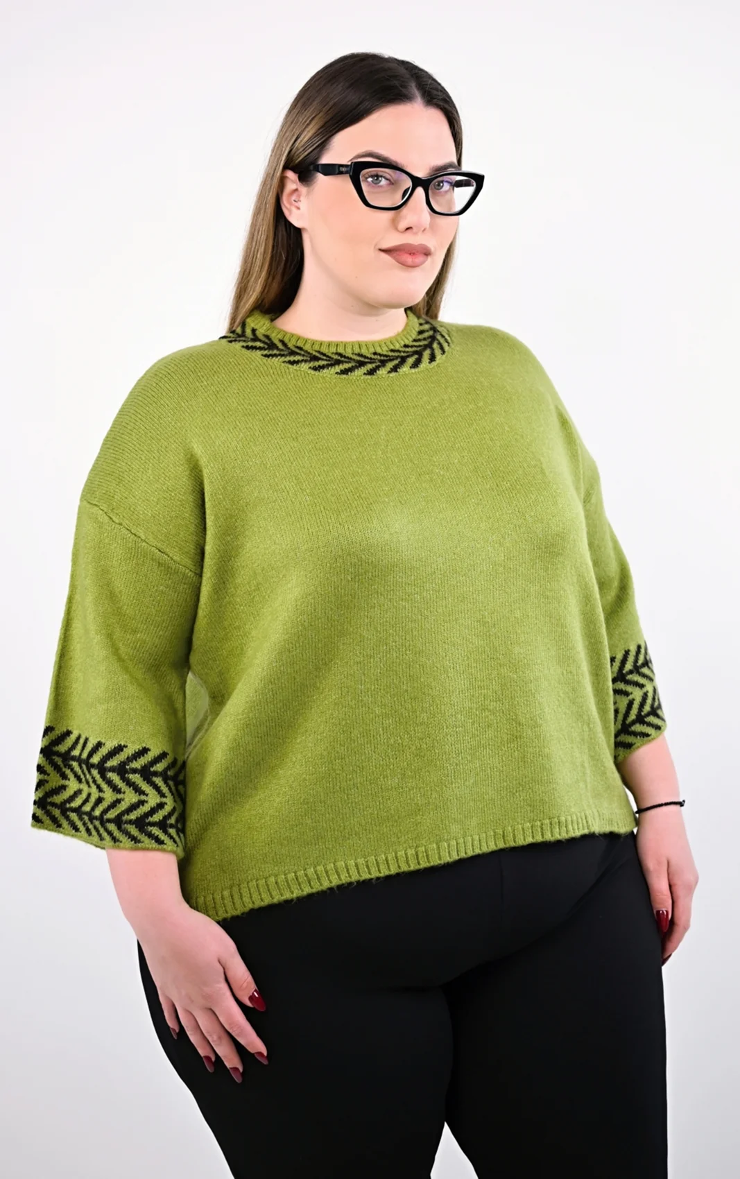 • Μανίκια: Μανίκια 3/4 με φαρδιά, διακοσμητική μανσέτα που φέρει το ίδιο μαύρο πλεκτό σχέδιο.