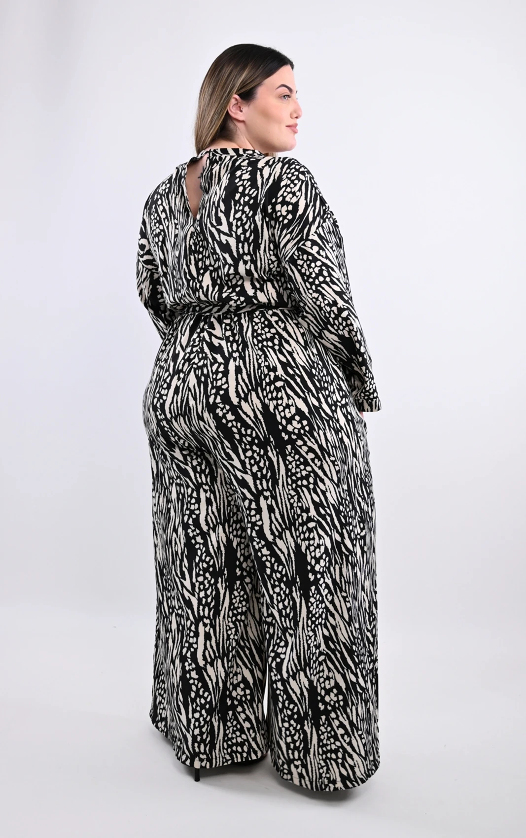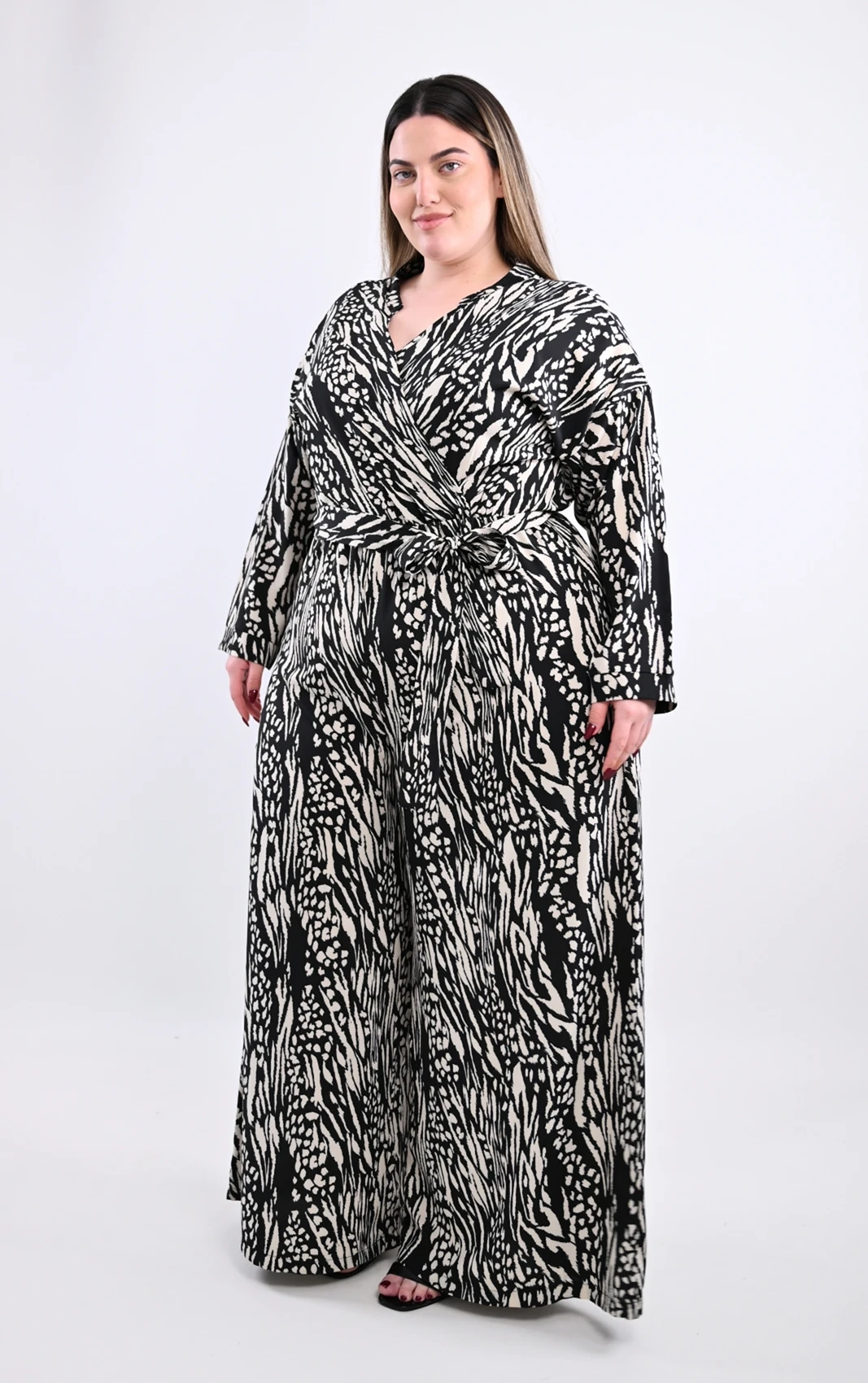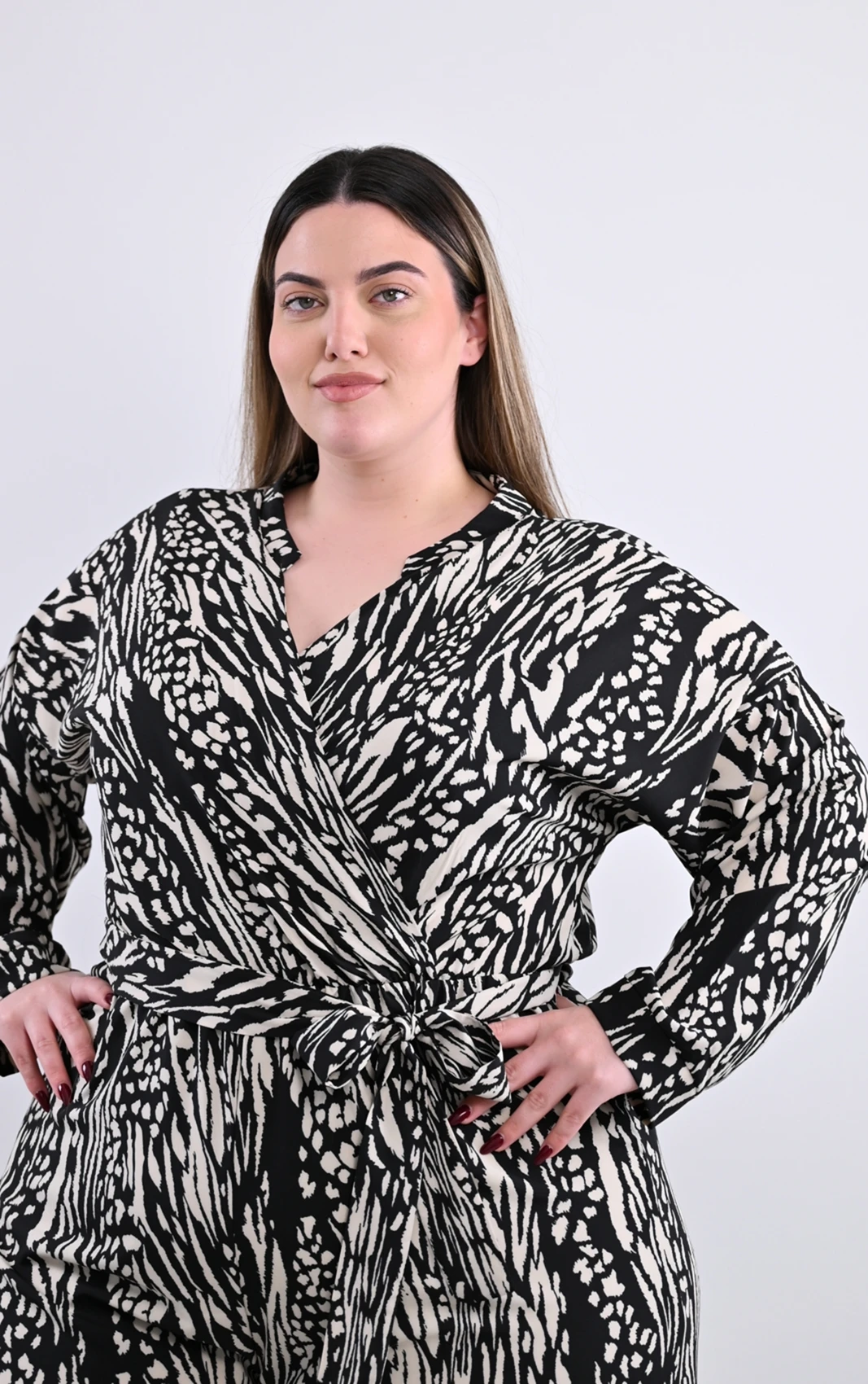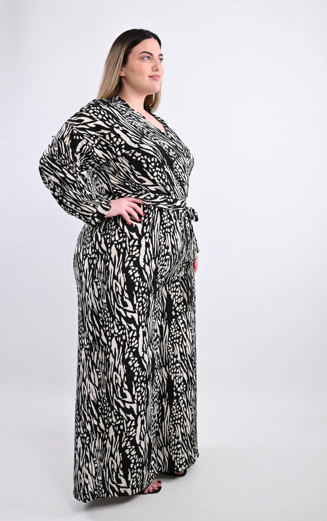 Αναδείξτε την πιο δυναμική και στυλάτη πλευρά σας με αυτή την εντυπωσιακή ολόσωμη φόρμα. Σχεδιασμένη για να προσφέρει άνεση και ένα σύγχρονο look, αυτό το κομμάτι είναι ιδανικό για plus size σιλουέτες που θέλουν να ξεχωρίζουν. Το έντονο zebra print, σε μια καλόγουστη αντίθεση μαύρου και μπεζ, δημιουργεί ένα αποτέλεσμα που μαγνητίζει τα βλέμματα.