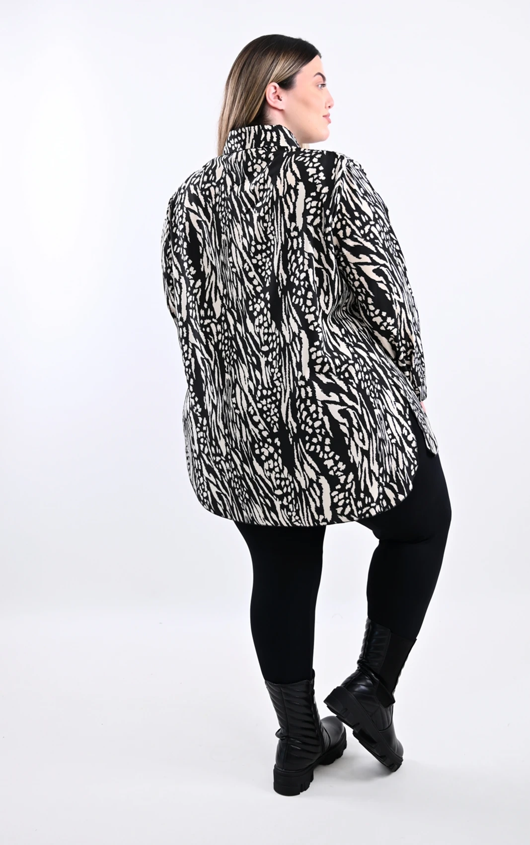 Κάντε μια δυναμική και στυλάτη εμφάνιση με αυτή τη μοντέρνα πουκαμίσα. Σχεδιασμένη για να προσφέρει άνεση και ένα σύγχρονο look, αυτό το κομμάτι θα γίνει αναπόσπαστο μέρος της γκαρνταρόμπας σας. Το εντυπωσιακό zebra print, σε μια καλόγουστη αντίθεση μαύρου και μπεζ, προσδίδει έναν αέρα αυτοπεποίθησης, ενώ παραμένει εξαιρετικά ευέλικτο στους συνδυασμούς.