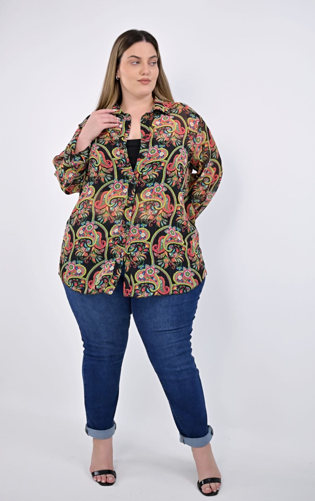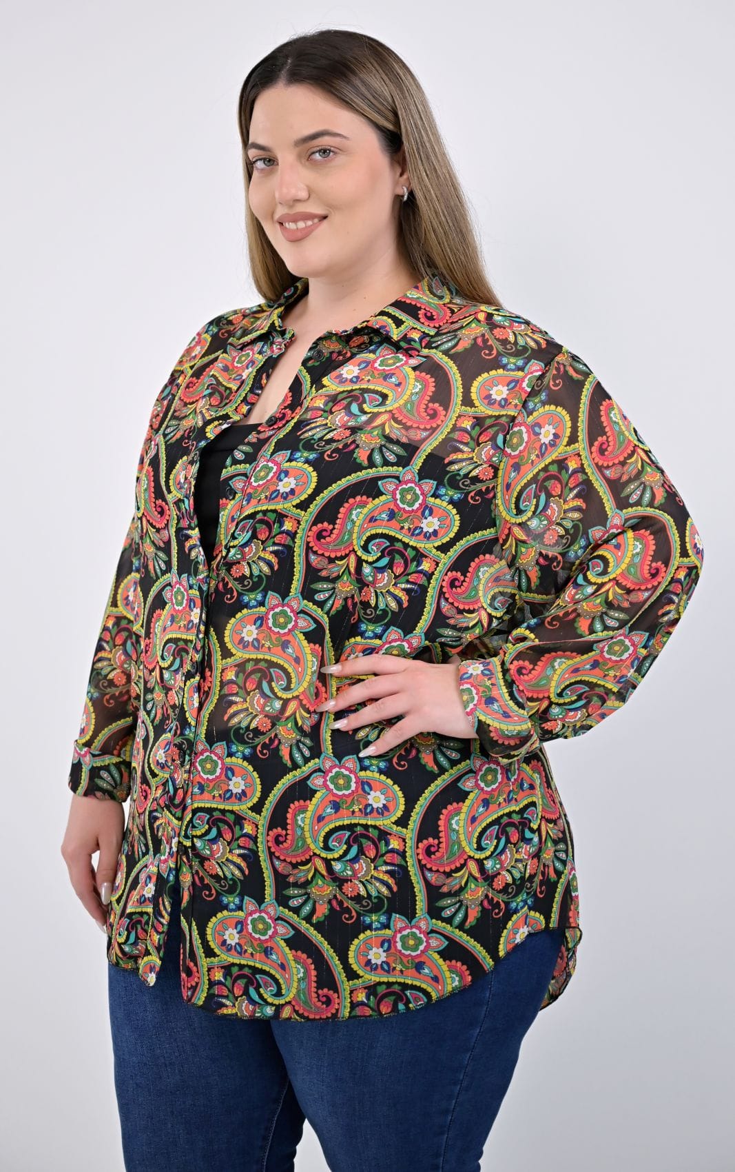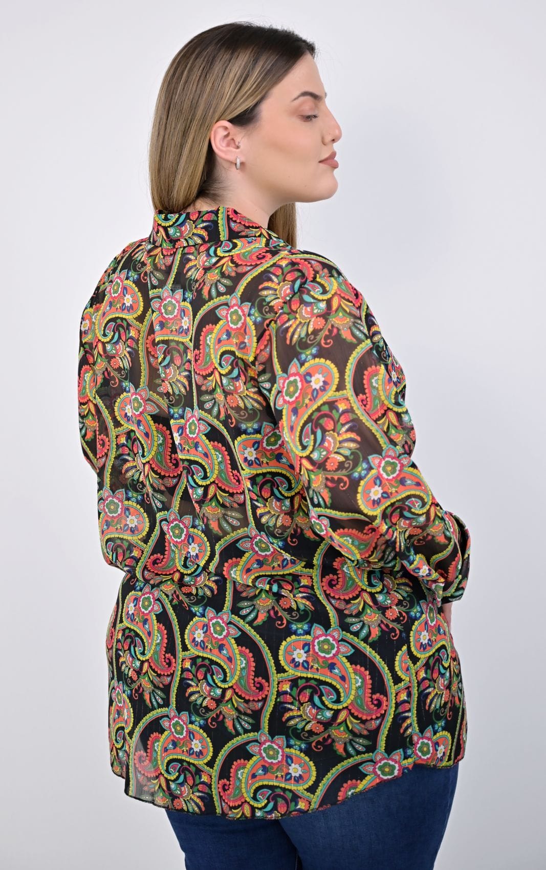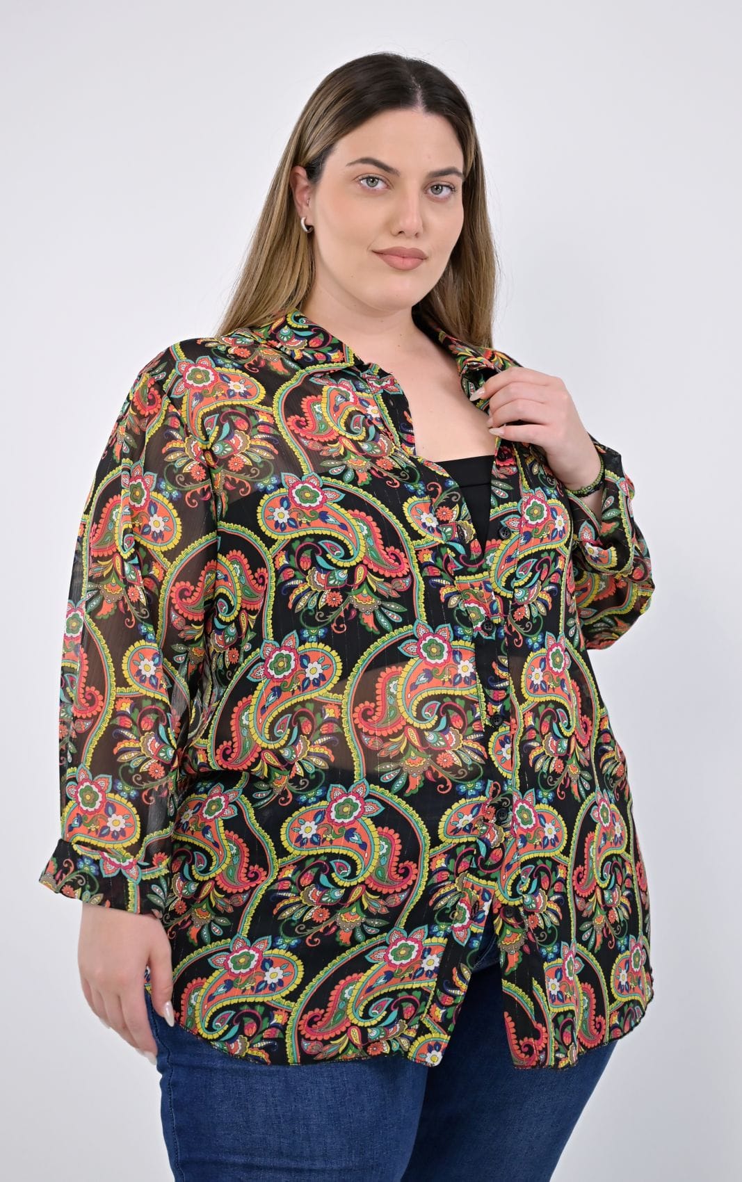 Το μακρύ μανίκι καταλήγει σε μανσέτα με δύο κουμπιά, προσθέτοντας μια κομψή και λειτουργική λεπτομέρεια. Αυτό το πουκάμισο είναι ιδανικό για καθημερινές αλλά και πιο επίσημες περιστάσεις, προσφέροντας στυλ και άνεση σε κάθε εμφάνιση. Plus size πουκάμισο ζορζέτα με χρυσοκλωστή