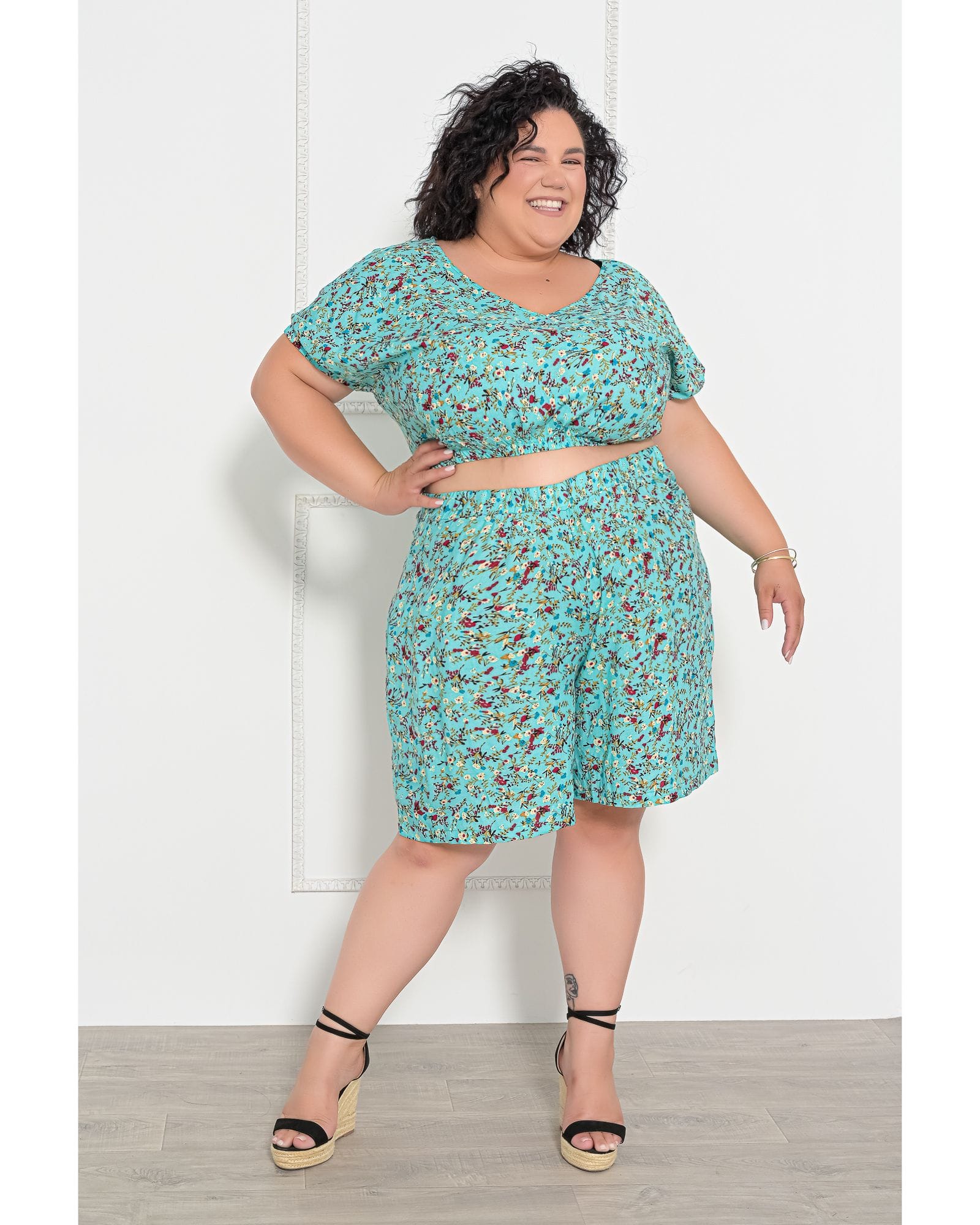 Φέρτε την αύρα του καλοκαιριού στην γκαρνταρόμπα σας με αυτό το υπέροχο plus size τιρκουάζ floral σορτσάκι. Το εξωτικό μοτίβο με τα λουλούδια πάνω στη δροσερή τιρκουάζ βάση το καθιστά το απόλυτο κομμάτι για τις ζεστές ημέρες και τις διακοπές.